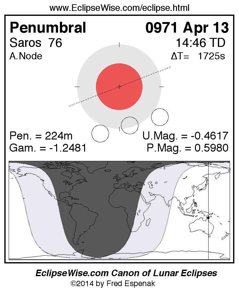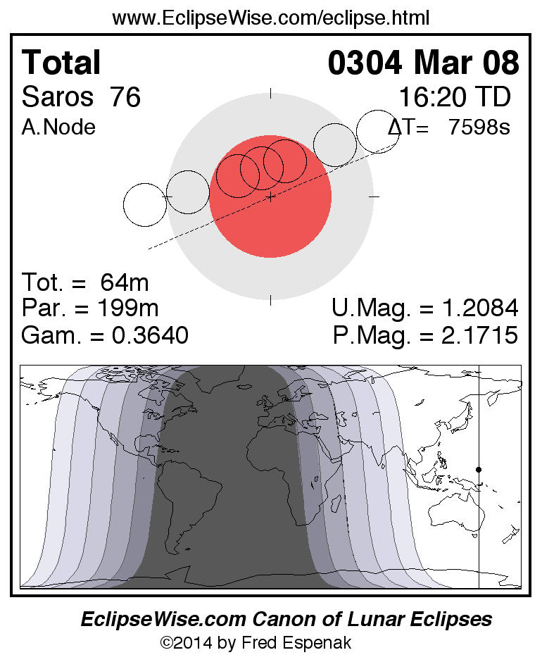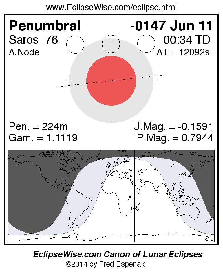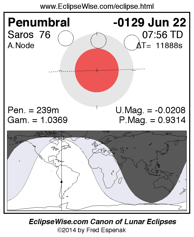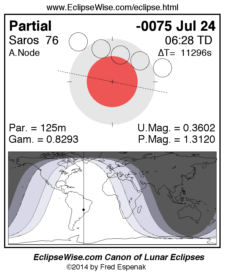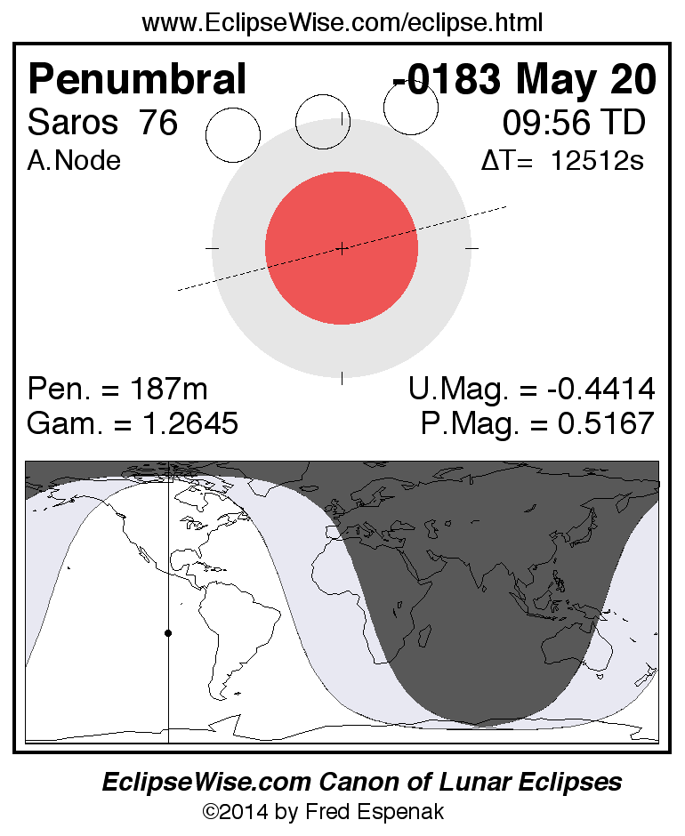 A panorama of all lunar eclipses belonging to Saros 76 is presented here. Each figure shows the Moon's path with respect to Earth's penumbral and umbral shadows. Below the path is a map depicting the geographic region of visibility for the eclipse. The date and time are given for the instant of Greatest Eclipse. Every figure serves as a hyperlink to the EclipseWise Prime page for that eclipse with a larger figure and complete details for the eclipse. Visit the Key to Lunar Eclipse Figures for a detailed explanation of these diagrams. Near the bottom of this page are a series of hyperlinks for more on lunar eclipses.