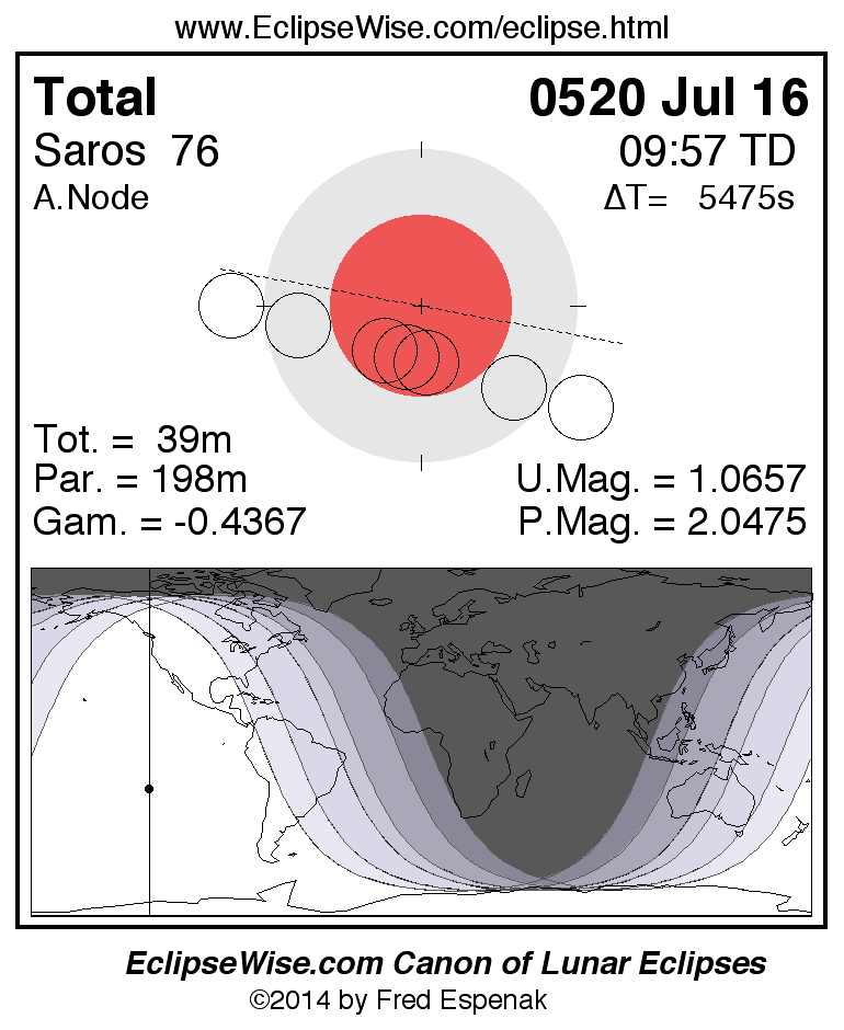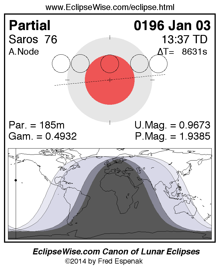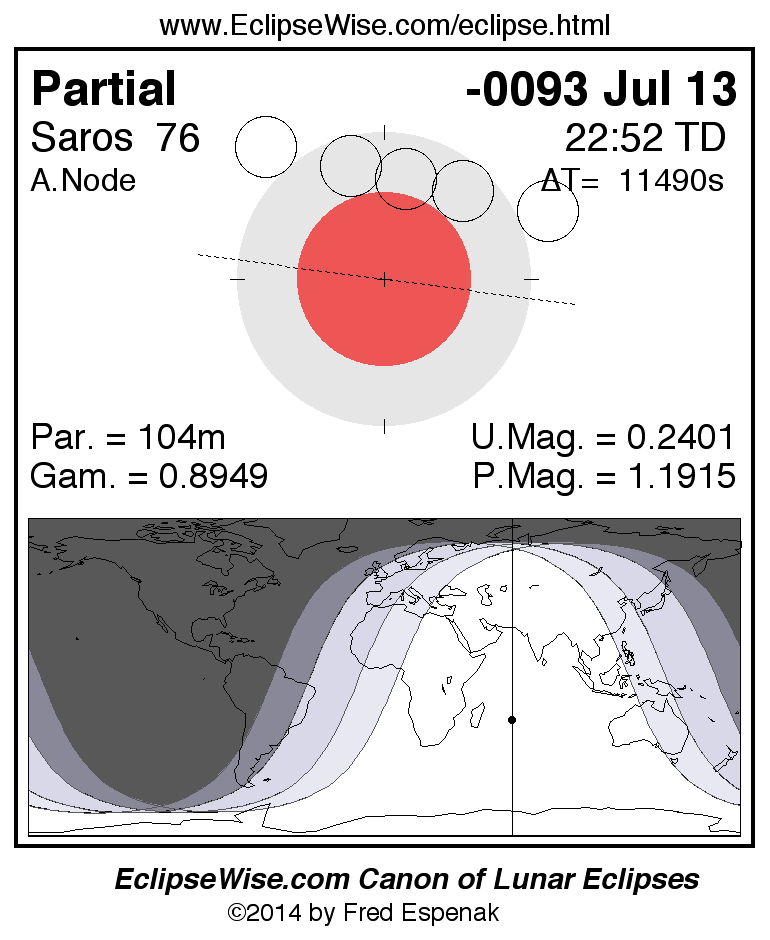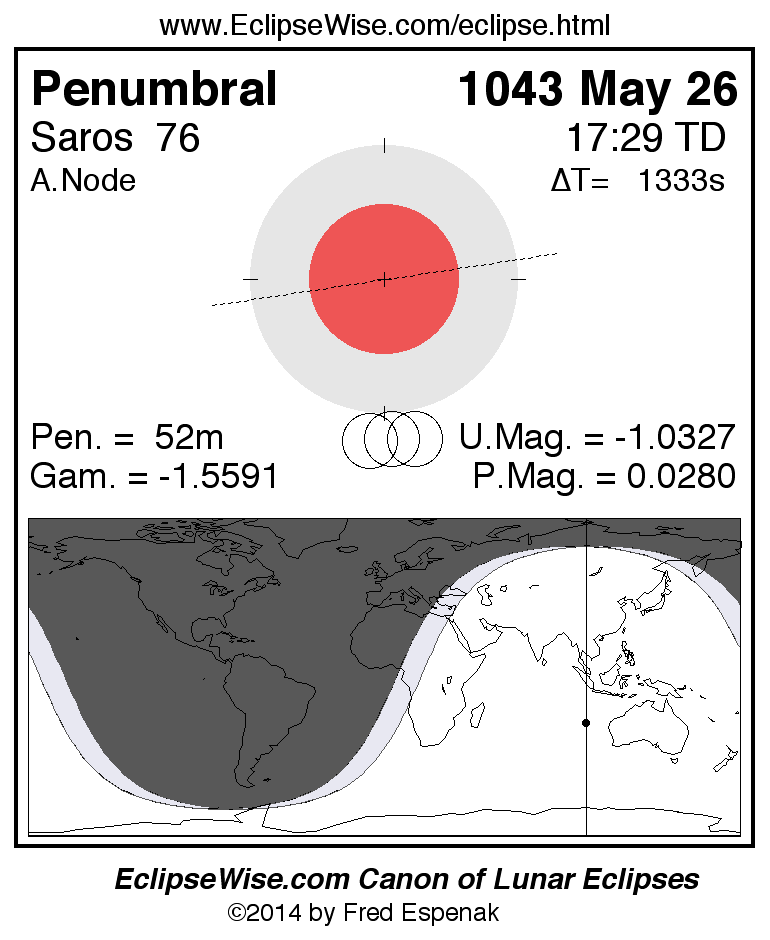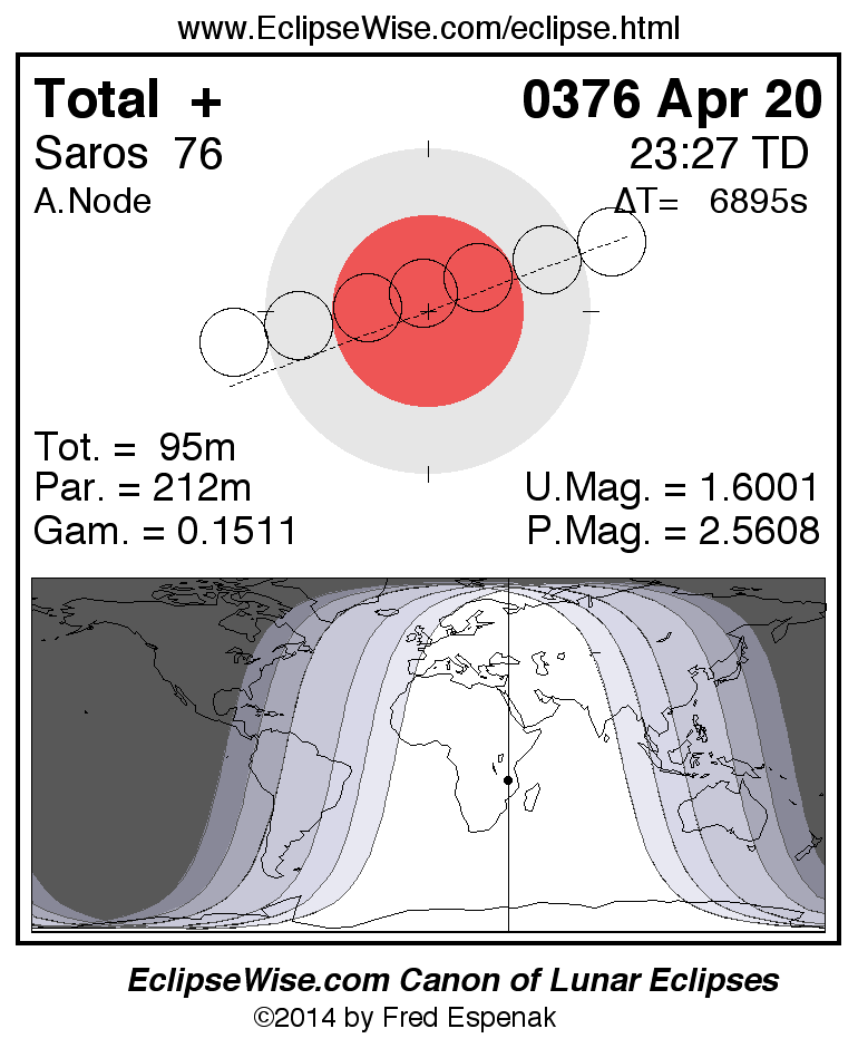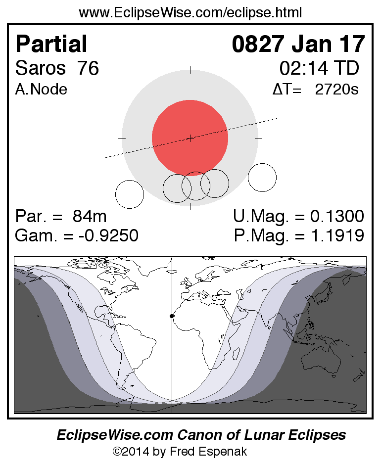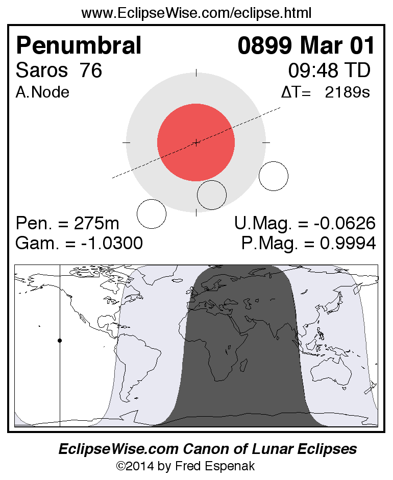 A panorama of all lunar eclipses belonging to Saros 76 is presented here. Each figure shows the Moon's path with respect to Earth's penumbral and umbral shadows. Below the path is a map depicting the geographic region of visibility for the eclipse. The date and time are given for the instant of Greatest Eclipse. Every figure serves as a hyperlink to the EclipseWise Prime page for that eclipse with a larger figure and complete details for the eclipse. Visit the Key to Lunar Eclipse Figures for a detailed explanation of these diagrams. Near the bottom of this page are a series of hyperlinks for more on lunar eclipses.