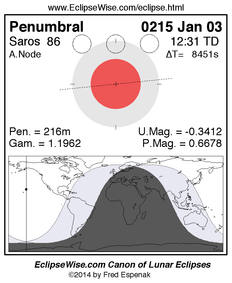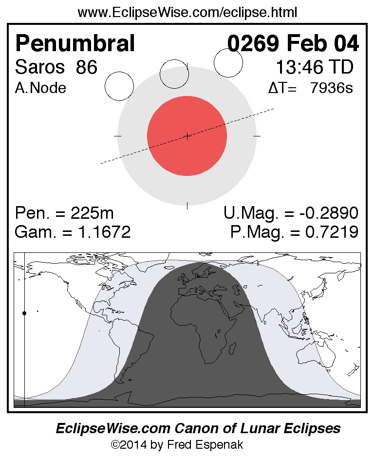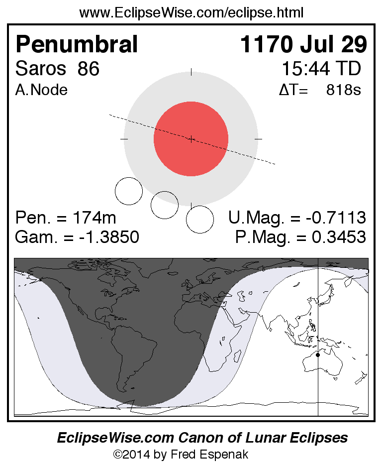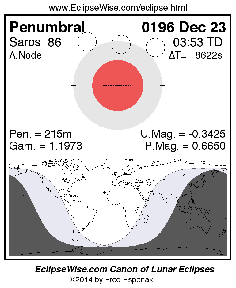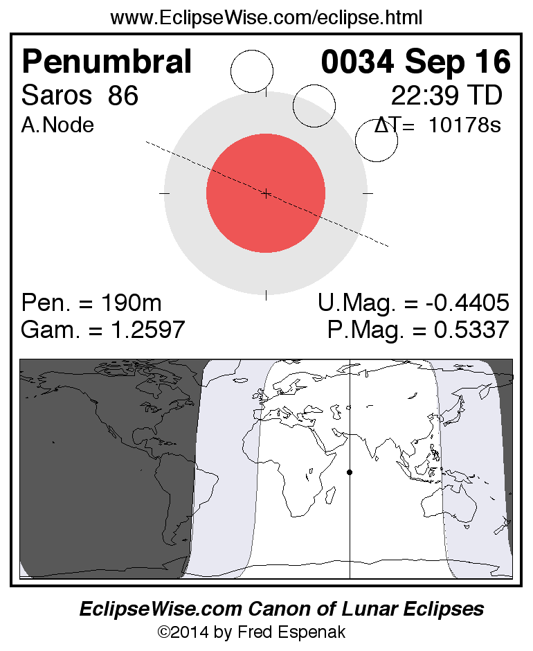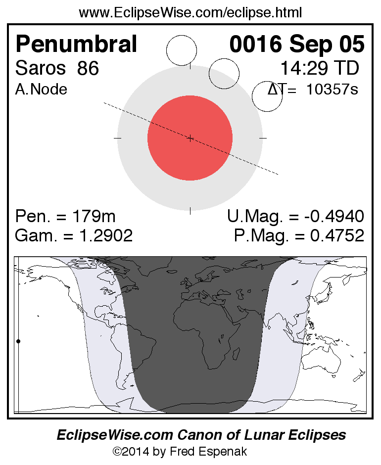 A panorama of all lunar eclipses belonging to Saros 86 is presented here. Each figure shows the Moon's path with respect to Earth's penumbral and umbral shadows. Below the path is a map depicting the geographic region of visibility for the eclipse. The date and time are given for the instant of Greatest Eclipse. Every figure serves as a hyperlink to the EclipseWise Prime page for that eclipse with a larger figure and complete details for the eclipse. Visit the Key to Lunar Eclipse Figures for a detailed explanation of these diagrams. Near the bottom of this page are a series of hyperlinks for more on lunar eclipses.