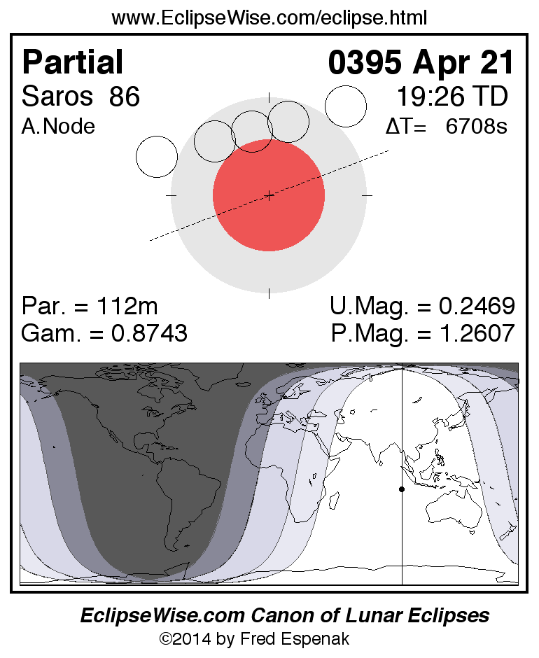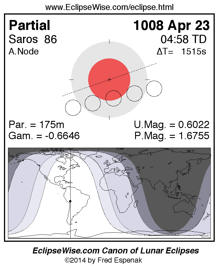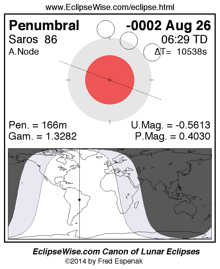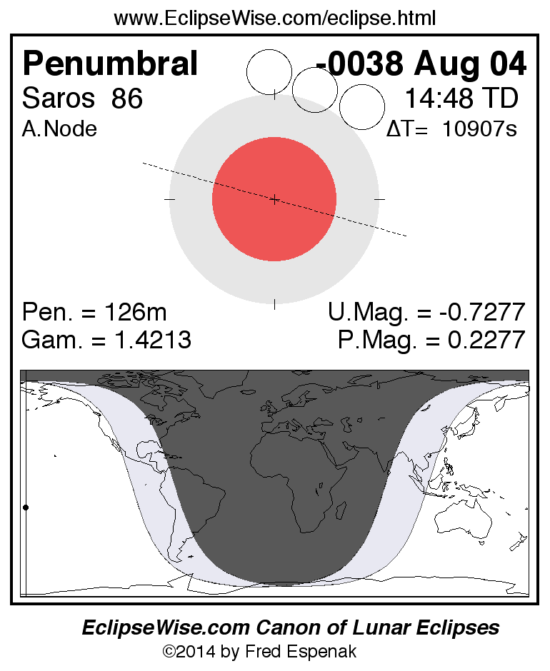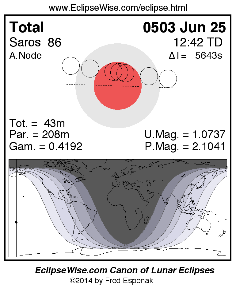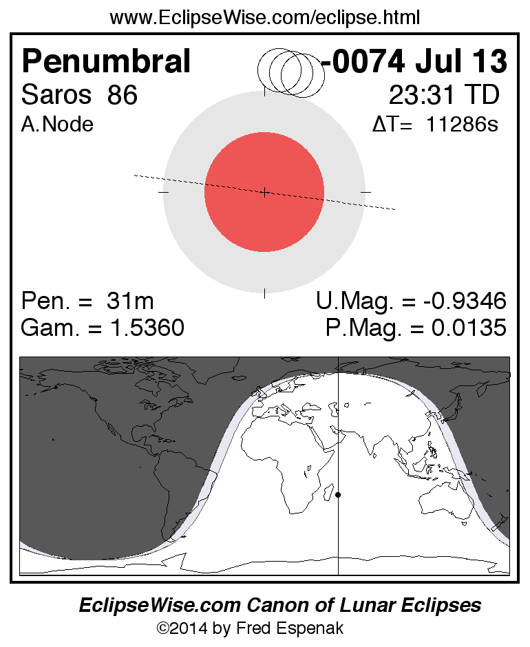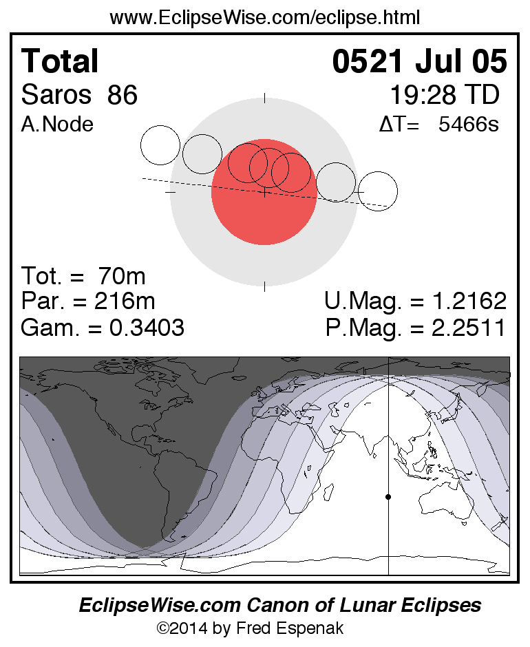 A panorama of all lunar eclipses belonging to Saros 86 is presented here. Each figure shows the Moon's path with respect to Earth's penumbral and umbral shadows. Below the path is a map depicting the geographic region of visibility for the eclipse. The date and time are given for the instant of Greatest Eclipse. Every figure serves as a hyperlink to the EclipseWise Prime page for that eclipse with a larger figure and complete details for the eclipse. Visit the Key to Lunar Eclipse Figures for a detailed explanation of these diagrams. Near the bottom of this page are a series of hyperlinks for more on lunar eclipses.