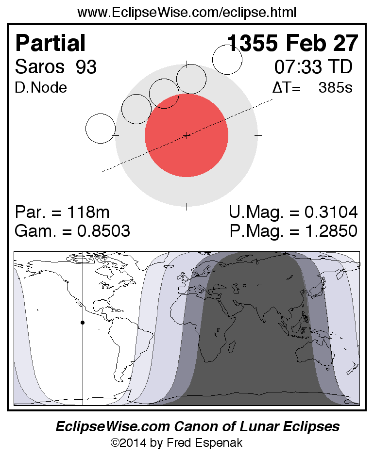 A panorama of all lunar eclipses belonging to Saros 93 is presented here. Each figure shows the Moon's path with respect to Earth's penumbral and umbral shadows. Below the path is a map depicting the geographic region of visibility for the eclipse. The date and time are given for the instant of Greatest Eclipse. Every figure serves as a hyperlink to the EclipseWise Prime page for that eclipse with a larger figure and complete details for the eclipse. Visit the Key to Lunar Eclipse Figures for a detailed explanation of these diagrams. Near the bottom of this page are a series of hyperlinks for more on lunar eclipses.