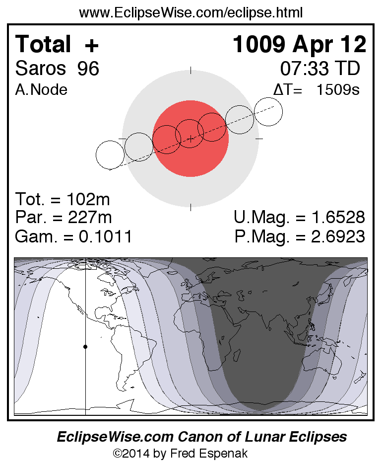 A panorama of all lunar eclipses belonging to Saros 96 is presented here. Each figure shows the Moon's path with respect to Earth's penumbral and umbral shadows. Below the path is a map depicting the geographic region of visibility for the eclipse. The date and time are given for the instant of Greatest Eclipse. Every figure serves as a hyperlink to the EclipseWise Prime page for that eclipse with a larger figure and complete details for the eclipse. Visit the Key to Lunar Eclipse Figures for a detailed explanation of these diagrams. Near the bottom of this page are a series of hyperlinks for more on lunar eclipses.