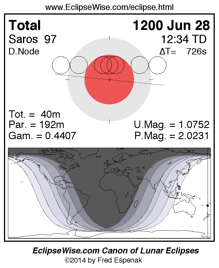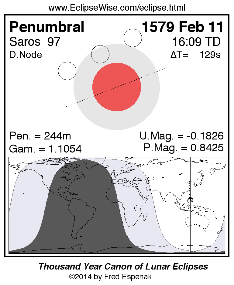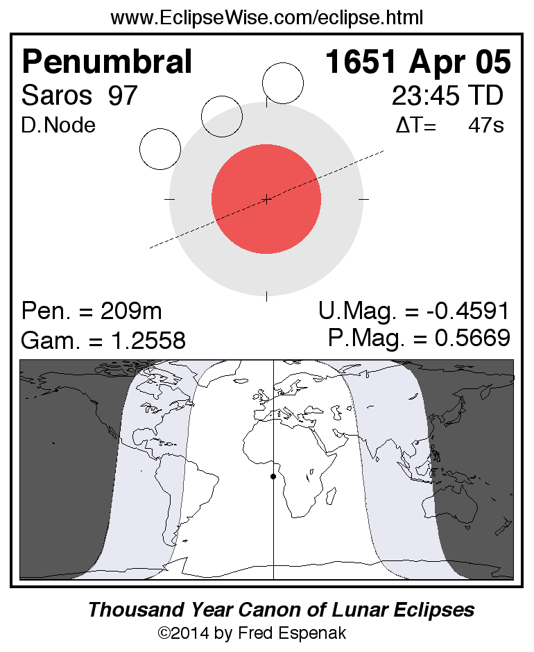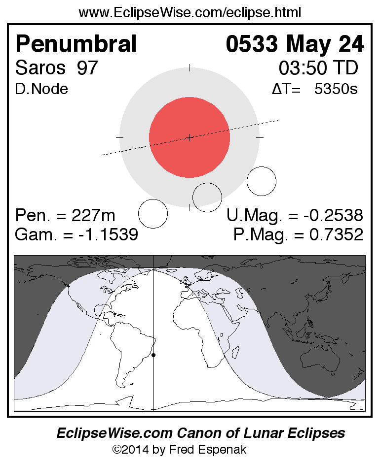 A panorama of all lunar eclipses belonging to Saros 97 is presented here. Each figure shows the Moon's path with respect to Earth's penumbral and umbral shadows. Below the path is a map depicting the geographic region of visibility for the eclipse. The date and time are given for the instant of Greatest Eclipse. Every figure serves as a hyperlink to the EclipseWise Prime page for that eclipse with a larger figure and complete details for the eclipse. Visit the Key to Lunar Eclipse Figures for a detailed explanation of these diagrams. Near the bottom of this page are a series of hyperlinks for more on lunar eclipses.