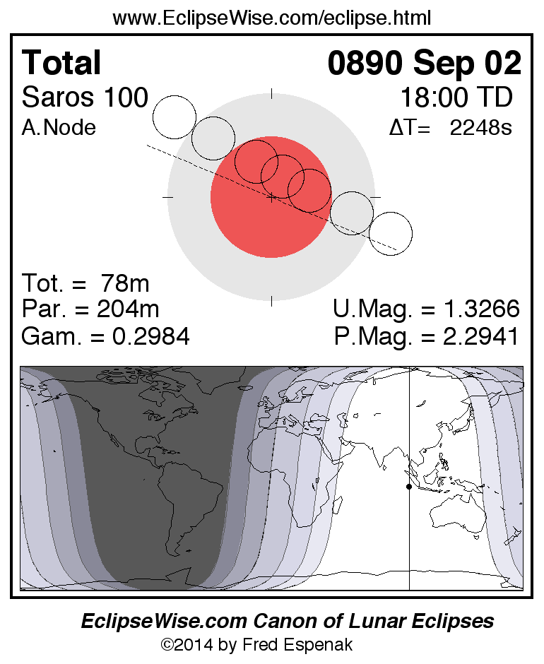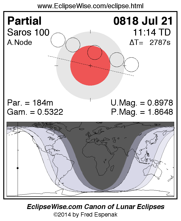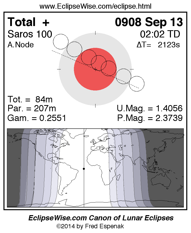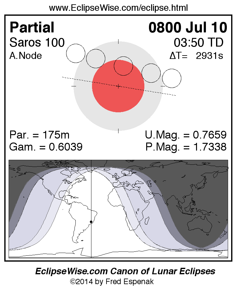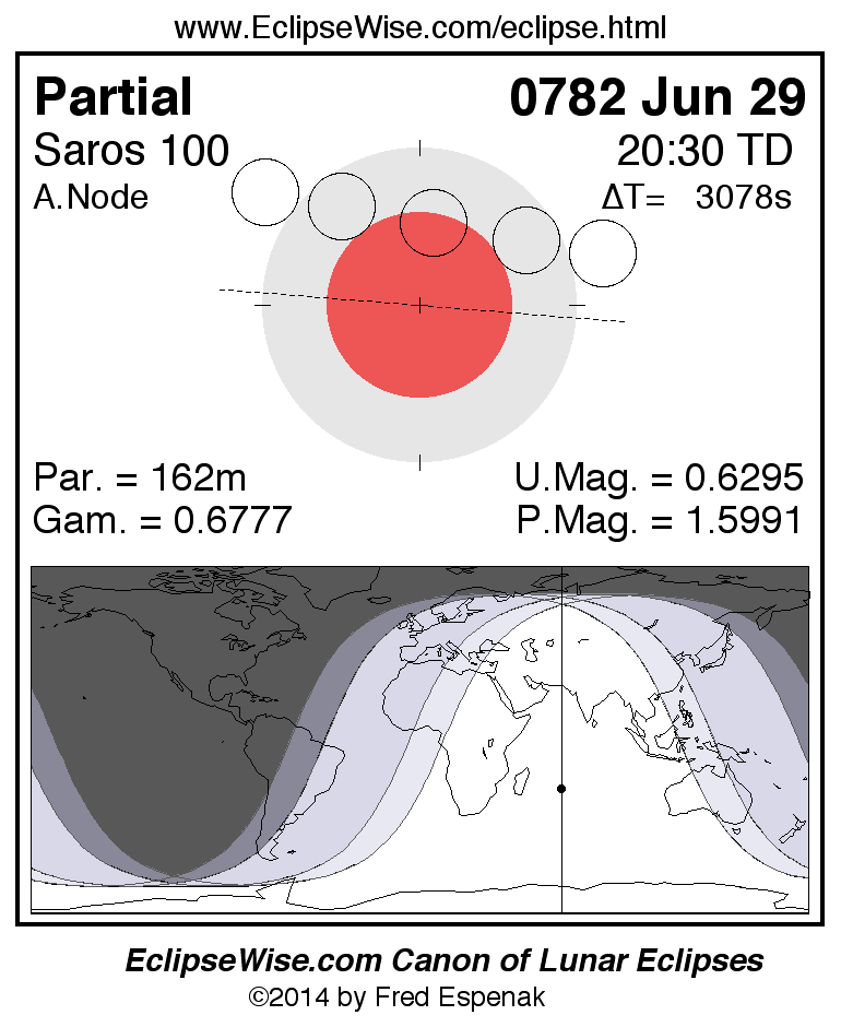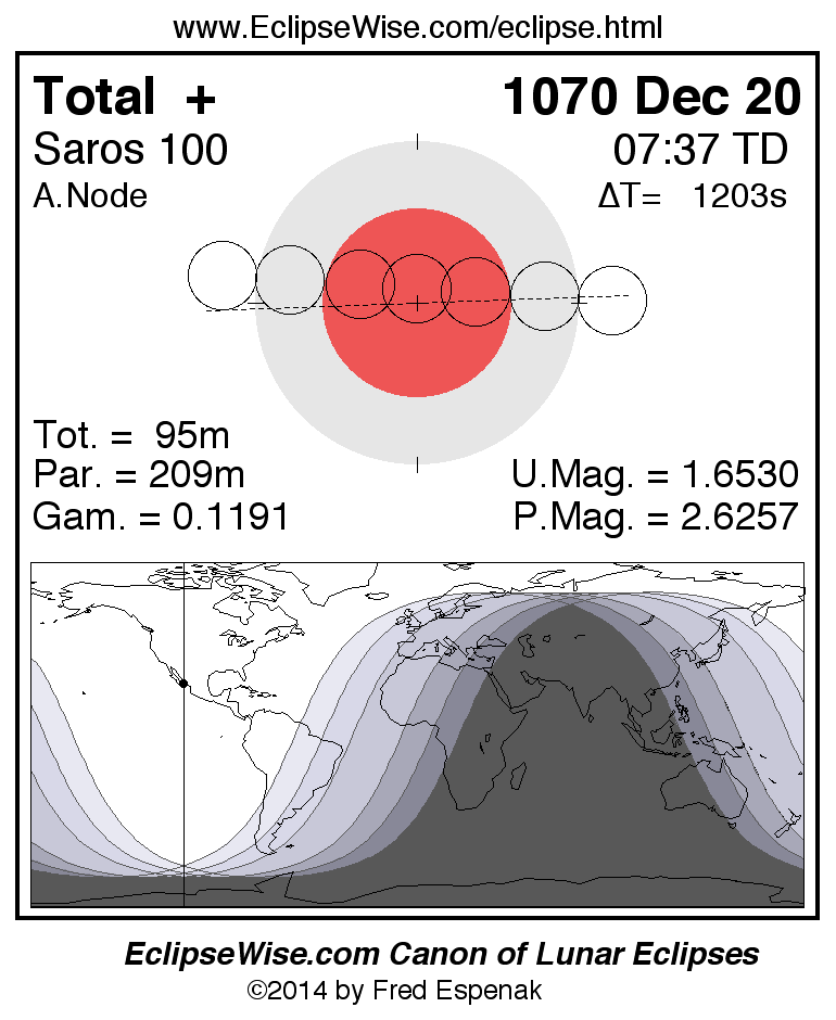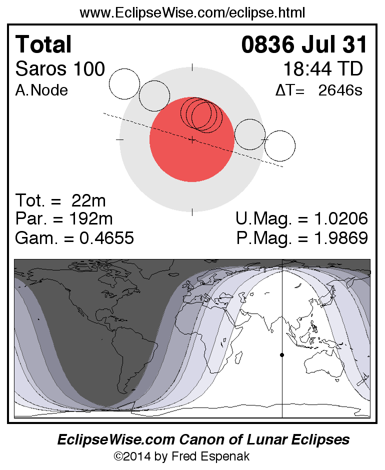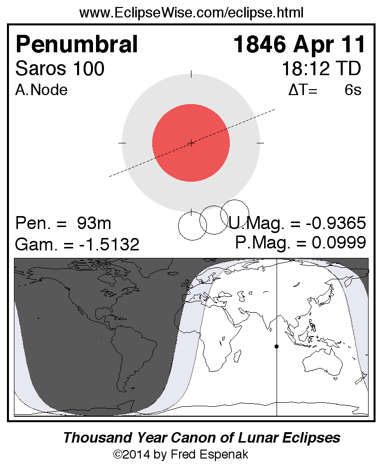 A panorama of all lunar eclipses belonging to Saros 100 is presented here. Each figure shows the Moon's path with respect to Earth's penumbral and umbral shadows. Below the path is a map depicting the geographic region of visibility for the eclipse. The date and time are given for the instant of Greatest Eclipse. Every figure serves as a hyperlink to the EclipseWise Prime page for that eclipse with a larger figure and complete details for the eclipse. Visit the Key to Lunar Eclipse Figures for a detailed explanation of these diagrams. Near the bottom of this page are a series of hyperlinks for more on lunar eclipses.