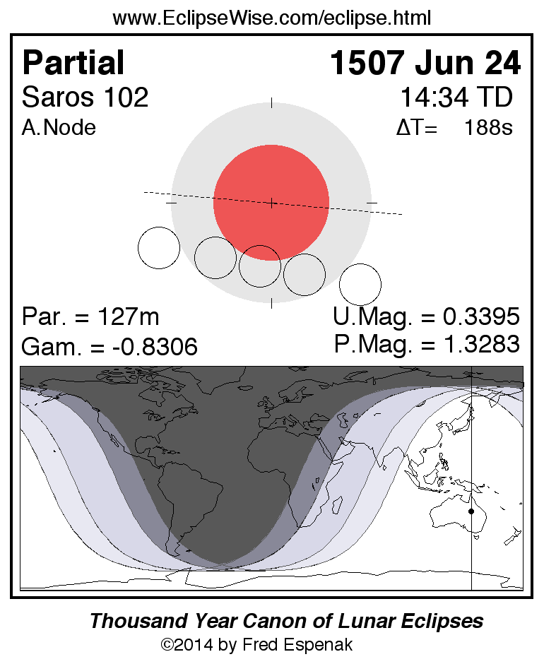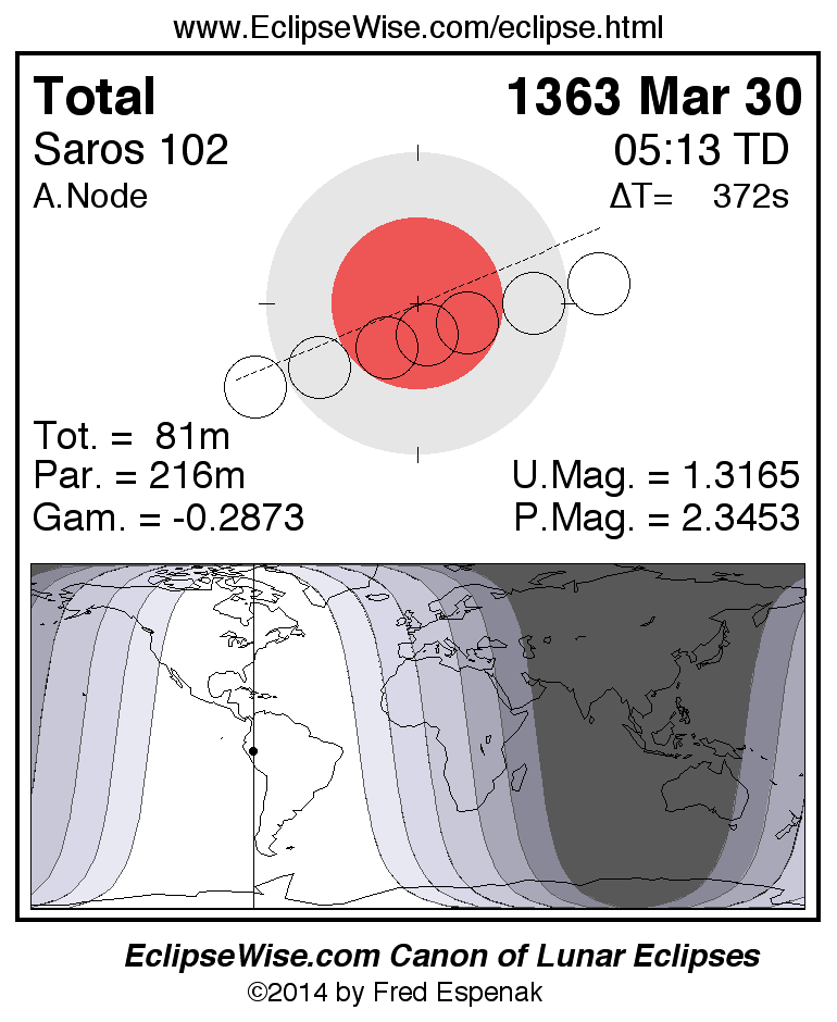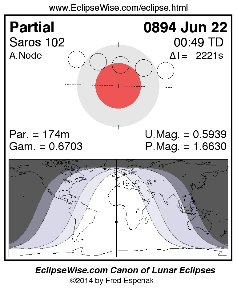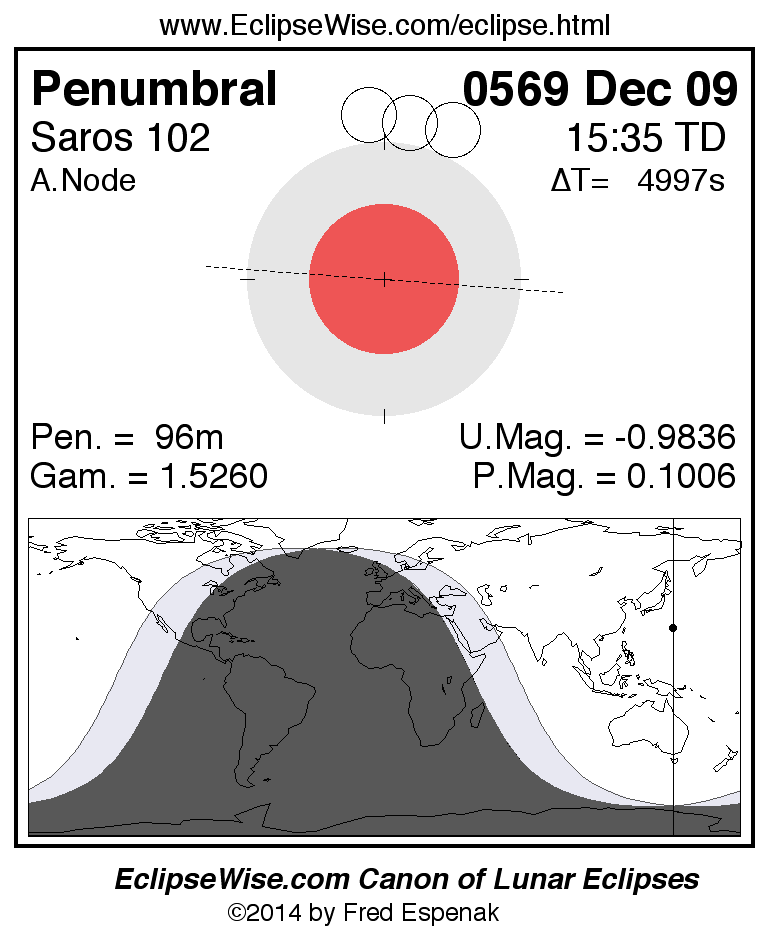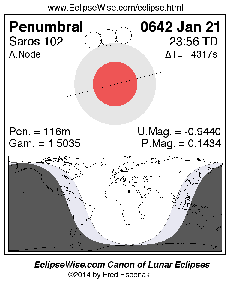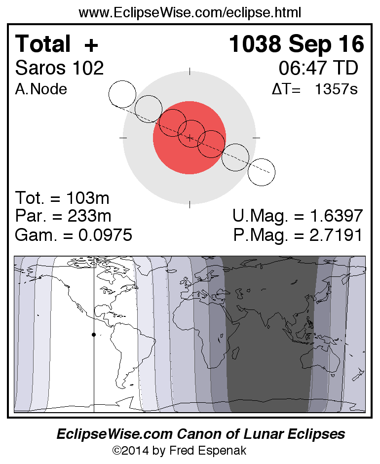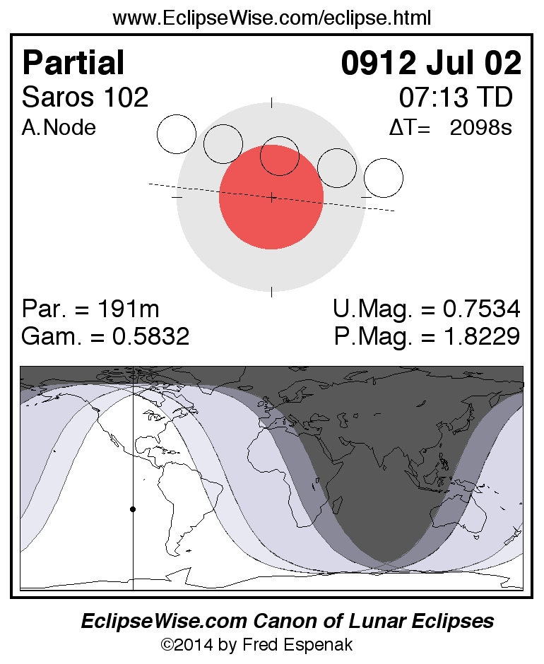 A panorama of all lunar eclipses belonging to Saros 102 is presented here. Each figure shows the Moon's path with respect to Earth's penumbral and umbral shadows. Below the path is a map depicting the geographic region of visibility for the eclipse. The date and time are given for the instant of Greatest Eclipse. Every figure serves as a hyperlink to the EclipseWise Prime page for that eclipse with a larger figure and complete details for the eclipse. Visit the Key to Lunar Eclipse Figures for a detailed explanation of these diagrams. Near the bottom of this page are a series of hyperlinks for more on lunar eclipses.