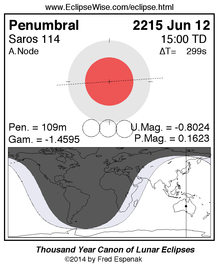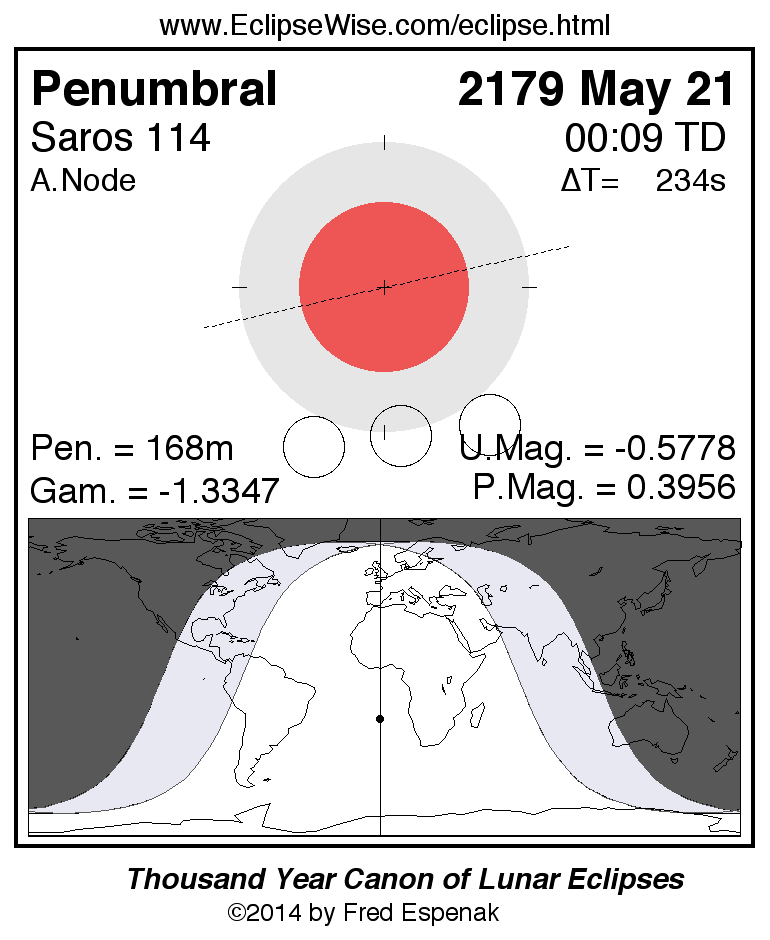A panorama of all lunar eclipses belonging to Saros 114 is presented here. Each figure shows the Moon's path with respect to Earth's penumbral and umbral shadows. Below the path is a map depicting the geographic region of visibility for the eclipse. The date and time are given for the instant of Greatest Eclipse. Every figure serves as a hyperlink to the EclipseWise Prime page for that eclipse with a larger figure and complete details for the eclipse. Visit the Key to Lunar Eclipse Figures for a detailed explanation of these diagrams. Near the bottom of this page are a series of hyperlinks for more on lunar eclipses.
