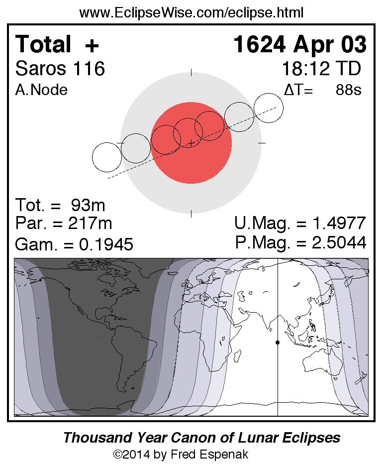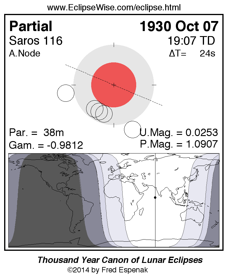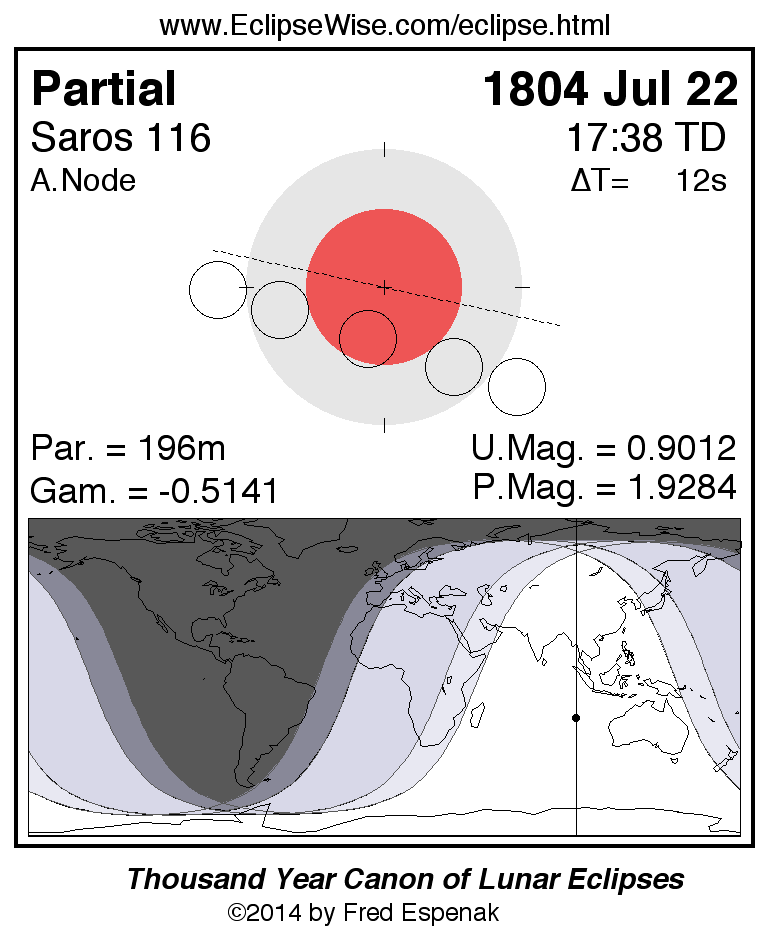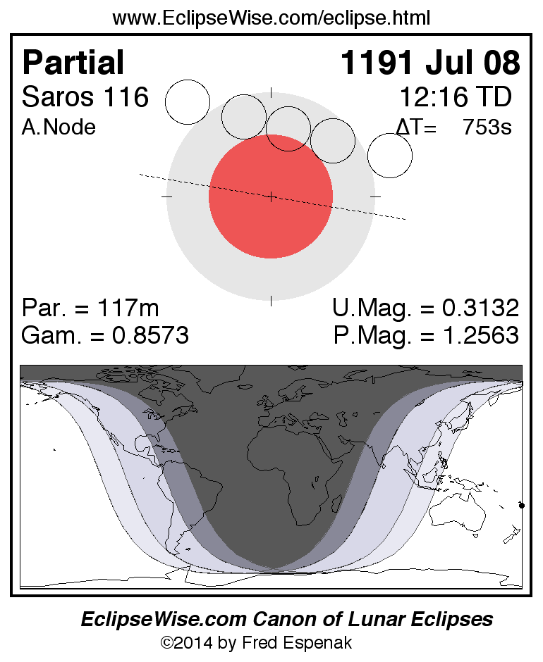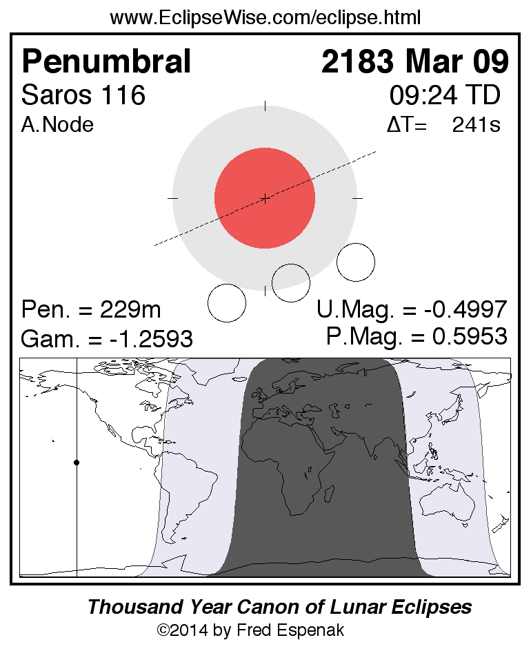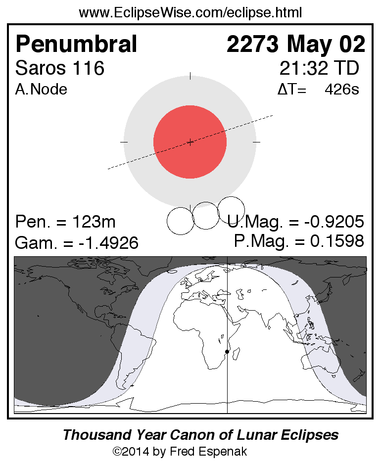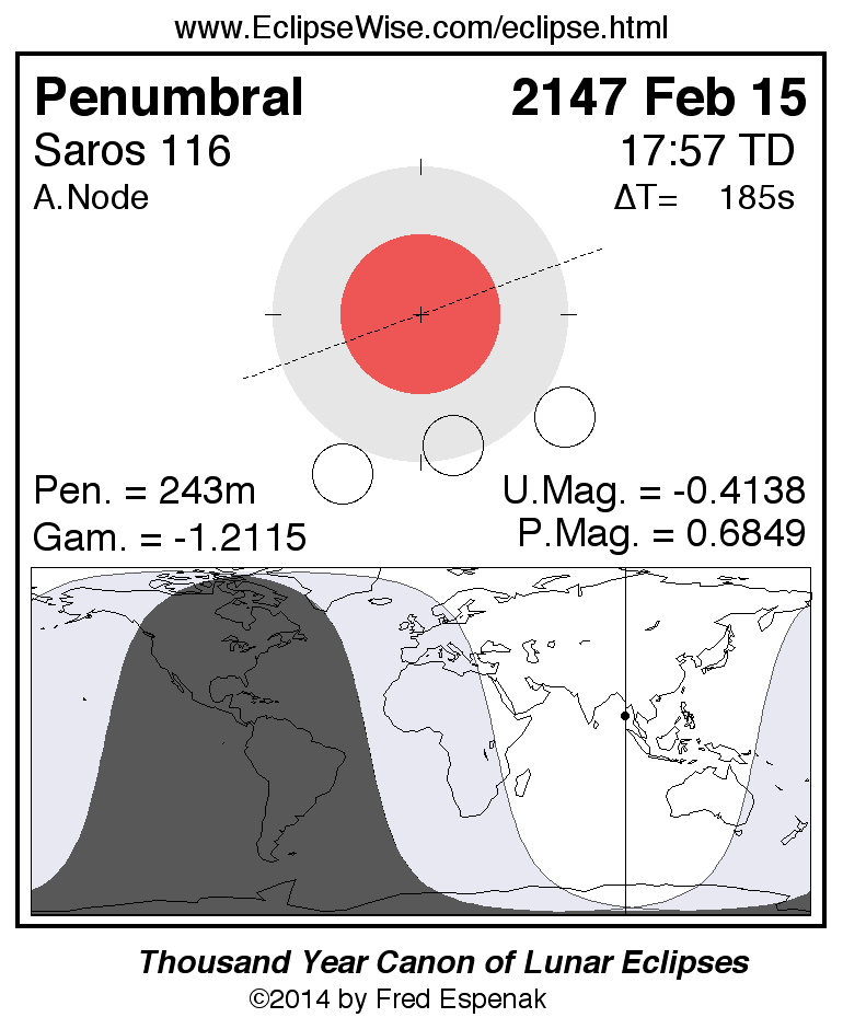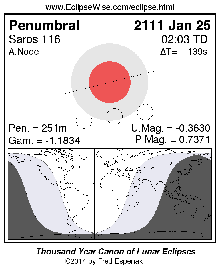 A panorama of all lunar eclipses belonging to Saros 116 is presented here. Each figure shows the Moon's path with respect to Earth's penumbral and umbral shadows. Below the path is a map depicting the geographic region of visibility for the eclipse. The date and time are given for the instant of Greatest Eclipse. Every figure serves as a hyperlink to the EclipseWise Prime page for that eclipse with a larger figure and complete details for the eclipse. Visit the Key to Lunar Eclipse Figures for a detailed explanation of these diagrams. Near the bottom of this page are a series of hyperlinks for more on lunar eclipses.