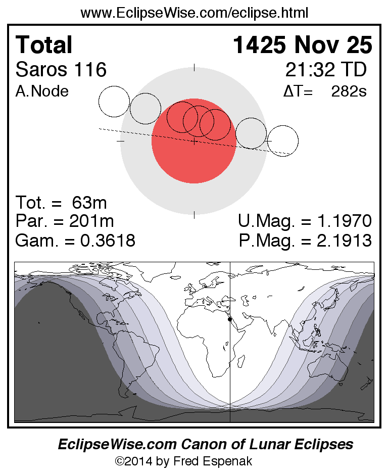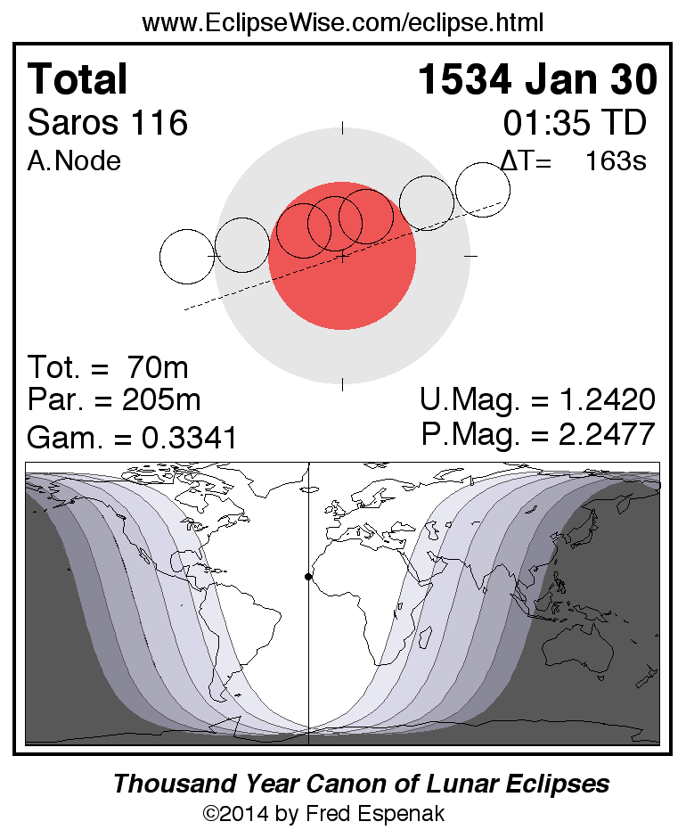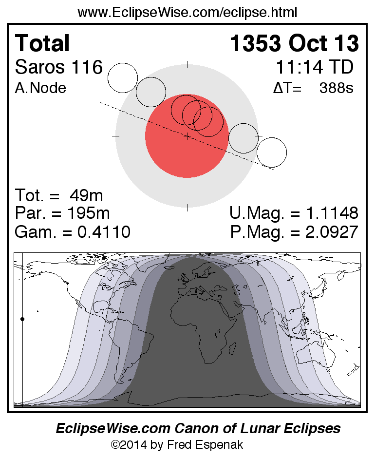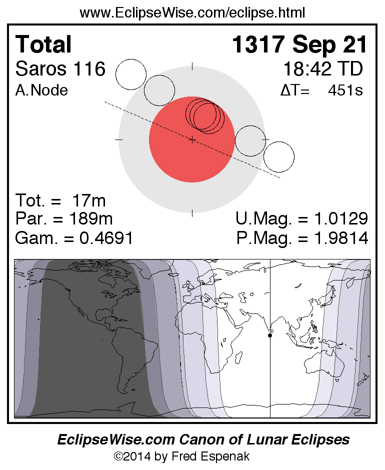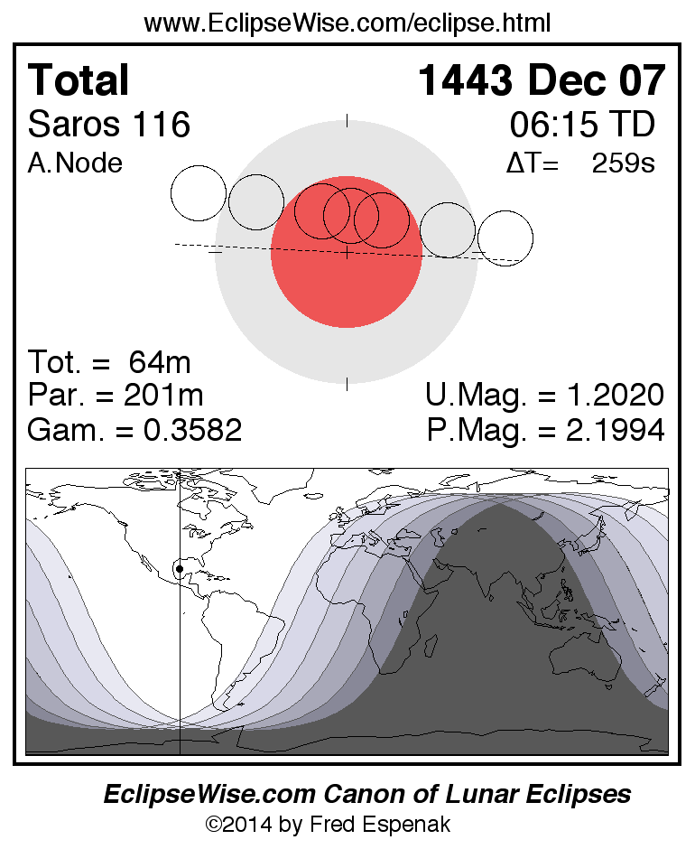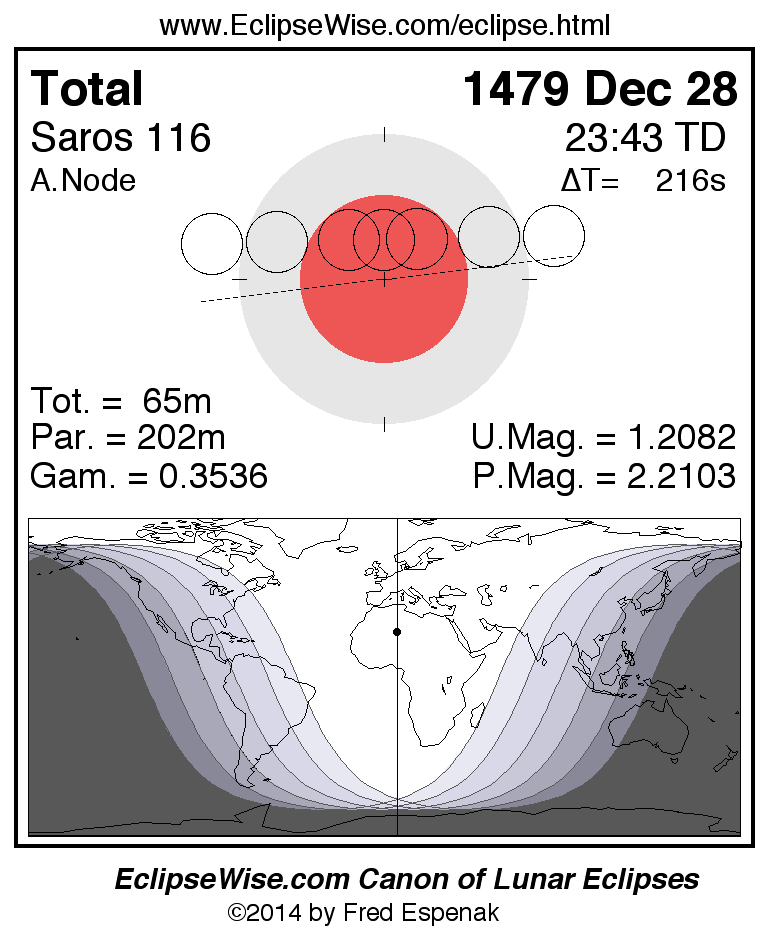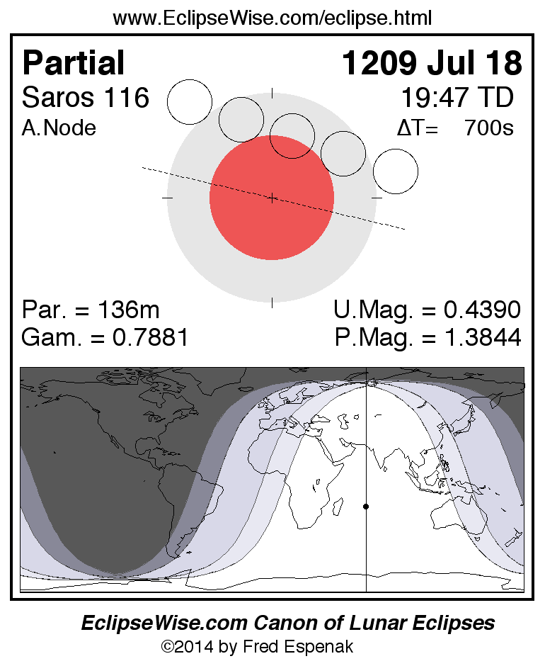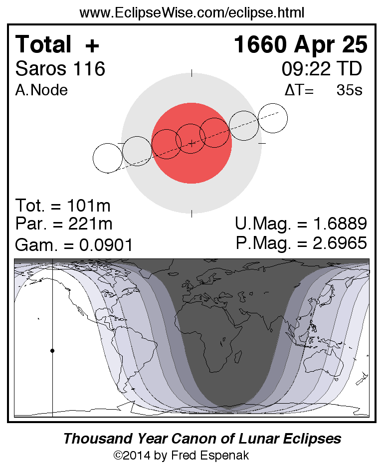 A panorama of all lunar eclipses belonging to Saros 116 is presented here. Each figure shows the Moon's path with respect to Earth's penumbral and umbral shadows. Below the path is a map depicting the geographic region of visibility for the eclipse. The date and time are given for the instant of Greatest Eclipse. Every figure serves as a hyperlink to the EclipseWise Prime page for that eclipse with a larger figure and complete details for the eclipse. Visit the Key to Lunar Eclipse Figures for a detailed explanation of these diagrams. Near the bottom of this page are a series of hyperlinks for more on lunar eclipses.