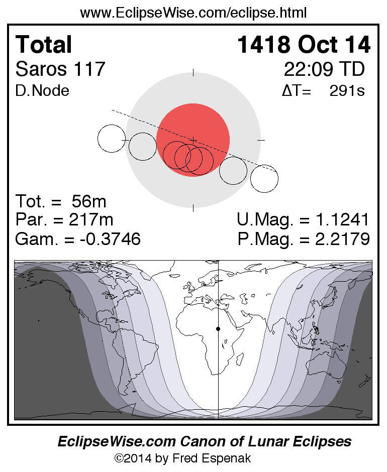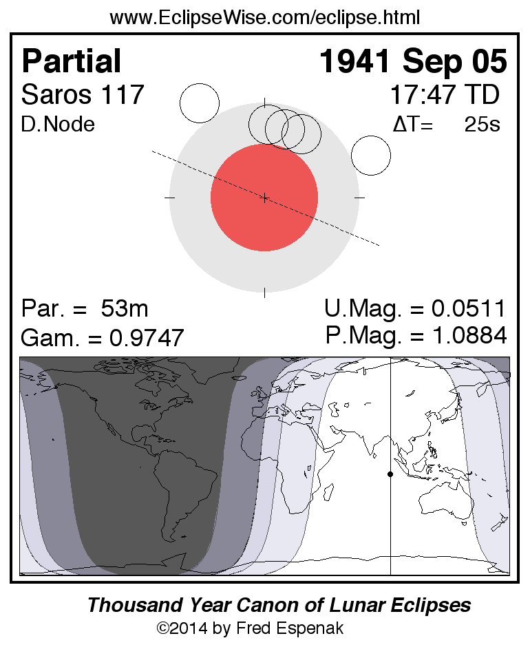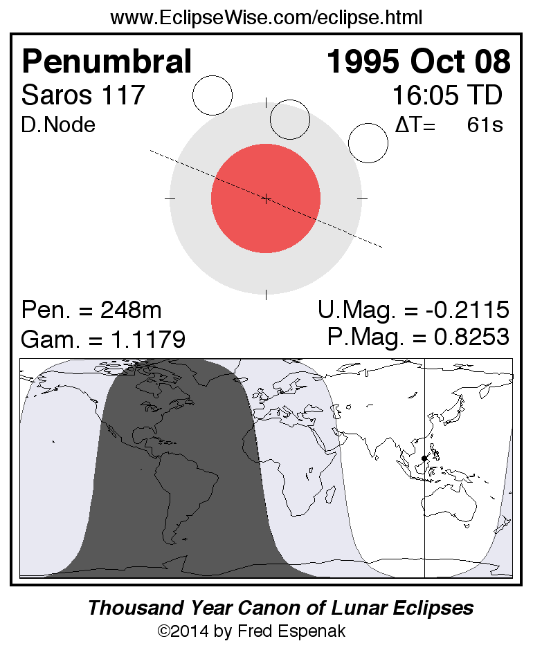 A panorama of all lunar eclipses belonging to Saros 117 is presented here. Each figure shows the Moon's path with respect to Earth's penumbral and umbral shadows. Below the path is a map depicting the geographic region of visibility for the eclipse. The date and time are given for the instant of Greatest Eclipse. Every figure serves as a hyperlink to the EclipseWise Prime page for that eclipse with a larger figure and complete details for the eclipse. Visit the Key to Lunar Eclipse Figures for a detailed explanation of these diagrams. Near the bottom of this page are a series of hyperlinks for more on lunar eclipses.