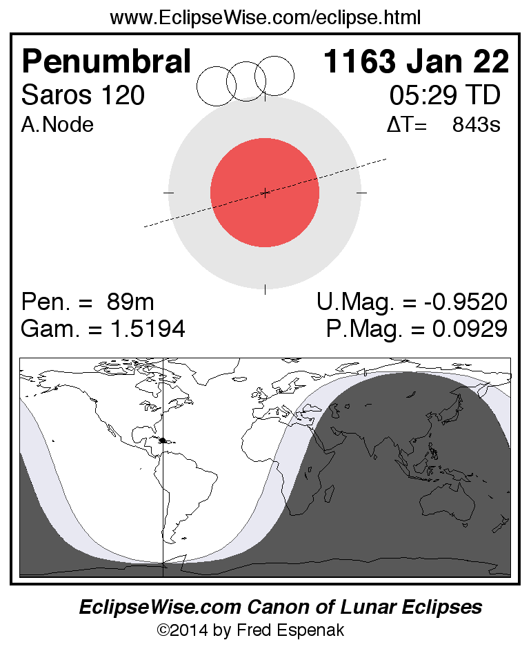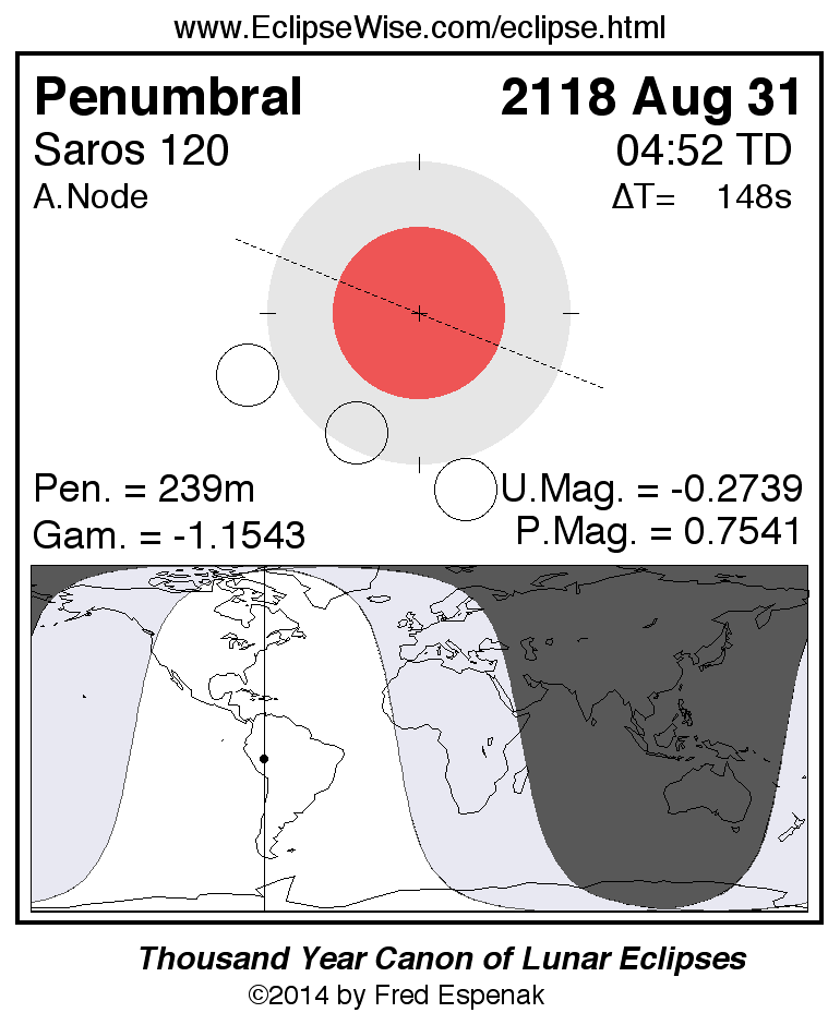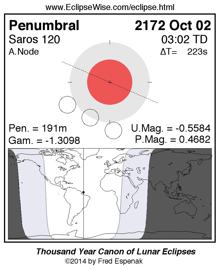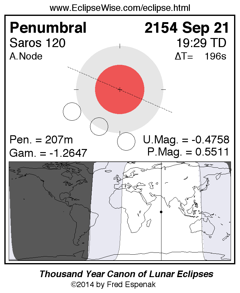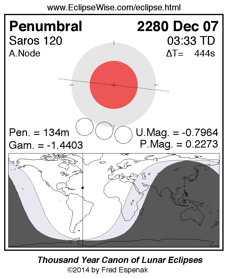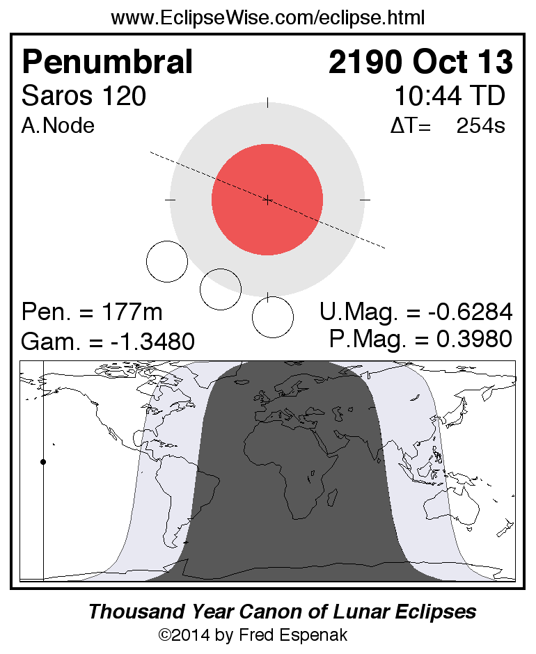 A panorama of all lunar eclipses belonging to Saros 120 is presented here. Each figure shows the Moon's path with respect to Earth's penumbral and umbral shadows. Below the path is a map depicting the geographic region of visibility for the eclipse. The date and time are given for the instant of Greatest Eclipse. Every figure serves as a hyperlink to the EclipseWise Prime page for that eclipse with a larger figure and complete details for the eclipse. Visit the Key to Lunar Eclipse Figures for a detailed explanation of these diagrams. Near the bottom of this page are a series of hyperlinks for more on lunar eclipses.