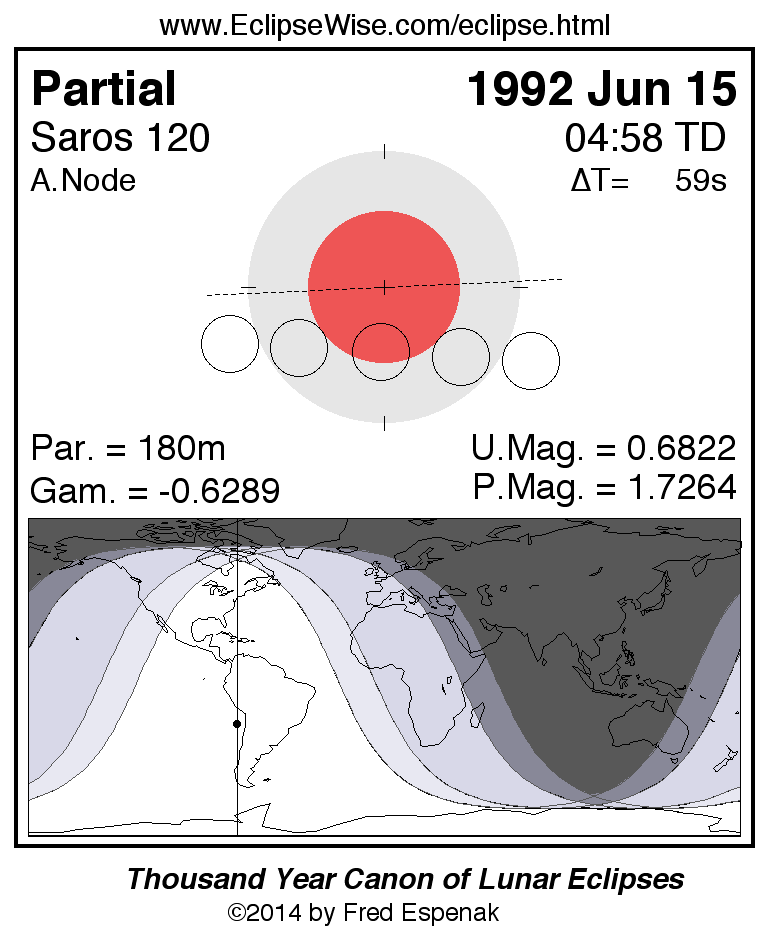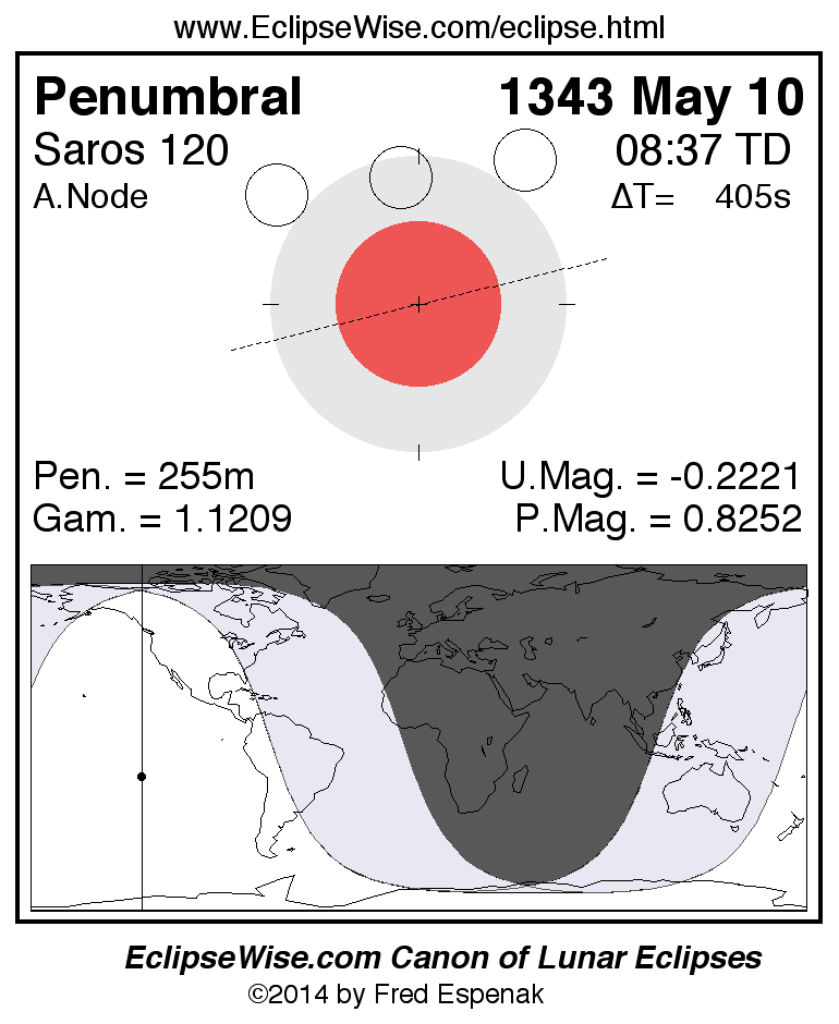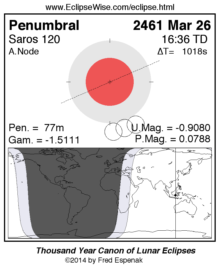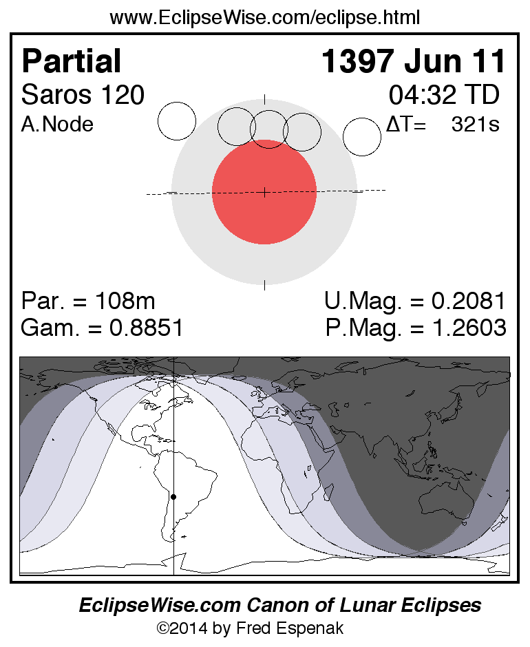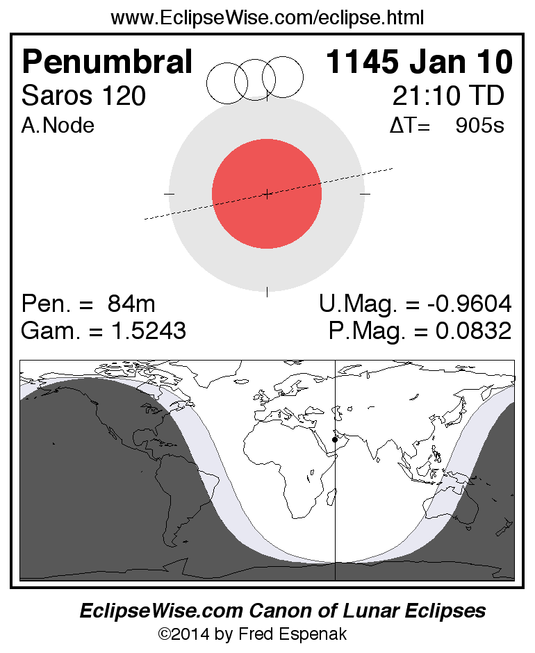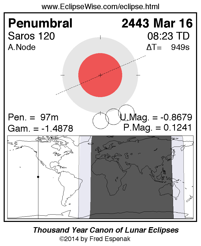 A panorama of all lunar eclipses belonging to Saros 120 is presented here. Each figure shows the Moon's path with respect to Earth's penumbral and umbral shadows. Below the path is a map depicting the geographic region of visibility for the eclipse. The date and time are given for the instant of Greatest Eclipse. Every figure serves as a hyperlink to the EclipseWise Prime page for that eclipse with a larger figure and complete details for the eclipse. Visit the Key to Lunar Eclipse Figures for a detailed explanation of these diagrams. Near the bottom of this page are a series of hyperlinks for more on lunar eclipses.