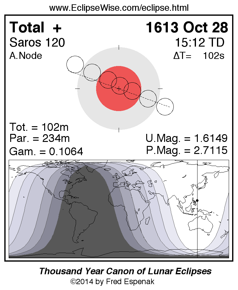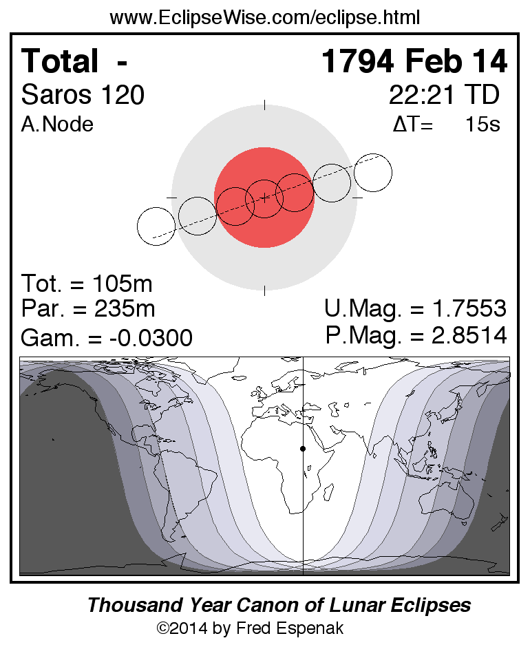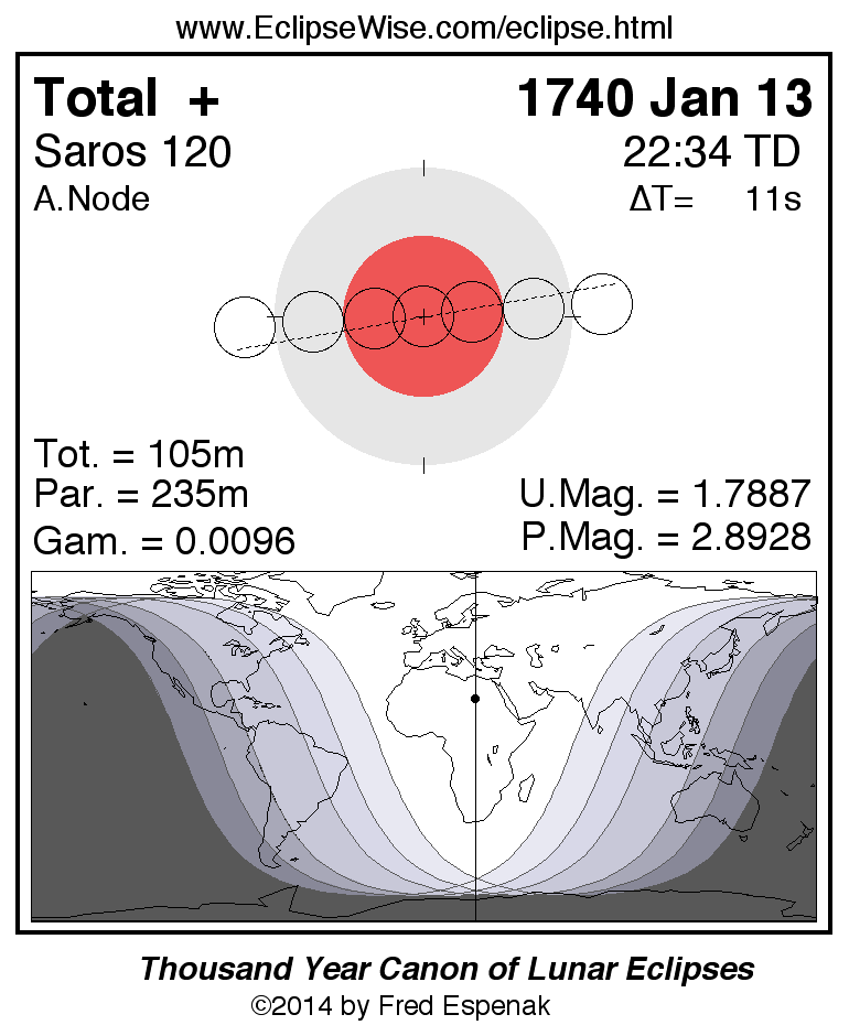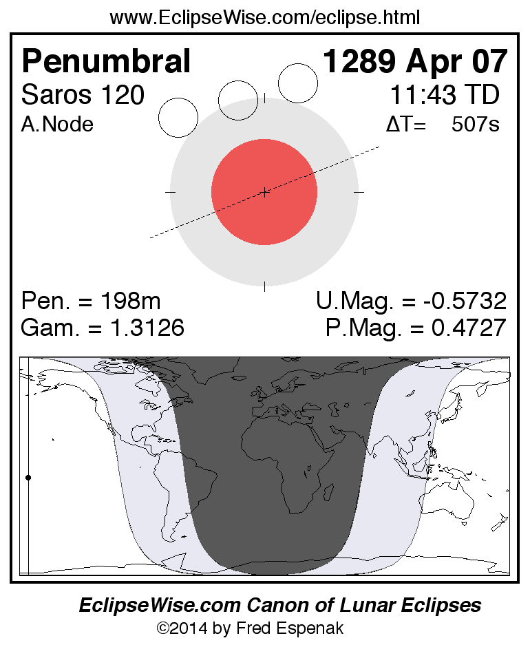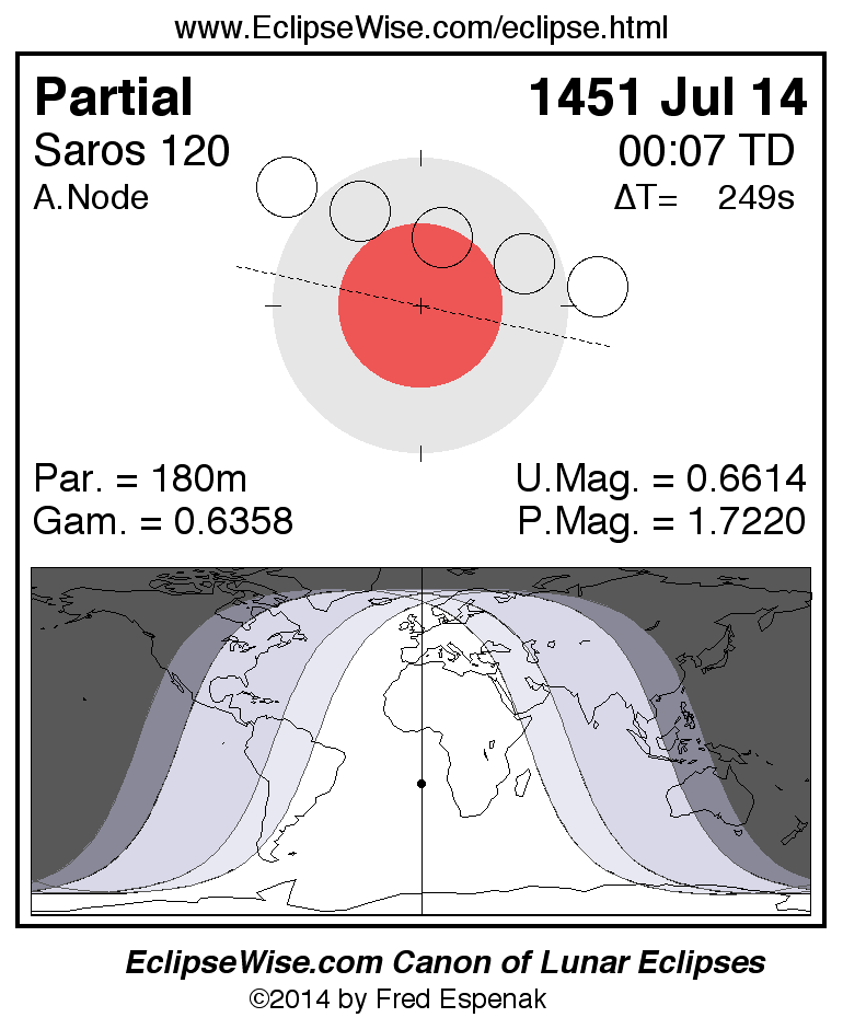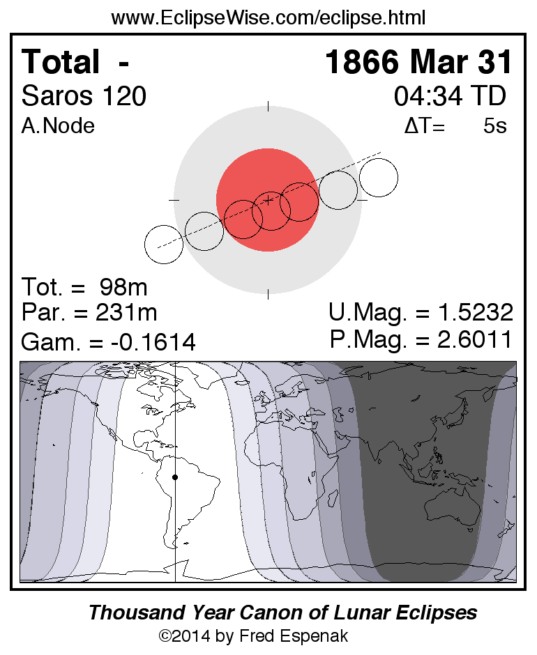 A panorama of all lunar eclipses belonging to Saros 120 is presented here. Each figure shows the Moon's path with respect to Earth's penumbral and umbral shadows. Below the path is a map depicting the geographic region of visibility for the eclipse. The date and time are given for the instant of Greatest Eclipse. Every figure serves as a hyperlink to the EclipseWise Prime page for that eclipse with a larger figure and complete details for the eclipse. Visit the Key to Lunar Eclipse Figures for a detailed explanation of these diagrams. Near the bottom of this page are a series of hyperlinks for more on lunar eclipses.