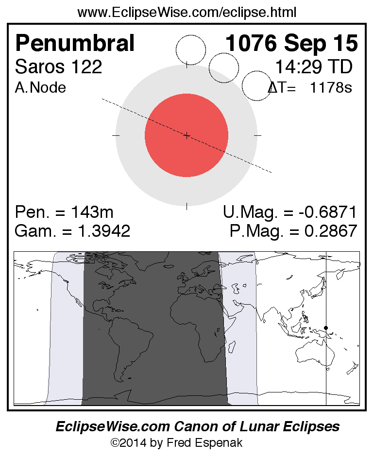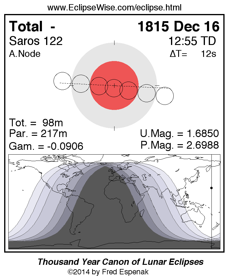 A panorama of all lunar eclipses belonging to Saros 122 is presented here. Each figure shows the Moon's path with respect to Earth's penumbral and umbral shadows. Below the path is a map depicting the geographic region of visibility for the eclipse. The date and time are given for the instant of Greatest Eclipse. Every figure serves as a hyperlink to the EclipseWise Prime page for that eclipse with a larger figure and complete details for the eclipse. Visit the Key to Lunar Eclipse Figures for a detailed explanation of these diagrams. Near the bottom of this page are a series of hyperlinks for more on lunar eclipses.