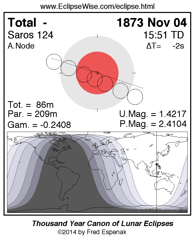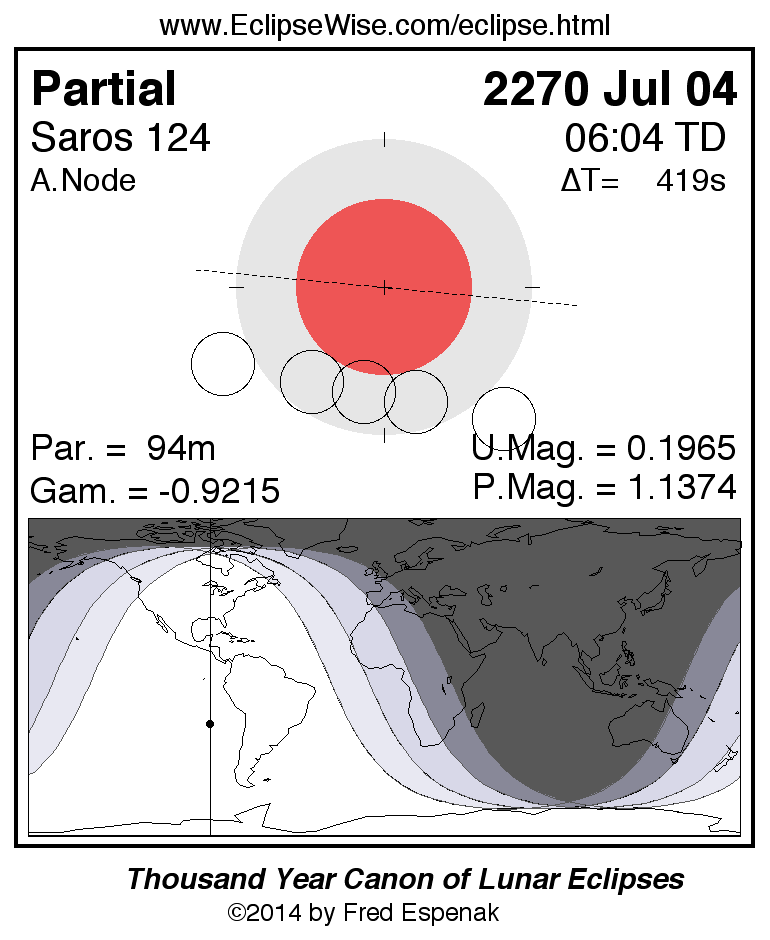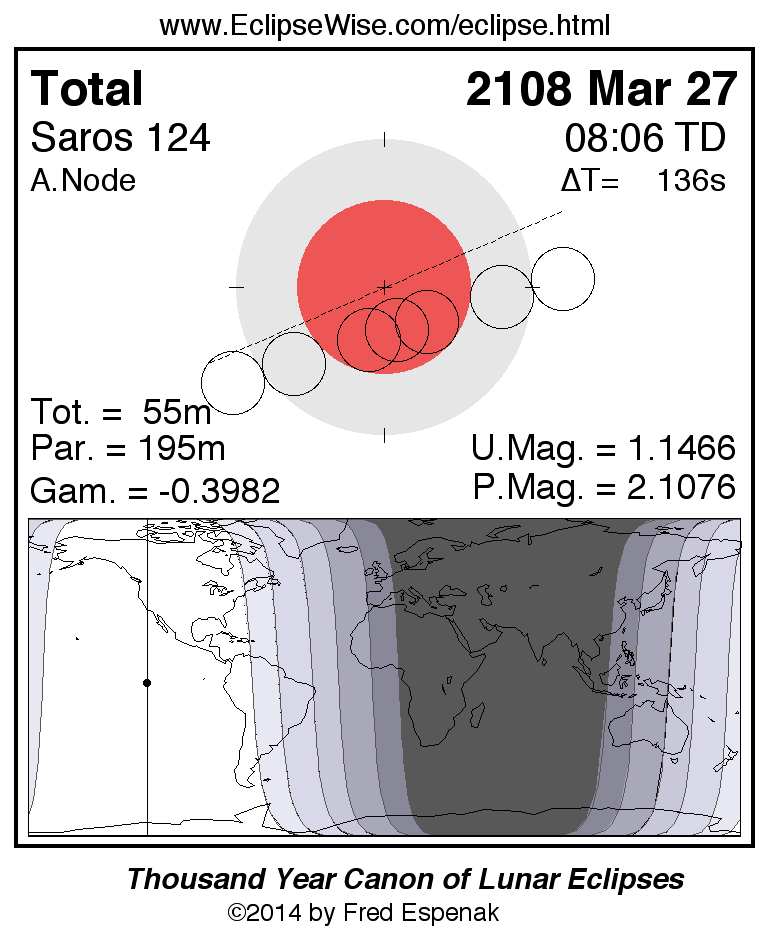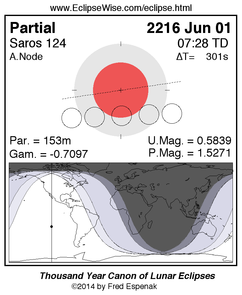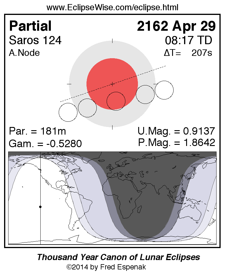 A panorama of all lunar eclipses belonging to Saros 124 is presented here. Each figure shows the Moon's path with respect to Earth's penumbral and umbral shadows. Below the path is a map depicting the geographic region of visibility for the eclipse. The date and time are given for the instant of Greatest Eclipse. Every figure serves as a hyperlink to the EclipseWise Prime page for that eclipse with a larger figure and complete details for the eclipse. Visit the Key to Lunar Eclipse Figures for a detailed explanation of these diagrams. Near the bottom of this page are a series of hyperlinks for more on lunar eclipses.