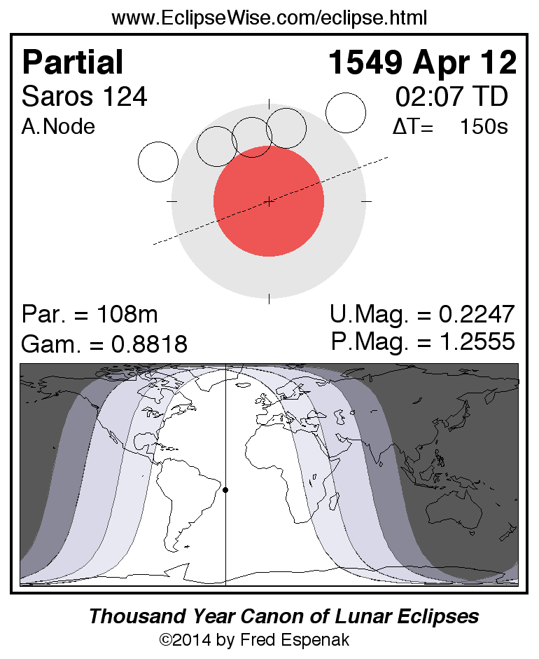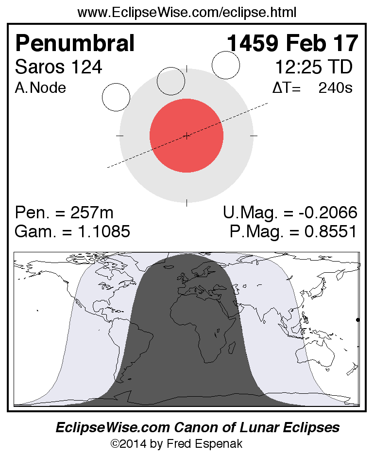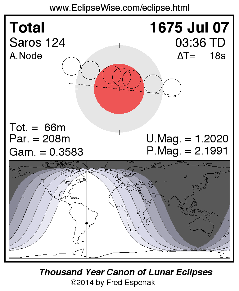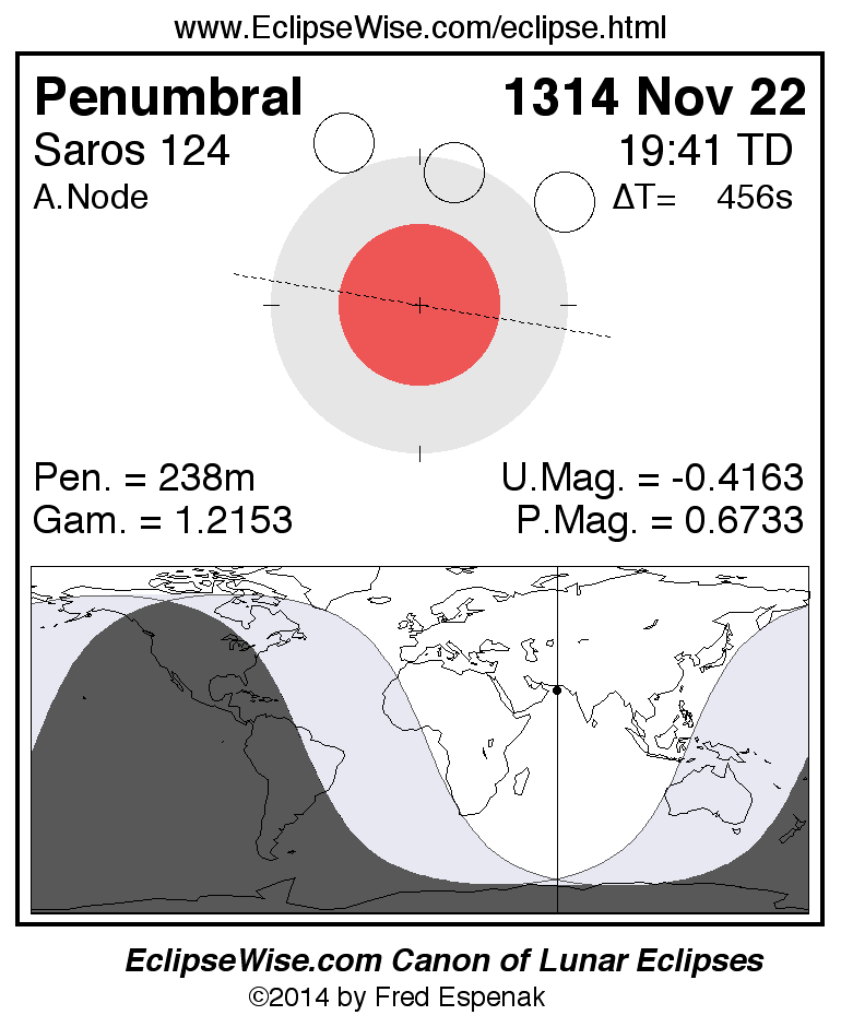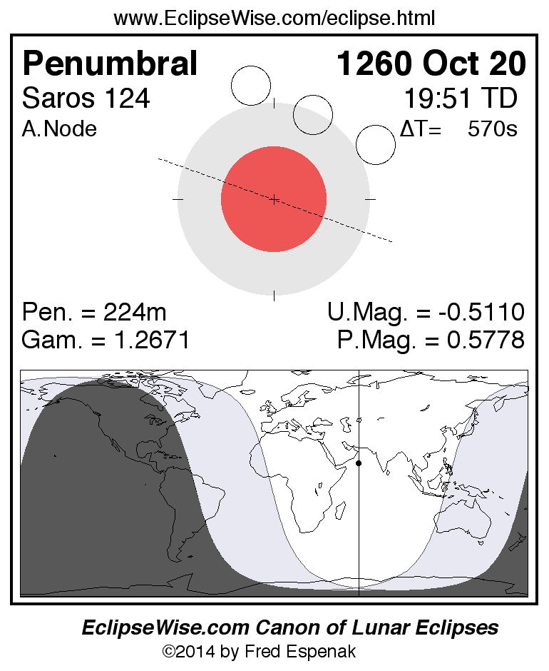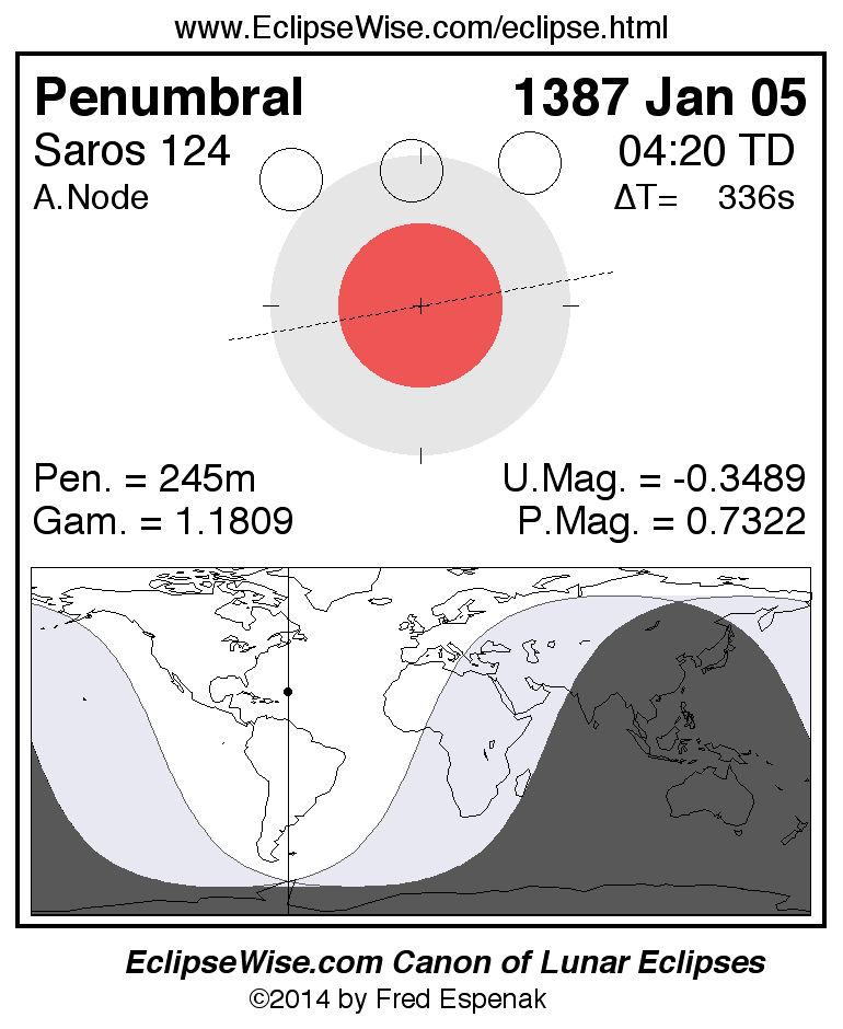 A panorama of all lunar eclipses belonging to Saros 124 is presented here. Each figure shows the Moon's path with respect to Earth's penumbral and umbral shadows. Below the path is a map depicting the geographic region of visibility for the eclipse. The date and time are given for the instant of Greatest Eclipse. Every figure serves as a hyperlink to the EclipseWise Prime page for that eclipse with a larger figure and complete details for the eclipse. Visit the Key to Lunar Eclipse Figures for a detailed explanation of these diagrams. Near the bottom of this page are a series of hyperlinks for more on lunar eclipses.