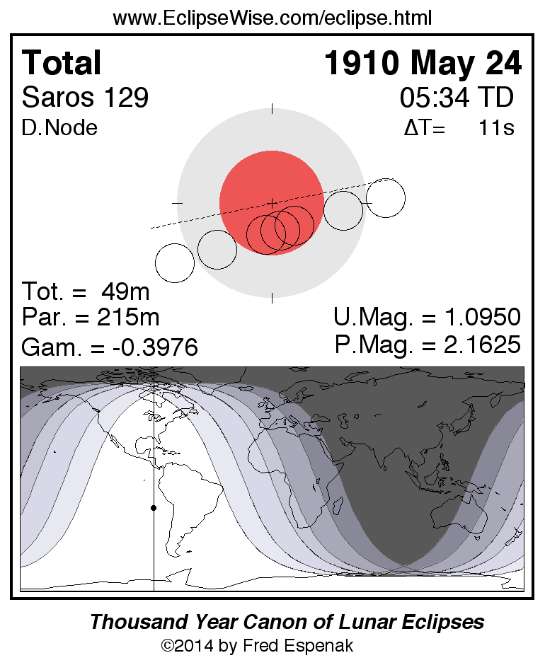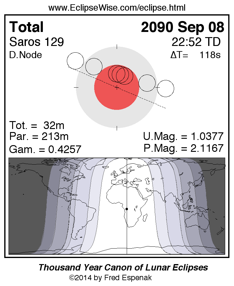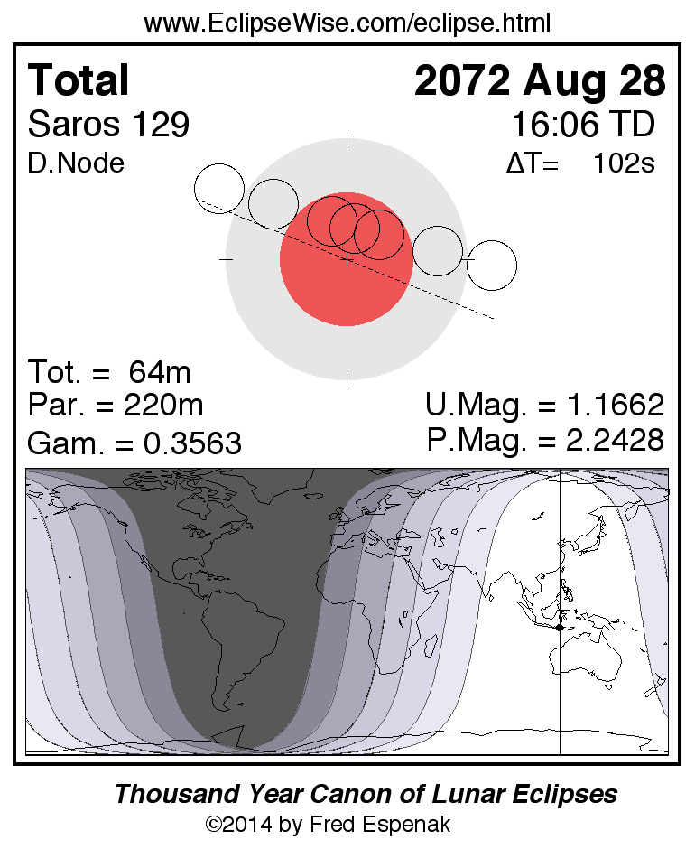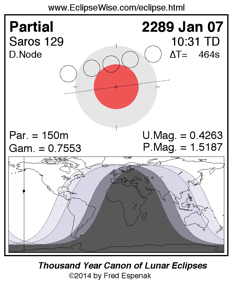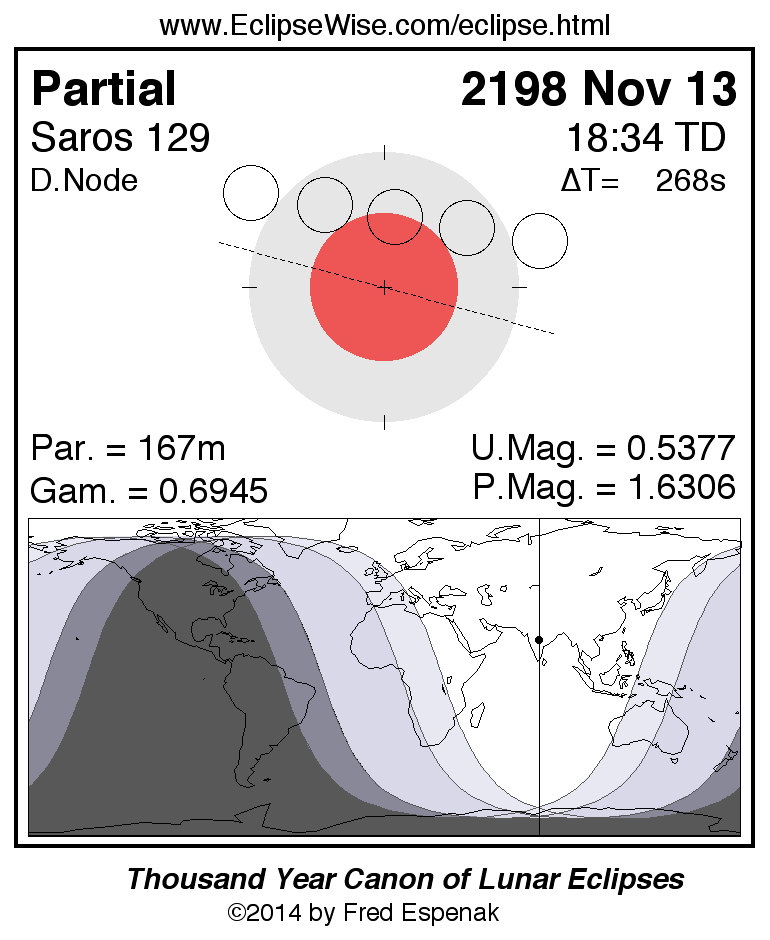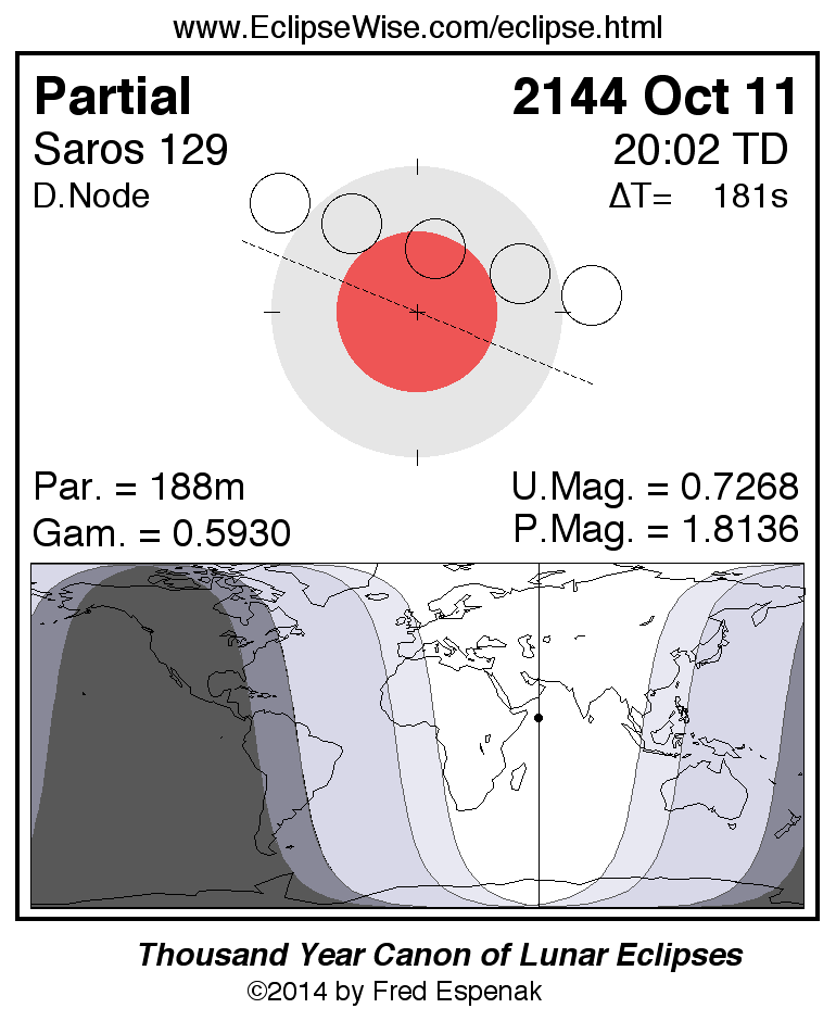 A panorama of all lunar eclipses belonging to Saros 129 is presented here. Each figure shows the Moon's path with respect to Earth's penumbral and umbral shadows. Below the path is a map depicting the geographic region of visibility for the eclipse. The date and time are given for the instant of Greatest Eclipse. Every figure serves as a hyperlink to the EclipseWise Prime page for that eclipse with a larger figure and complete details for the eclipse. Visit the Key to Lunar Eclipse Figures for a detailed explanation of these diagrams. Near the bottom of this page are a series of hyperlinks for more on lunar eclipses.