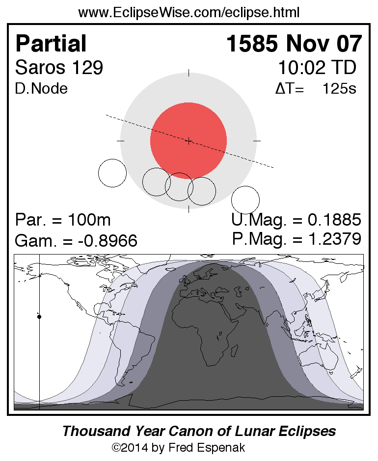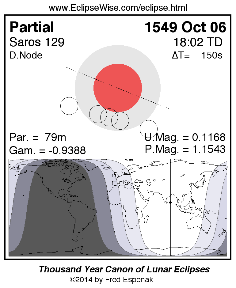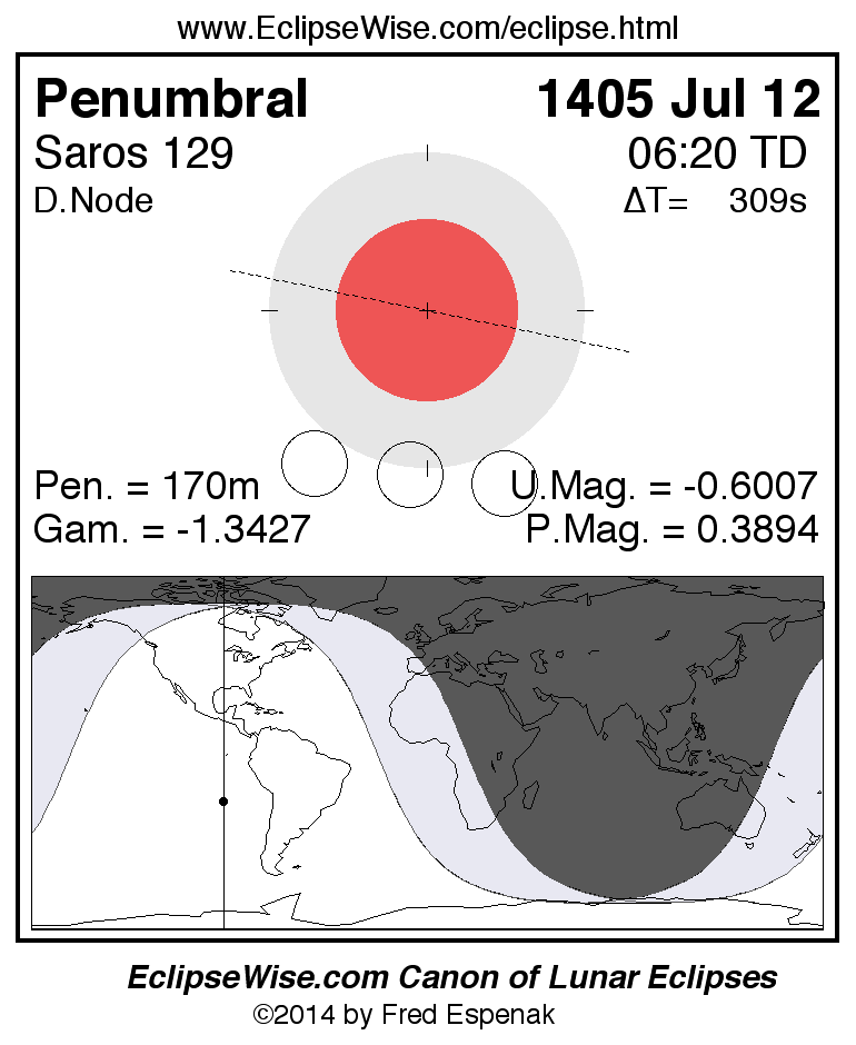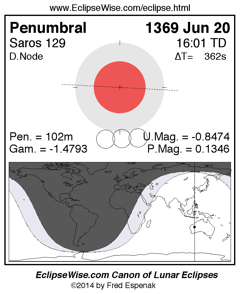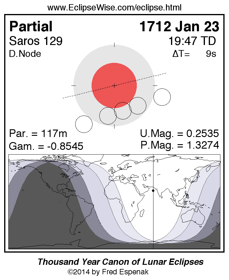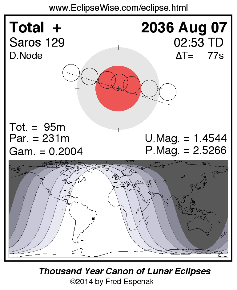 A panorama of all lunar eclipses belonging to Saros 129 is presented here. Each figure shows the Moon's path with respect to Earth's penumbral and umbral shadows. Below the path is a map depicting the geographic region of visibility for the eclipse. The date and time are given for the instant of Greatest Eclipse. Every figure serves as a hyperlink to the EclipseWise Prime page for that eclipse with a larger figure and complete details for the eclipse. Visit the Key to Lunar Eclipse Figures for a detailed explanation of these diagrams. Near the bottom of this page are a series of hyperlinks for more on lunar eclipses.