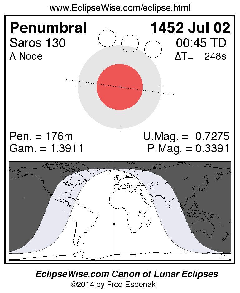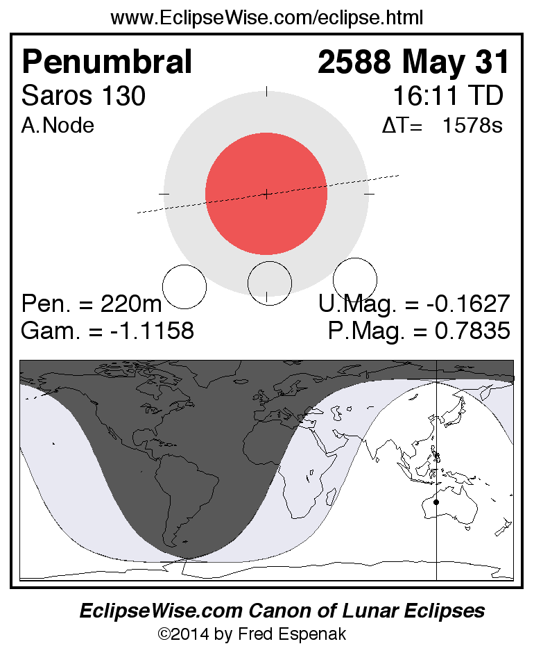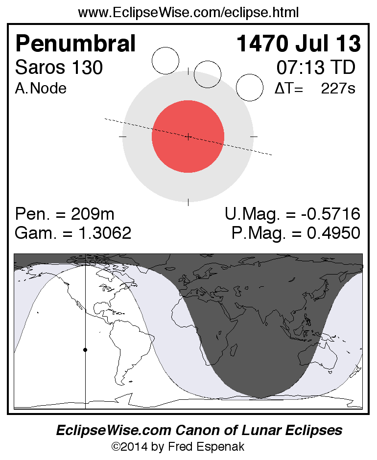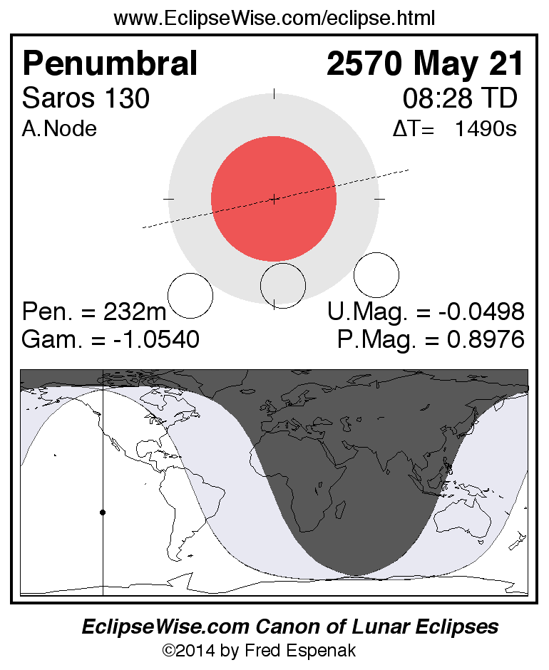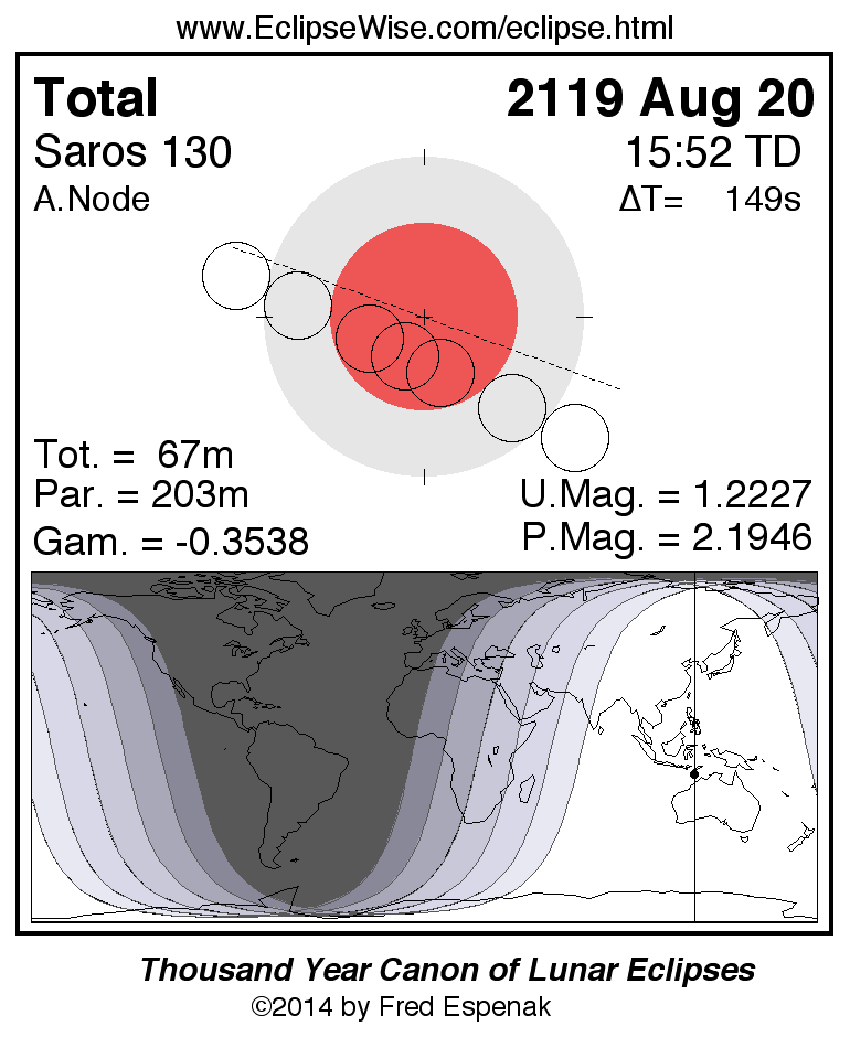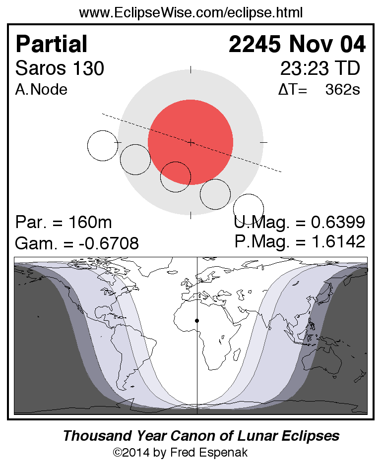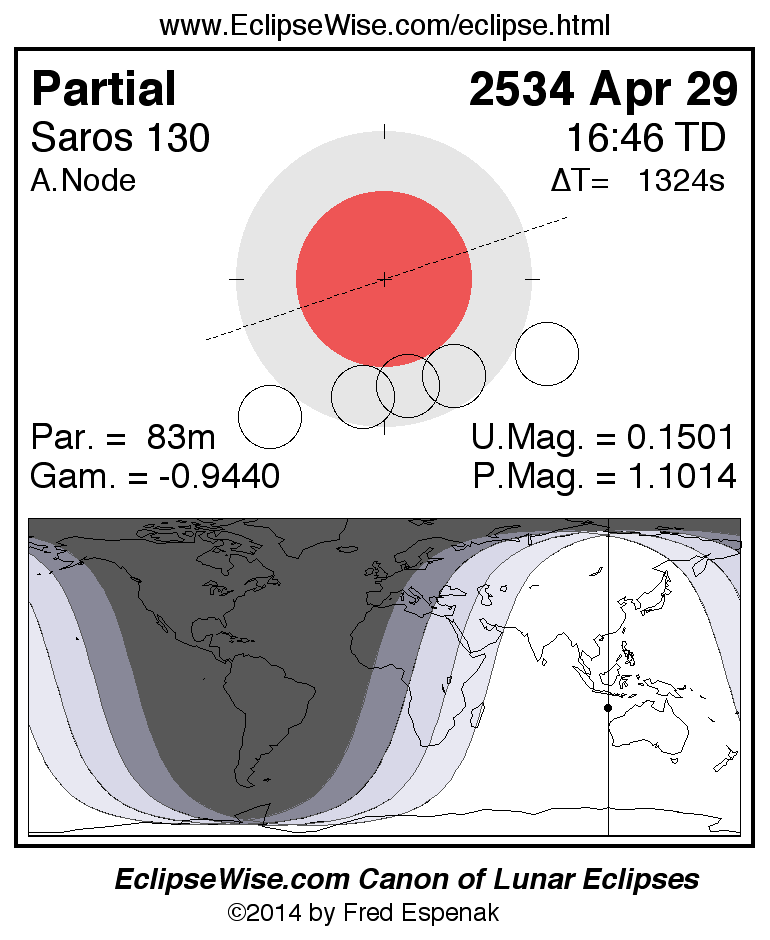 A panorama of all lunar eclipses belonging to Saros 130 is presented here. Each figure shows the Moon's path with respect to Earth's penumbral and umbral shadows. Below the path is a map depicting the geographic region of visibility for the eclipse. The date and time are given for the instant of Greatest Eclipse. Every figure serves as a hyperlink to the EclipseWise Prime page for that eclipse with a larger figure and complete details for the eclipse. Visit the Key to Lunar Eclipse Figures for a detailed explanation of these diagrams. Near the bottom of this page are a series of hyperlinks for more on lunar eclipses.