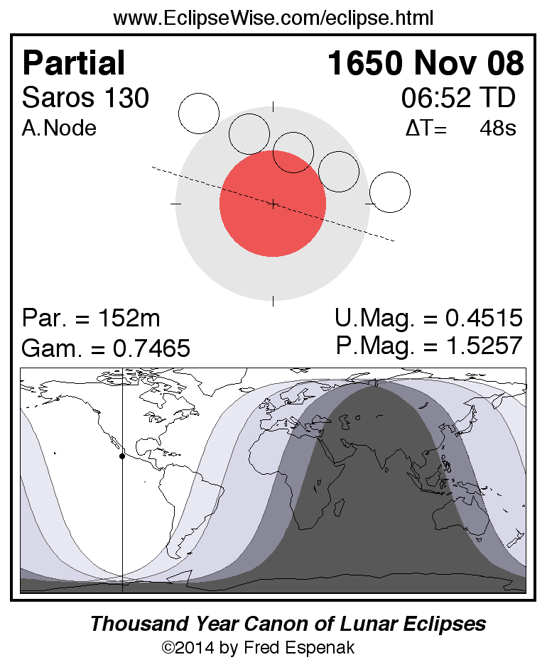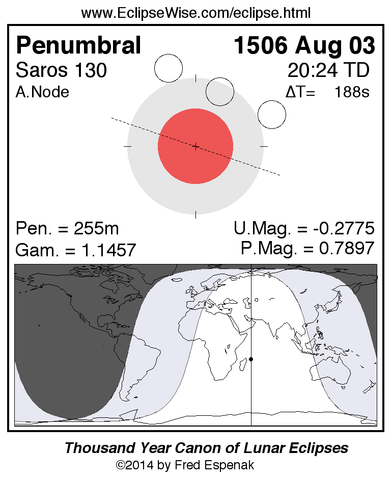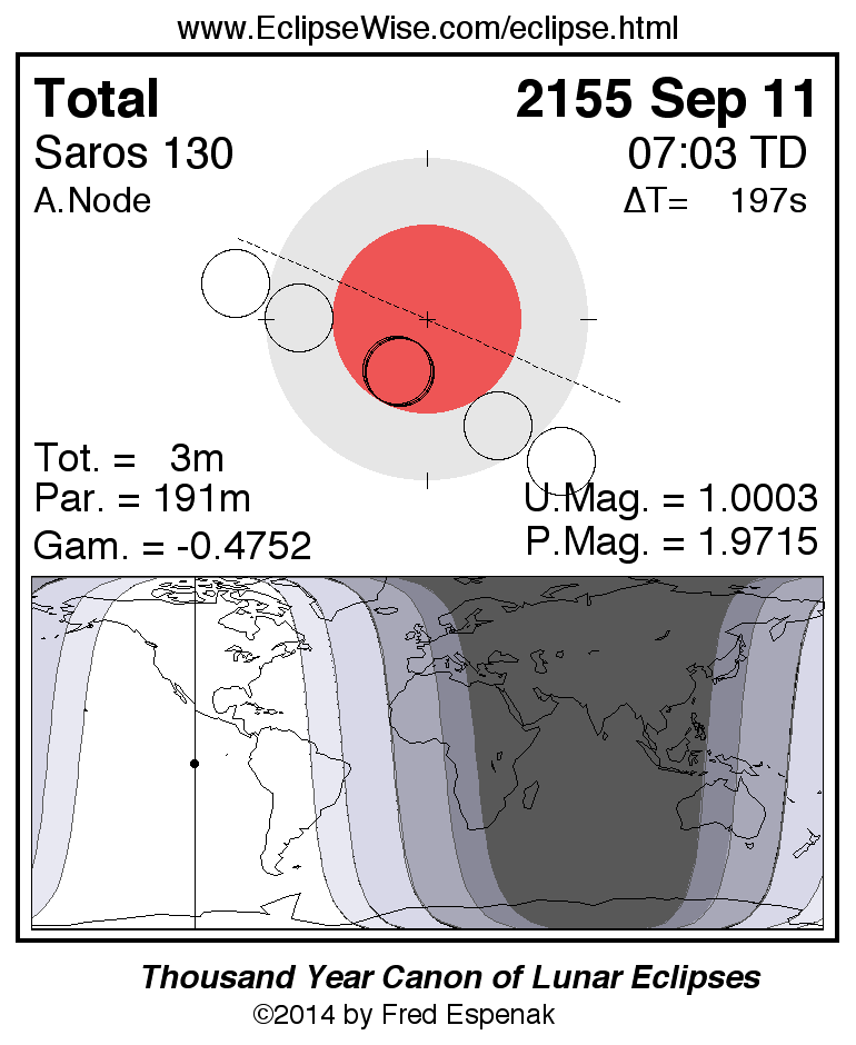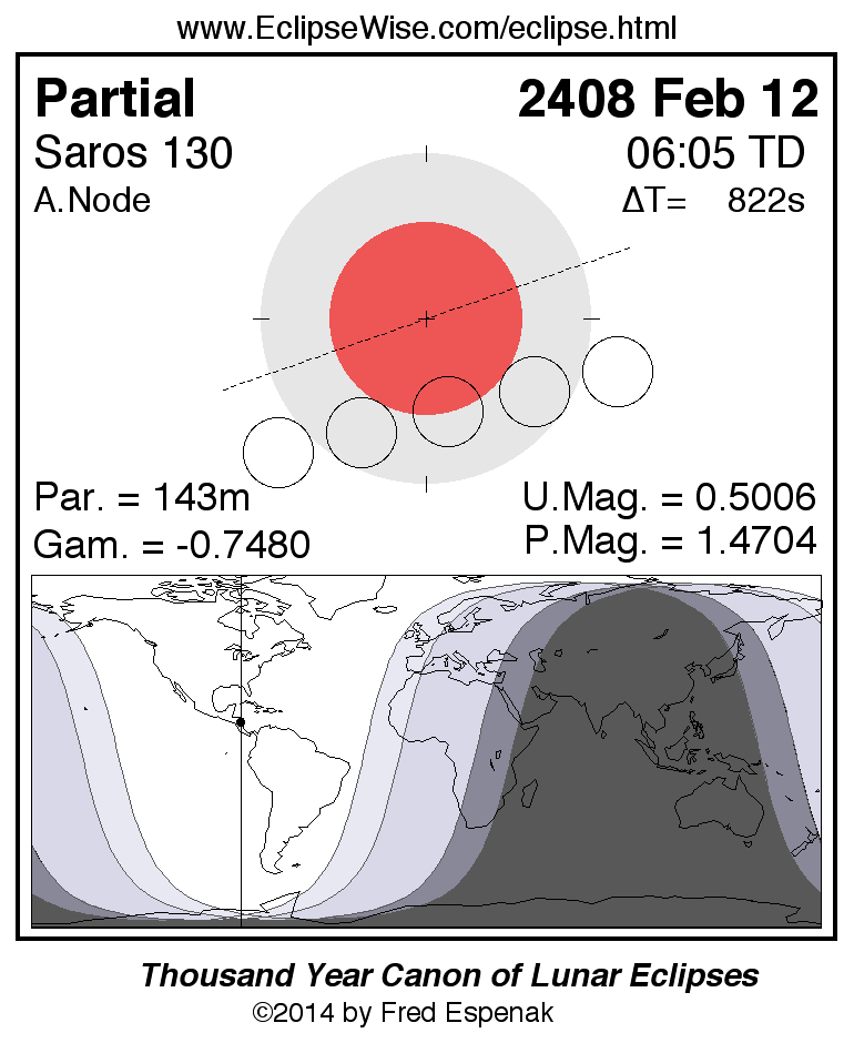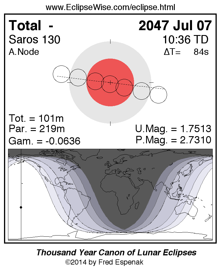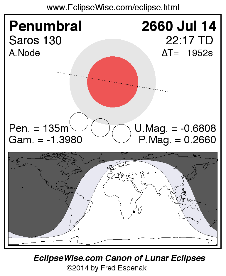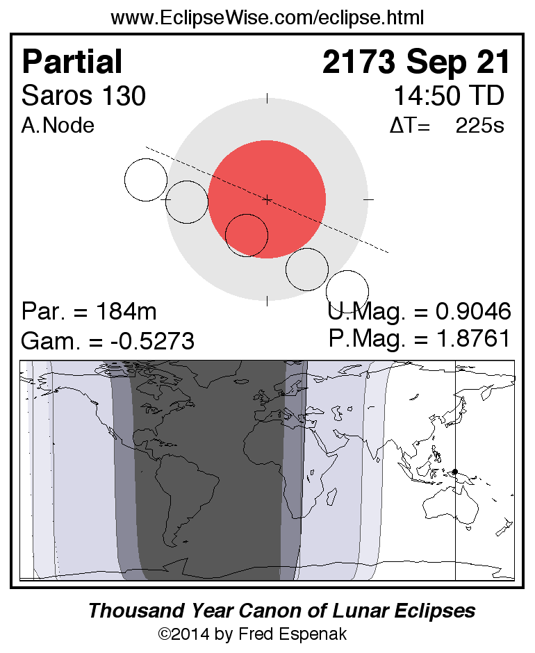 A panorama of all lunar eclipses belonging to Saros 130 is presented here. Each figure shows the Moon's path with respect to Earth's penumbral and umbral shadows. Below the path is a map depicting the geographic region of visibility for the eclipse. The date and time are given for the instant of Greatest Eclipse. Every figure serves as a hyperlink to the EclipseWise Prime page for that eclipse with a larger figure and complete details for the eclipse. Visit the Key to Lunar Eclipse Figures for a detailed explanation of these diagrams. Near the bottom of this page are a series of hyperlinks for more on lunar eclipses.