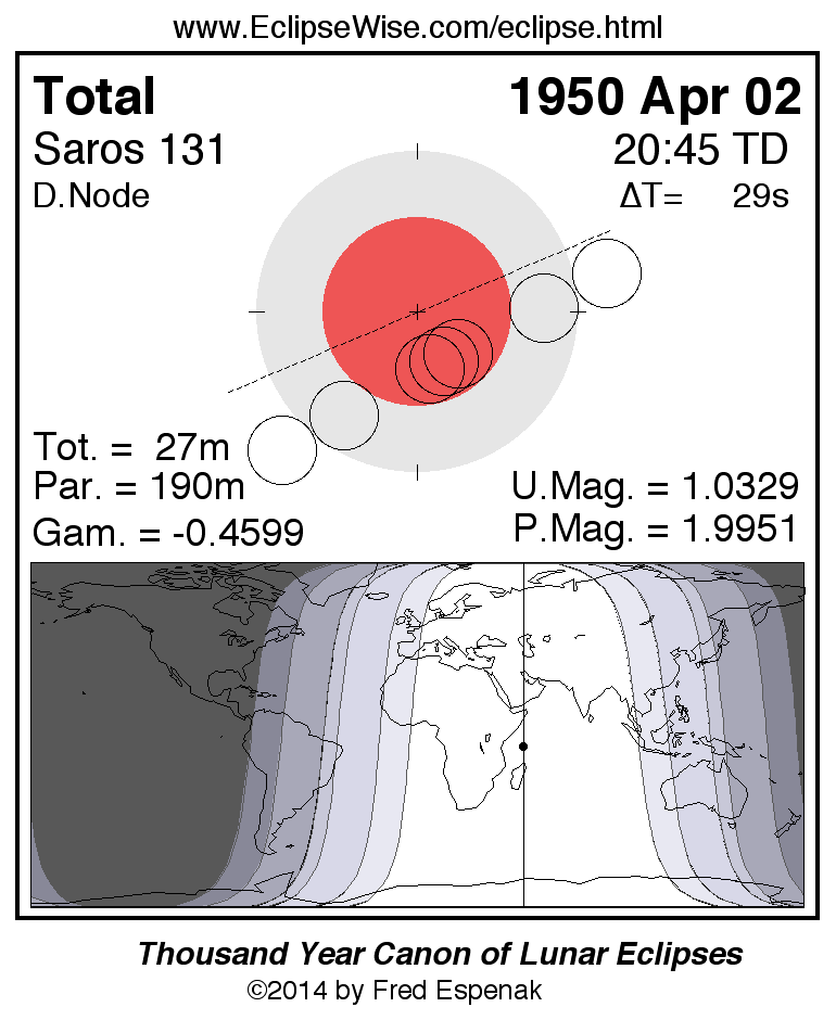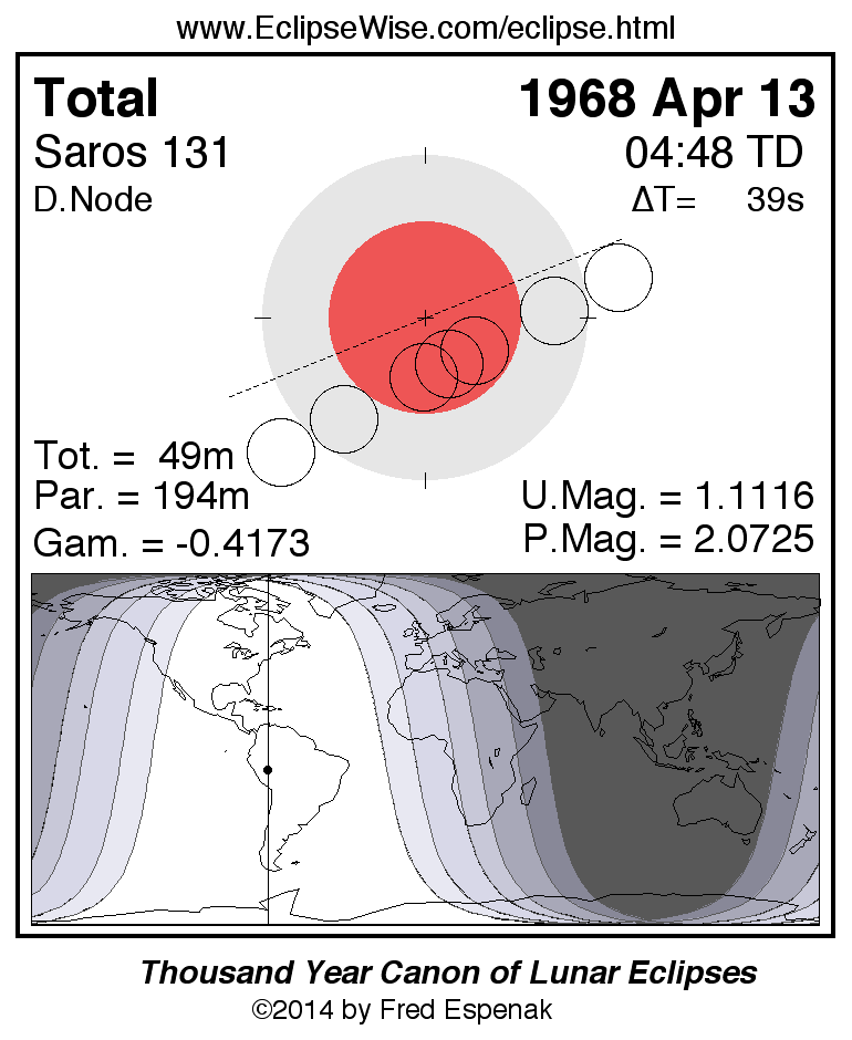A panorama of all lunar eclipses belonging to Saros 131 is presented here. Each figure shows the Moon's path with respect to Earth's penumbral and umbral shadows. Below the path is a map depicting the geographic region of visibility for the eclipse. The date and time are given for the instant of Greatest Eclipse. Every figure serves as a hyperlink to the EclipseWise Prime page for that eclipse with a larger figure and complete details for the eclipse. Visit the Key to Lunar Eclipse Figures for a detailed explanation of these diagrams. Near the bottom of this page are a series of hyperlinks for more on lunar eclipses.