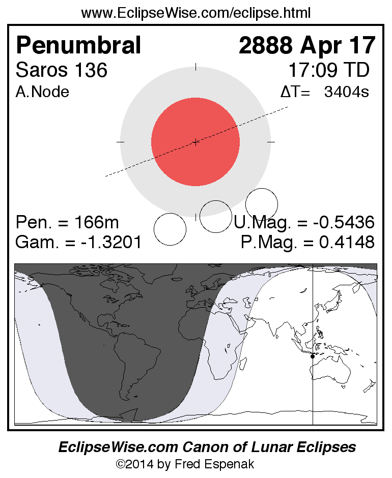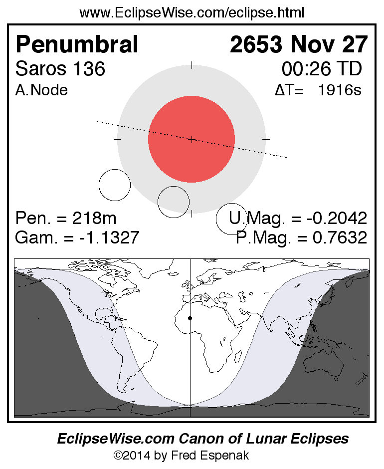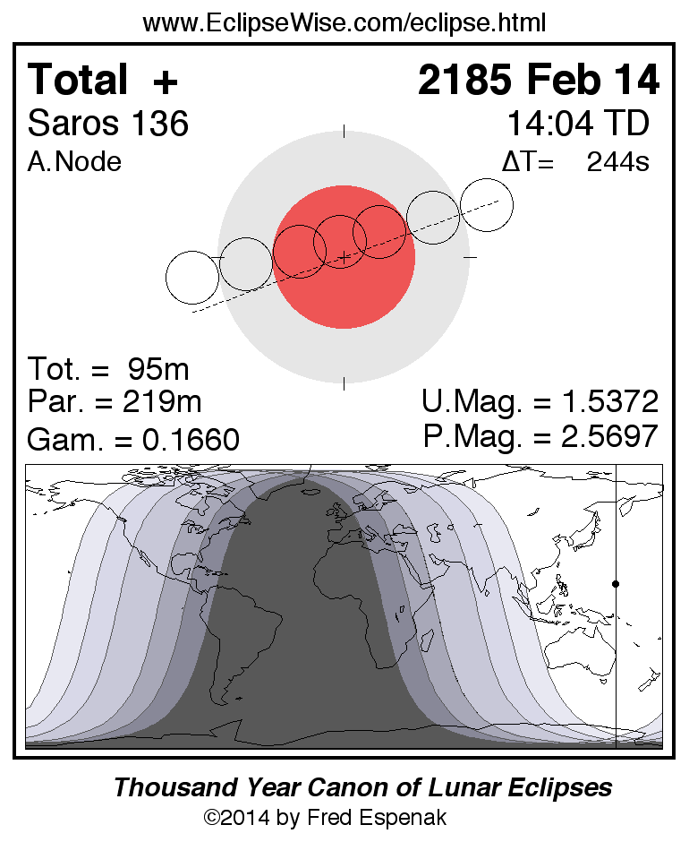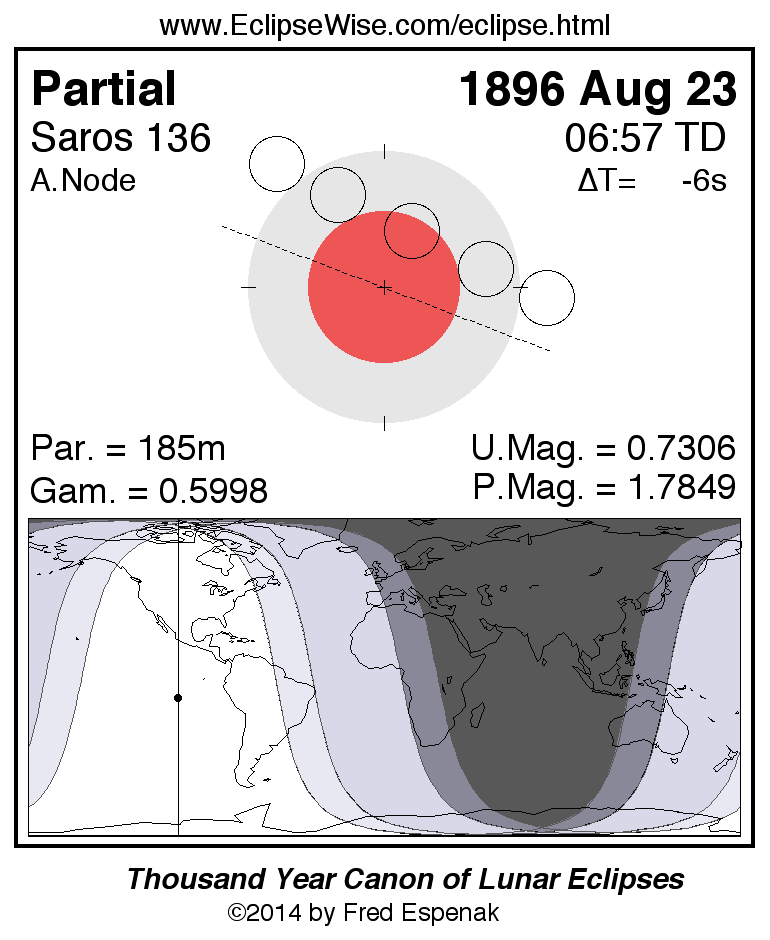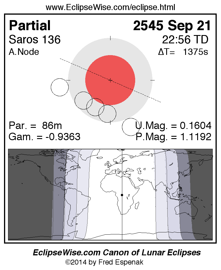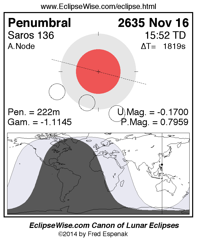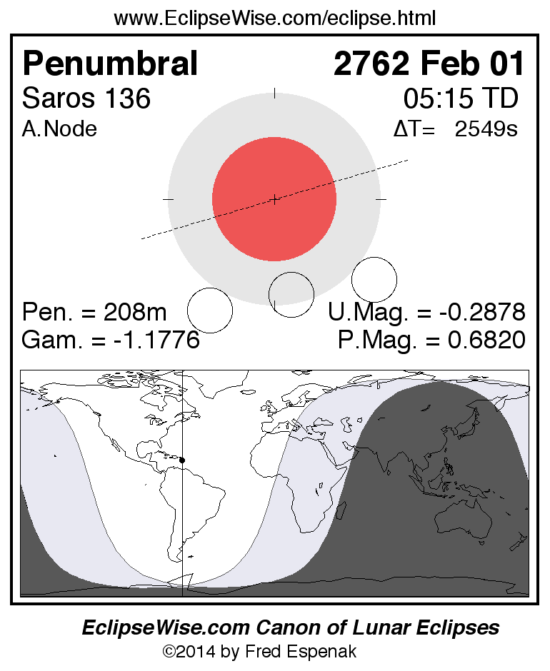 A panorama of all lunar eclipses belonging to Saros 136 is presented here. Each figure shows the Moon's path with respect to Earth's penumbral and umbral shadows. Below the path is a map depicting the geographic region of visibility for the eclipse. The date and time are given for the instant of Greatest Eclipse. Every figure serves as a hyperlink to the EclipseWise Prime page for that eclipse with a larger figure and complete details for the eclipse. Visit the Key to Lunar Eclipse Figures for a detailed explanation of these diagrams. Near the bottom of this page are a series of hyperlinks for more on lunar eclipses.