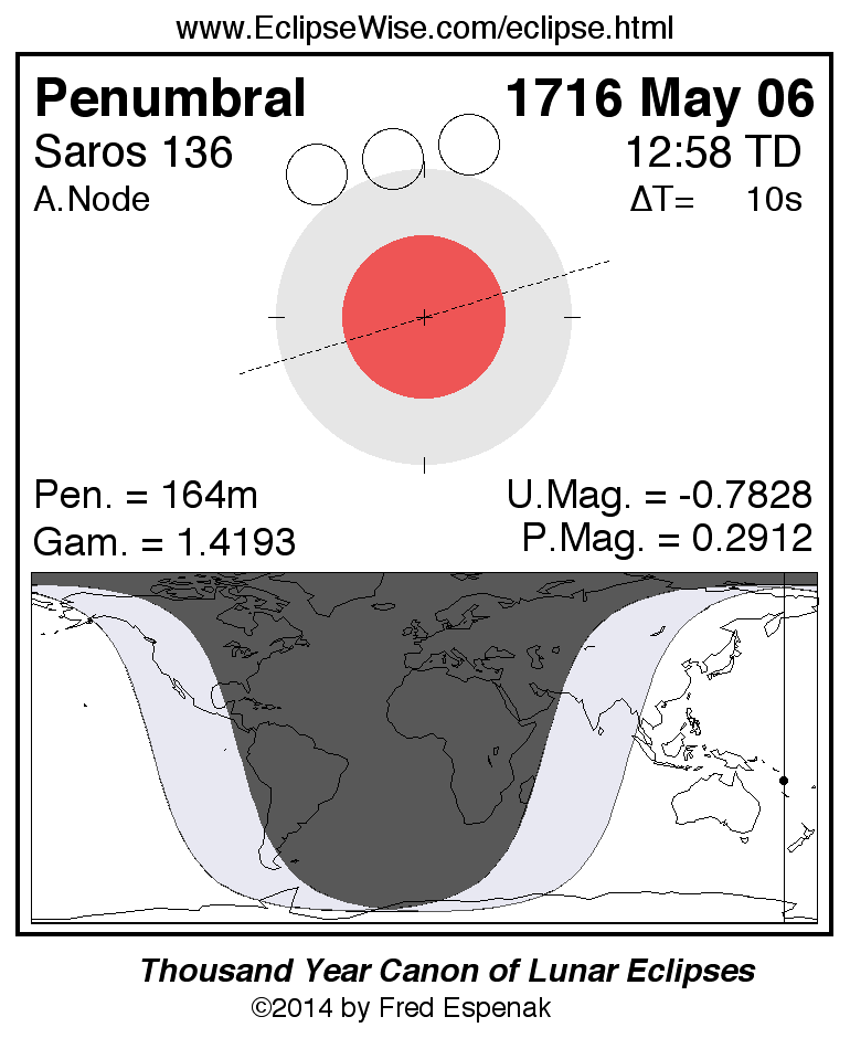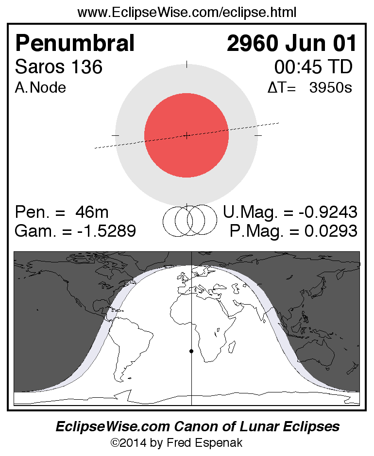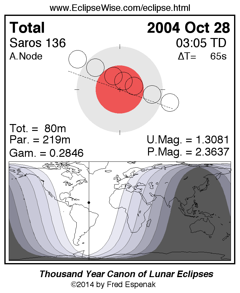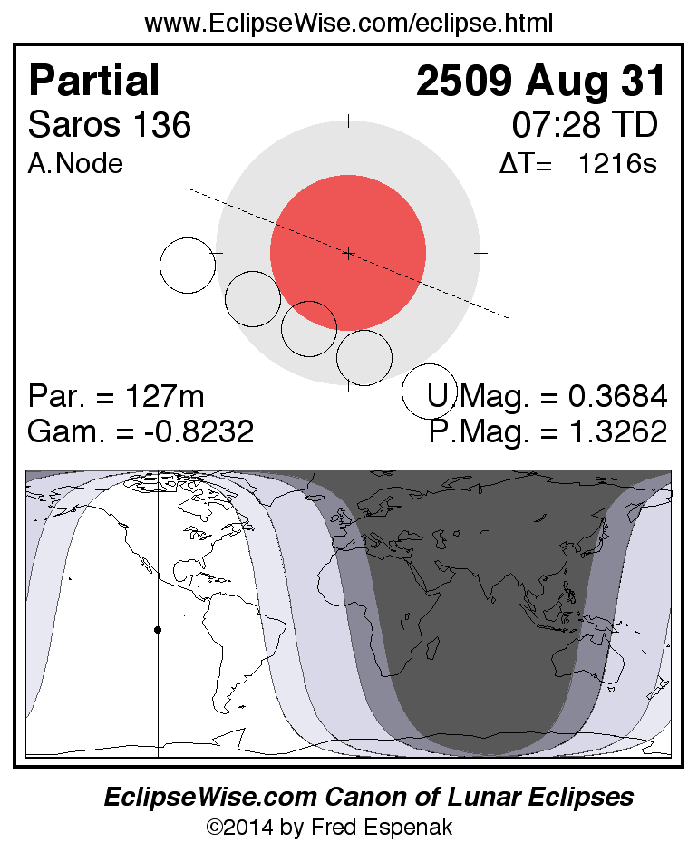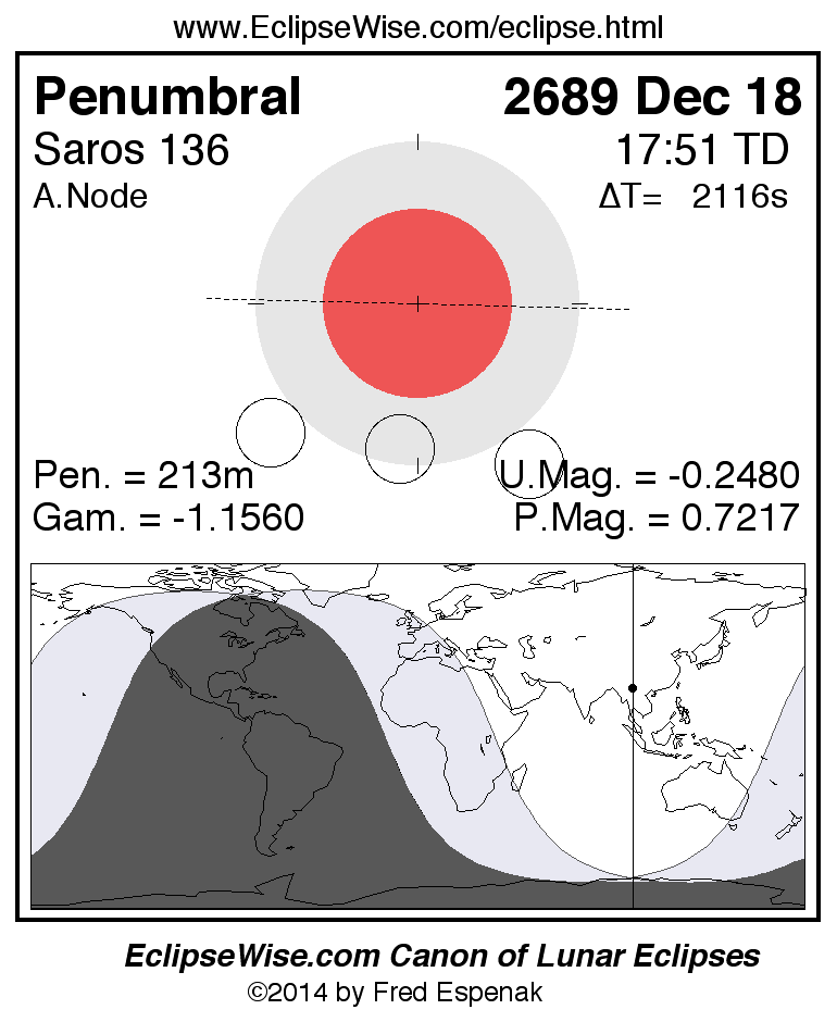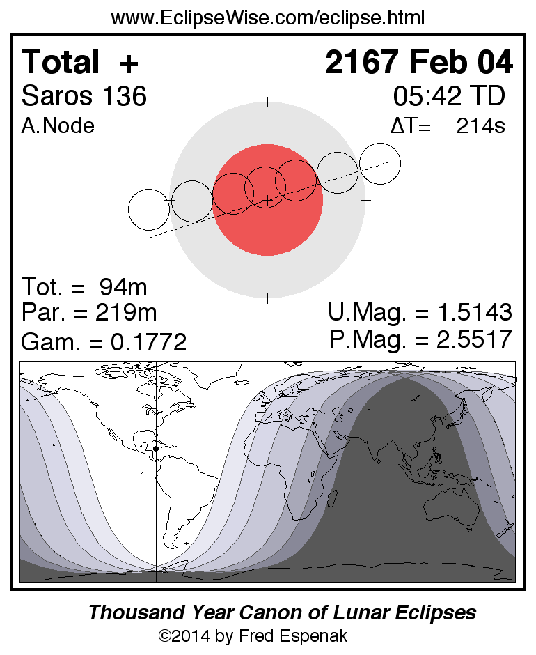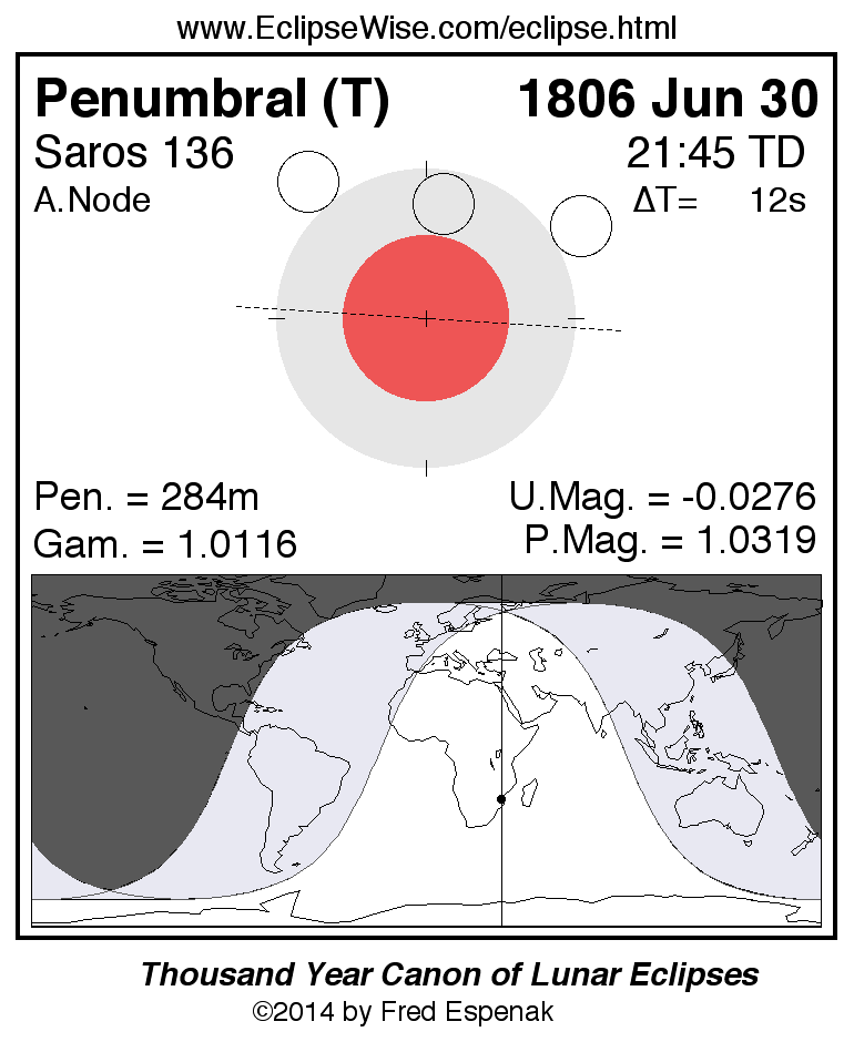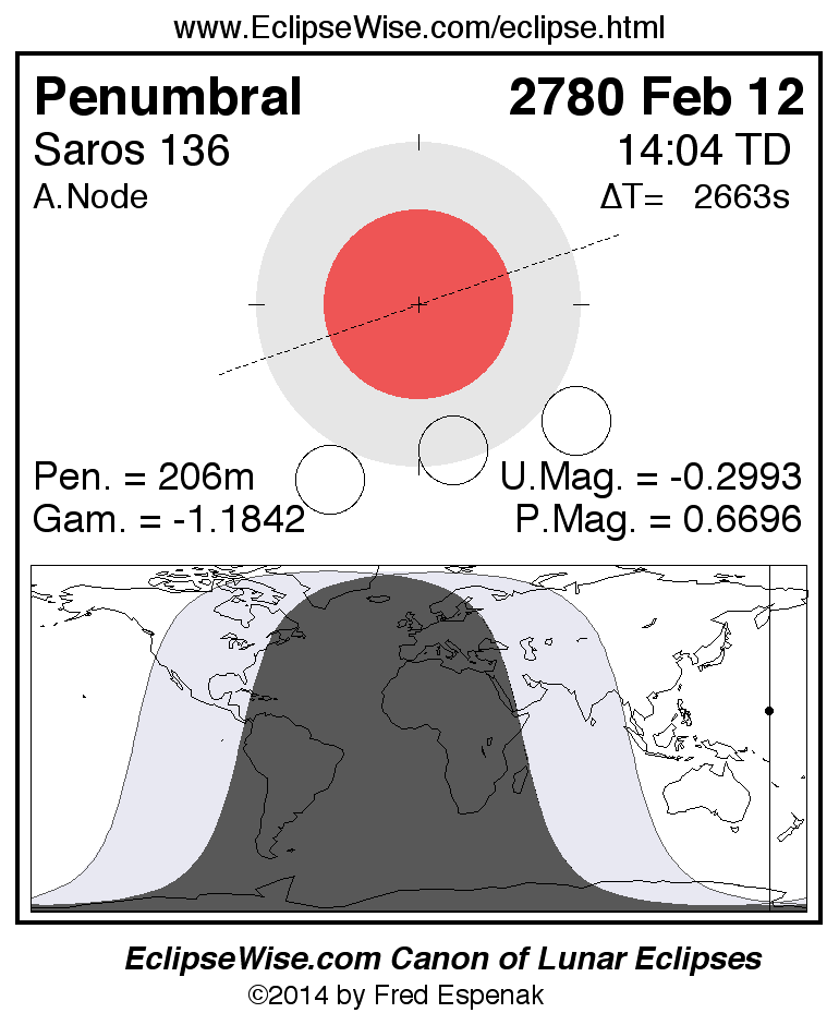 A panorama of all lunar eclipses belonging to Saros 136 is presented here. Each figure shows the Moon's path with respect to Earth's penumbral and umbral shadows. Below the path is a map depicting the geographic region of visibility for the eclipse. The date and time are given for the instant of Greatest Eclipse. Every figure serves as a hyperlink to the EclipseWise Prime page for that eclipse with a larger figure and complete details for the eclipse. Visit the Key to Lunar Eclipse Figures for a detailed explanation of these diagrams. Near the bottom of this page are a series of hyperlinks for more on lunar eclipses.