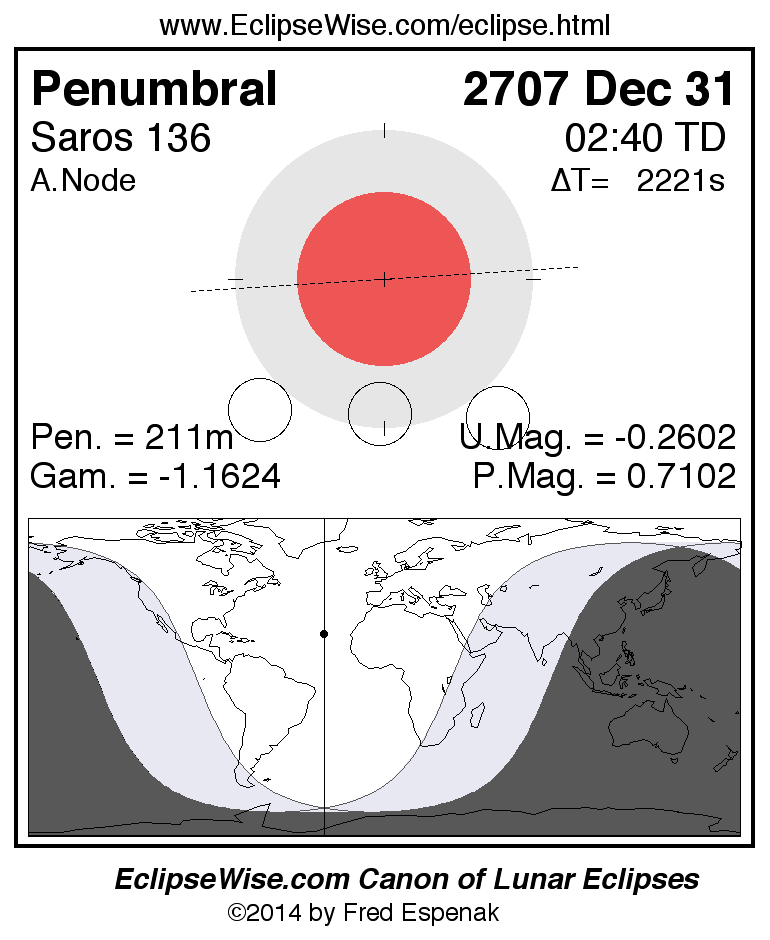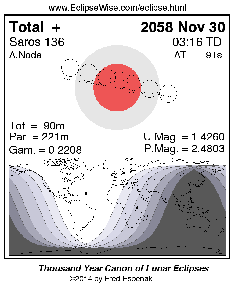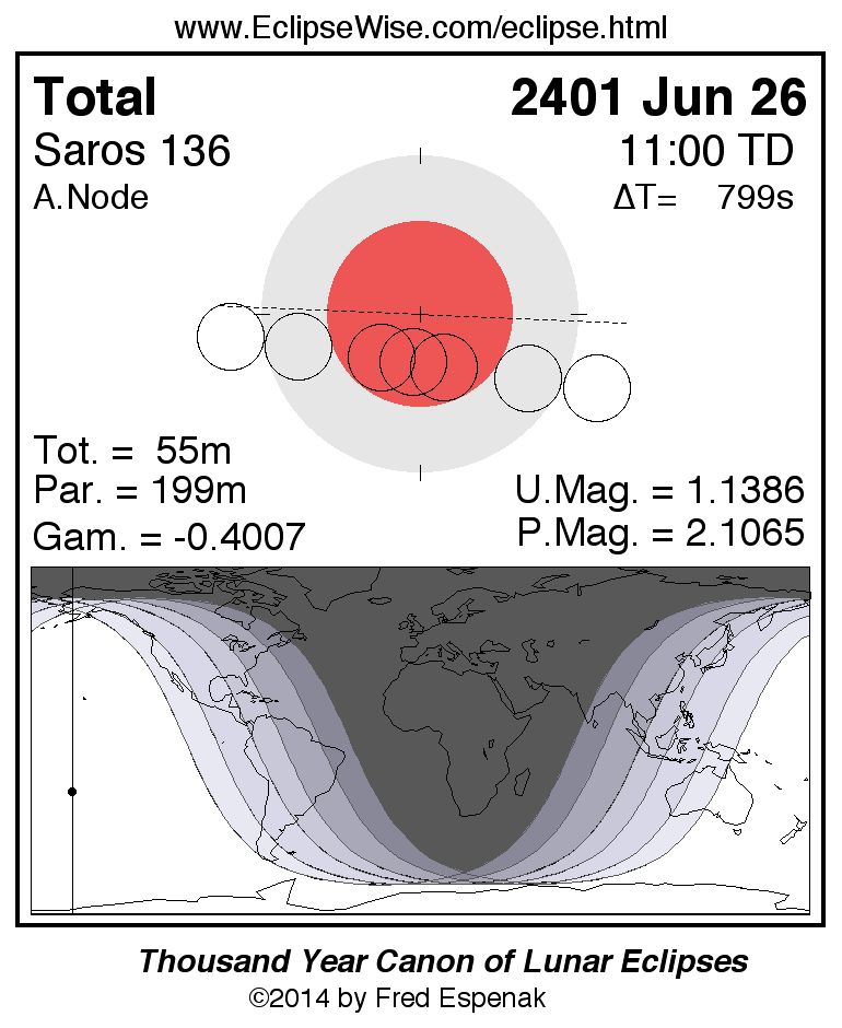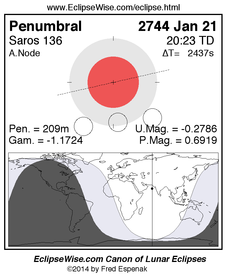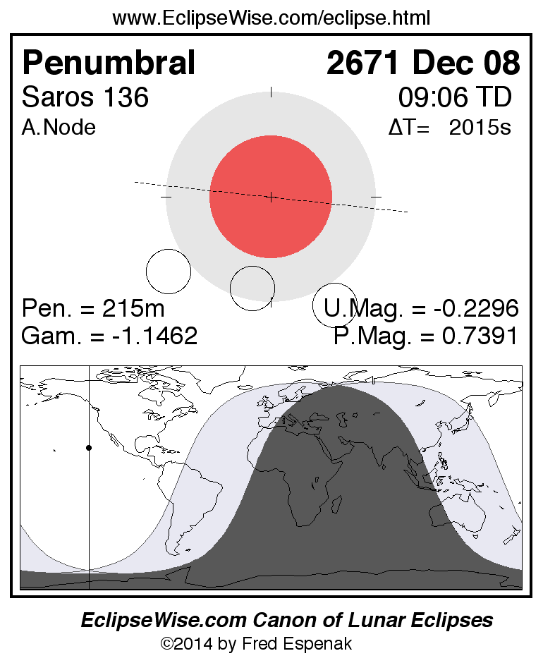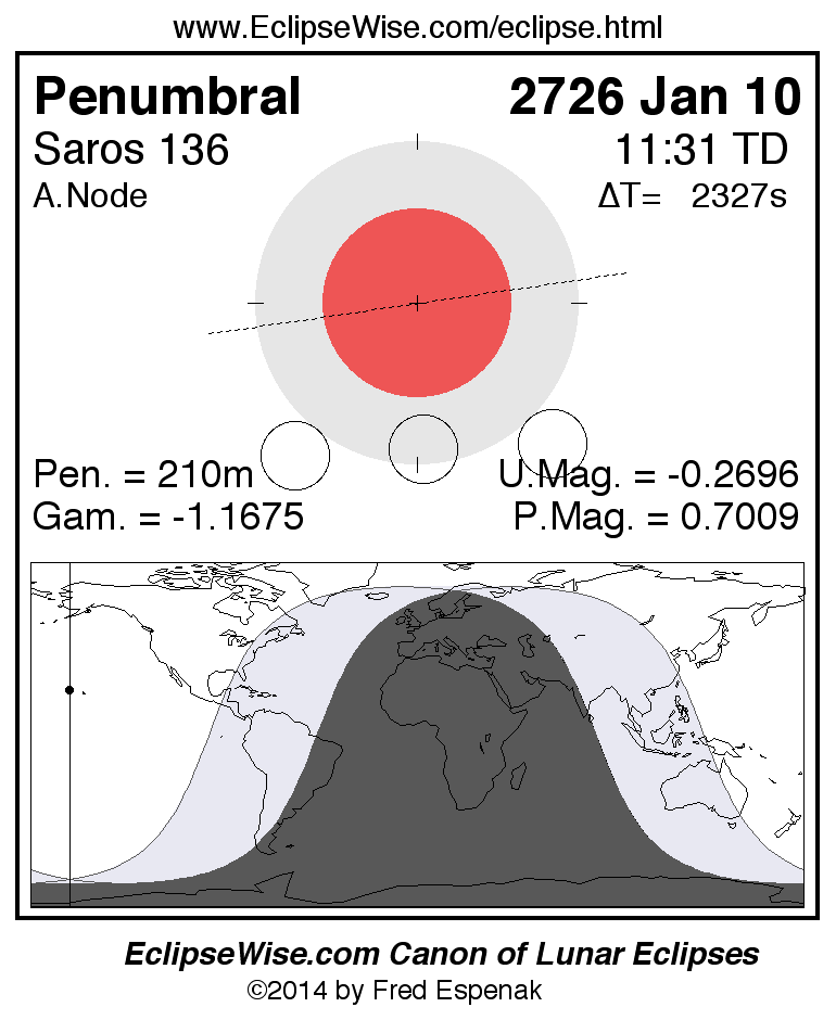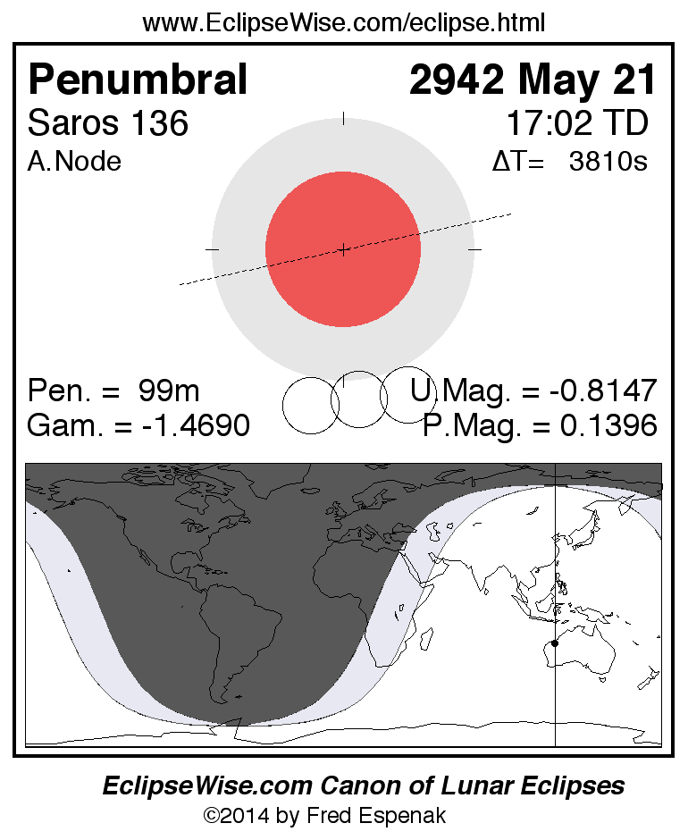 A panorama of all lunar eclipses belonging to Saros 136 is presented here. Each figure shows the Moon's path with respect to Earth's penumbral and umbral shadows. Below the path is a map depicting the geographic region of visibility for the eclipse. The date and time are given for the instant of Greatest Eclipse. Every figure serves as a hyperlink to the EclipseWise Prime page for that eclipse with a larger figure and complete details for the eclipse. Visit the Key to Lunar Eclipse Figures for a detailed explanation of these diagrams. Near the bottom of this page are a series of hyperlinks for more on lunar eclipses.
