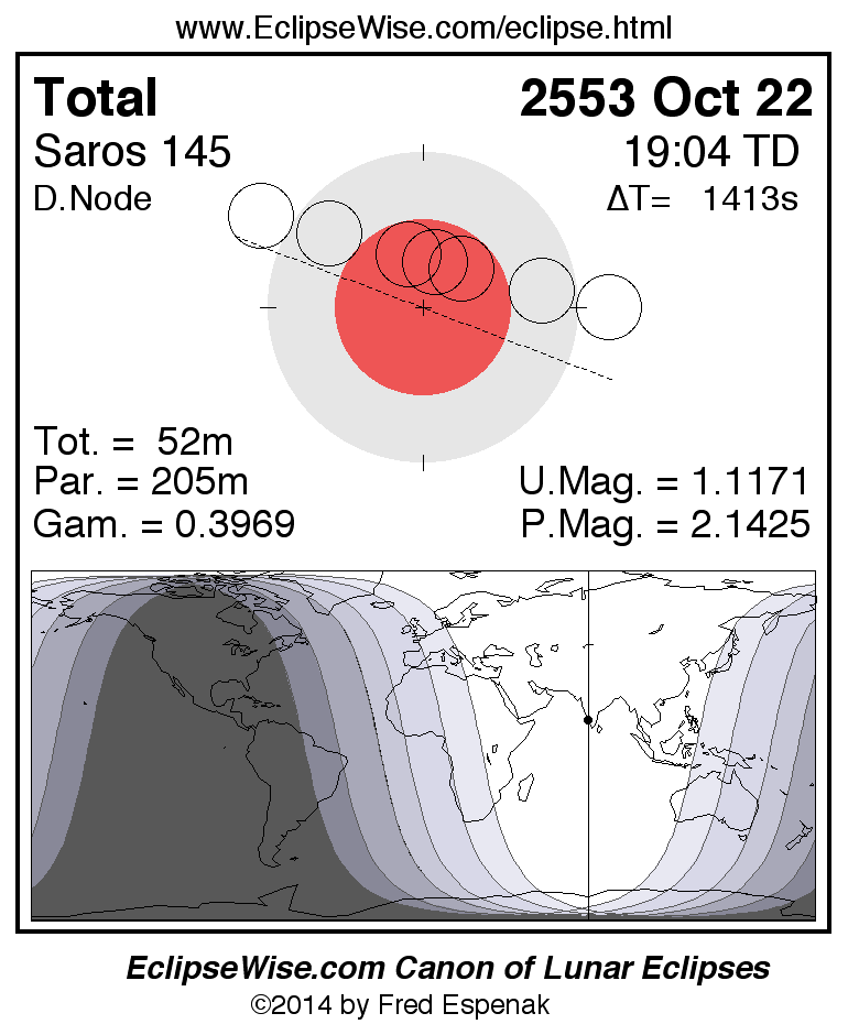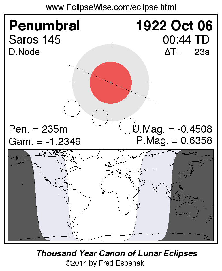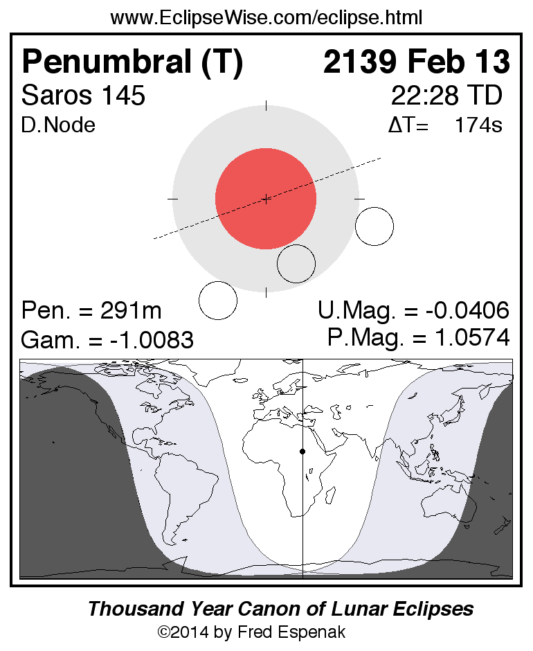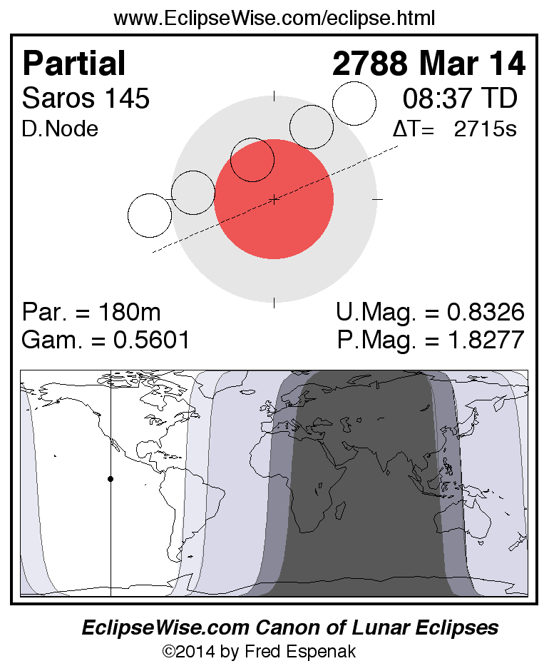 A panorama of all lunar eclipses belonging to Saros 145 is presented here. Each figure shows the Moon's path with respect to Earth's penumbral and umbral shadows. Below the path is a map depicting the geographic region of visibility for the eclipse. The date and time are given for the instant of Greatest Eclipse. Every figure serves as a hyperlink to the EclipseWise Prime page for that eclipse with a larger figure and complete details for the eclipse. Visit the Key to Lunar Eclipse Figures for a detailed explanation of these diagrams. Near the bottom of this page are a series of hyperlinks for more on lunar eclipses.