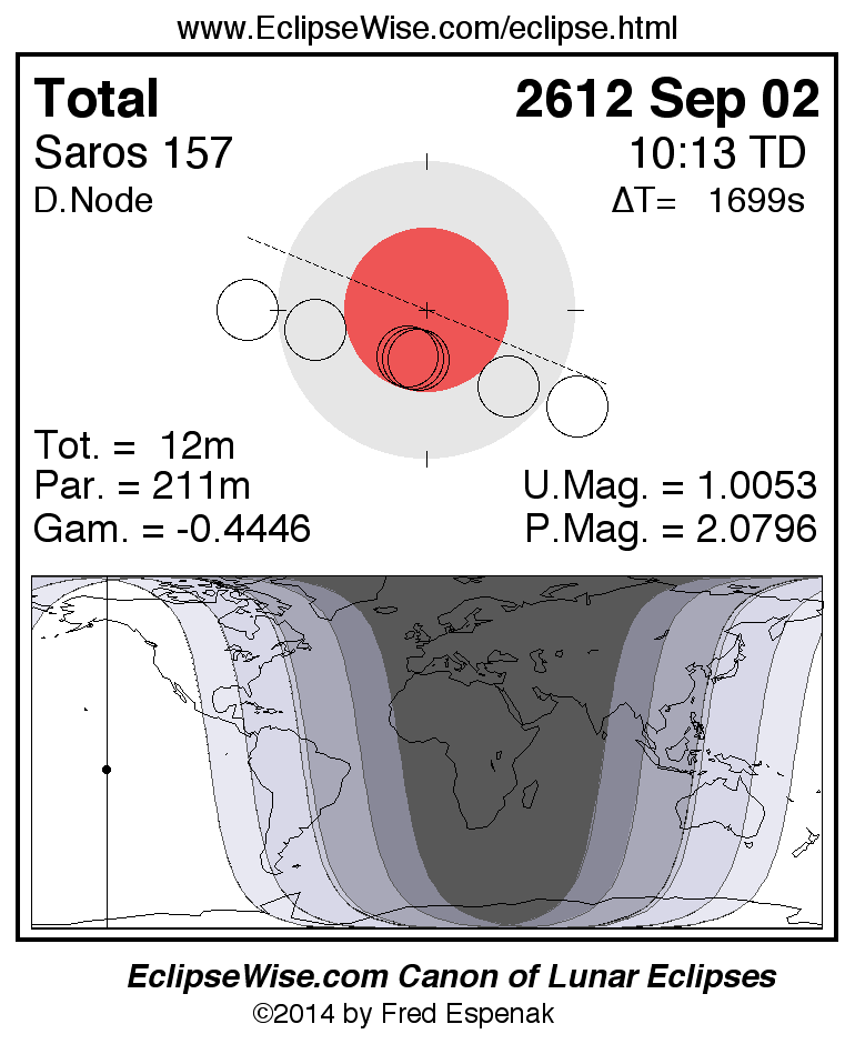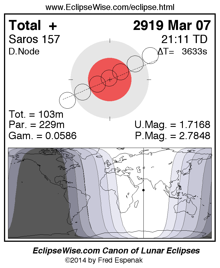 A panorama of all lunar eclipses belonging to Saros 157 is presented here. Each figure shows the Moon's path with respect to Earth's penumbral and umbral shadows. Below the path is a map depicting the geographic region of visibility for the eclipse. The date and time are given for the instant of Greatest Eclipse. Every figure serves as a hyperlink to the EclipseWise Prime page for that eclipse with a larger figure and complete details for the eclipse. Visit the Key to Lunar Eclipse Figures for a detailed explanation of these diagrams. Near the bottom of this page are a series of hyperlinks for more on lunar eclipses.