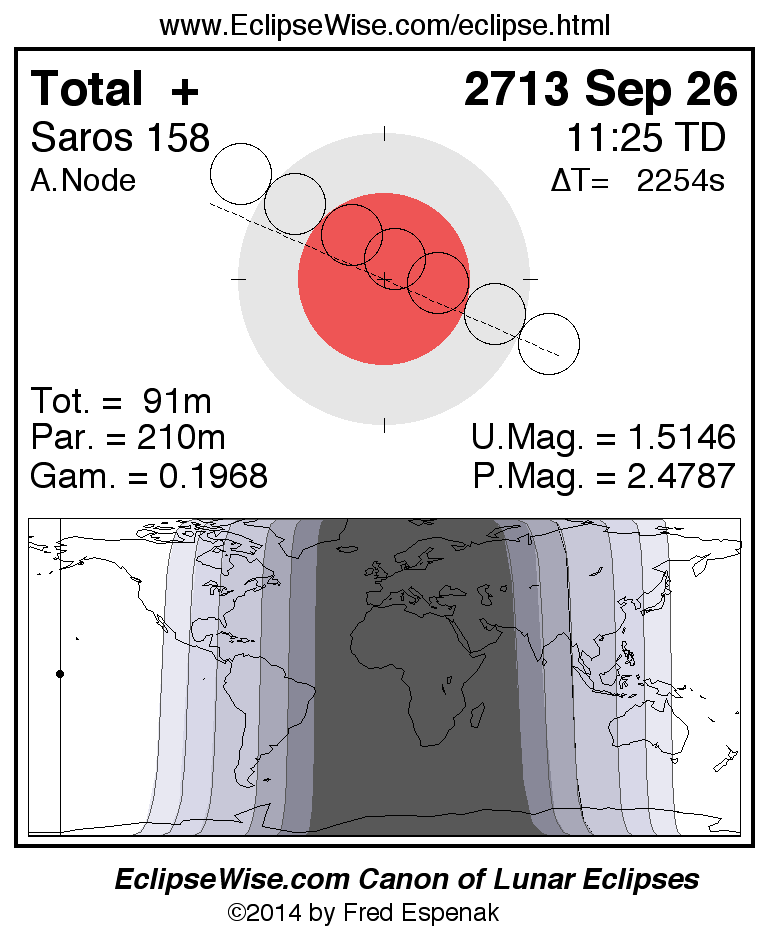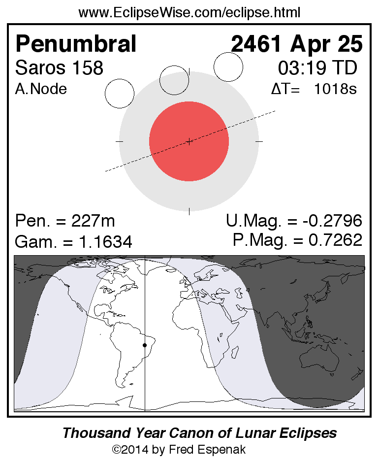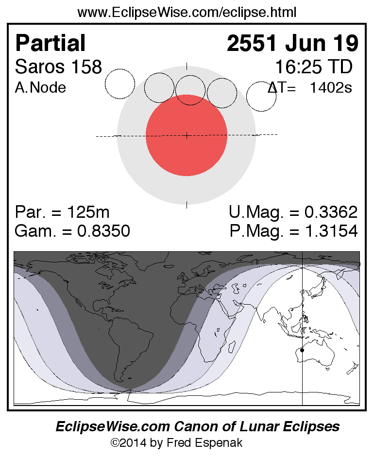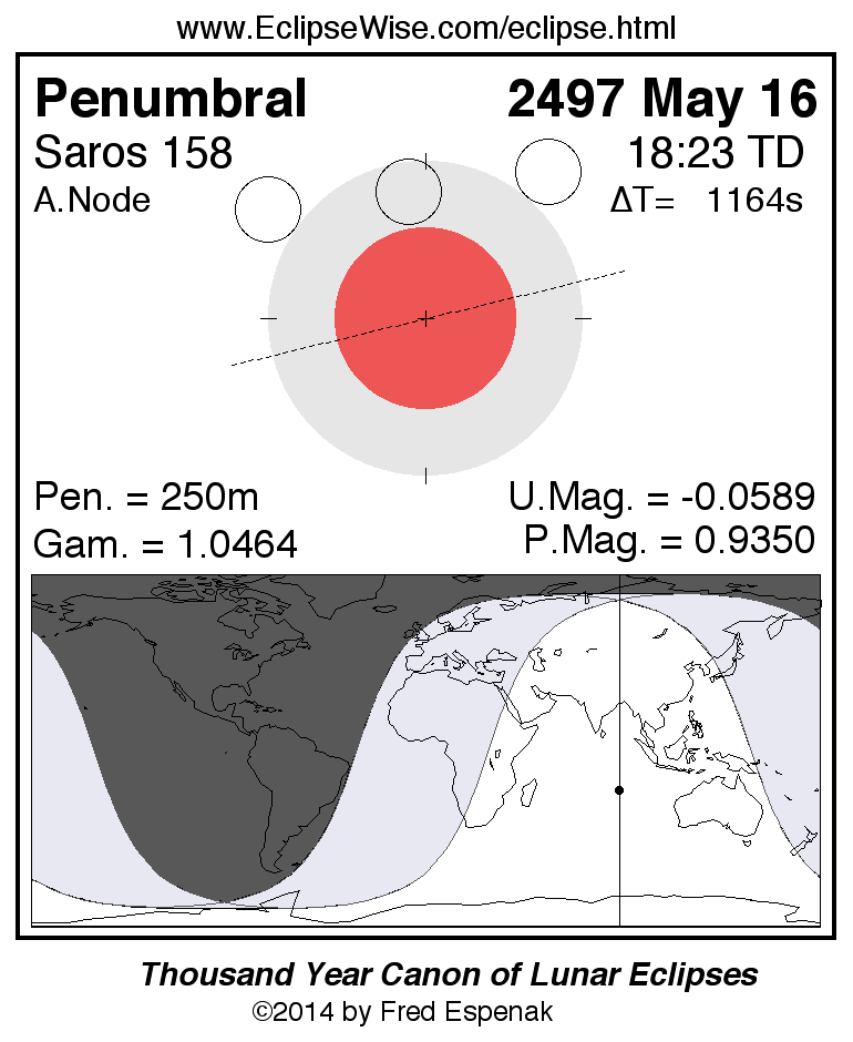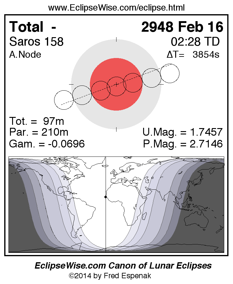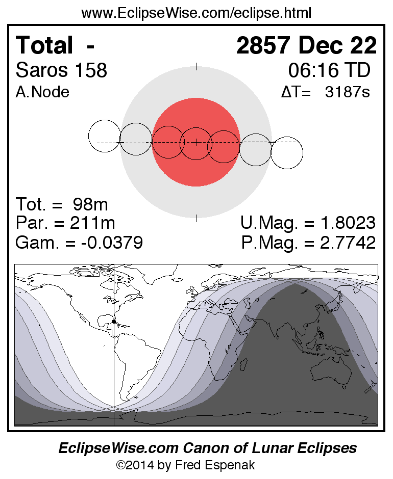 A panorama of all lunar eclipses belonging to Saros 158 is presented here. Each figure shows the Moon's path with respect to Earth's penumbral and umbral shadows. Below the path is a map depicting the geographic region of visibility for the eclipse. The date and time are given for the instant of Greatest Eclipse. Every figure serves as a hyperlink to the EclipseWise Prime page for that eclipse with a larger figure and complete details for the eclipse. Visit the Key to Lunar Eclipse Figures for a detailed explanation of these diagrams. Near the bottom of this page are a series of hyperlinks for more on lunar eclipses.