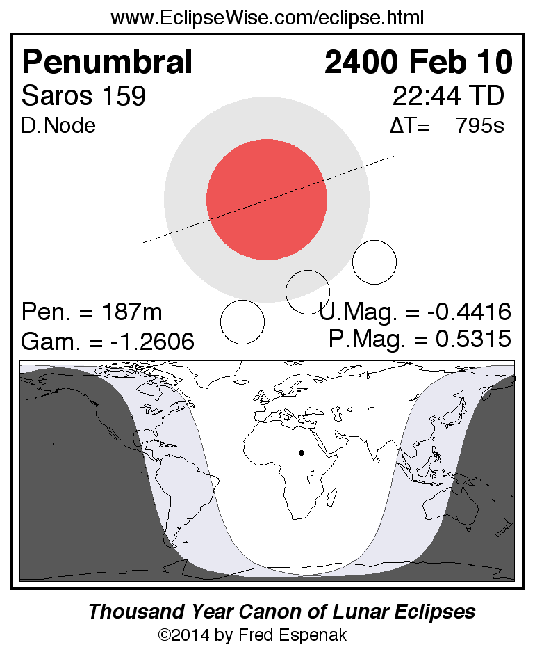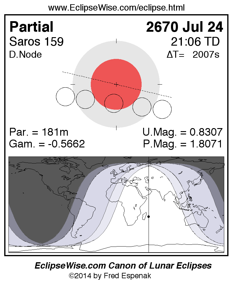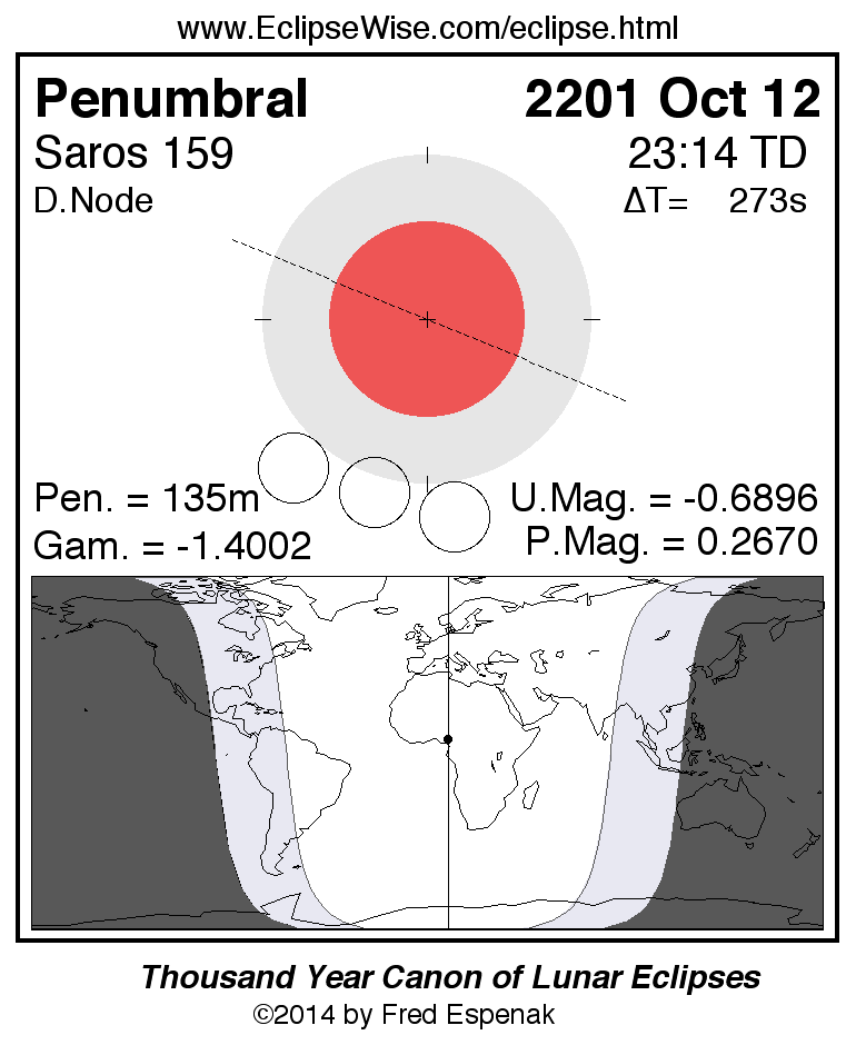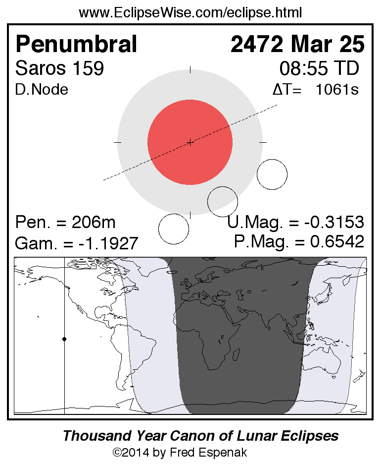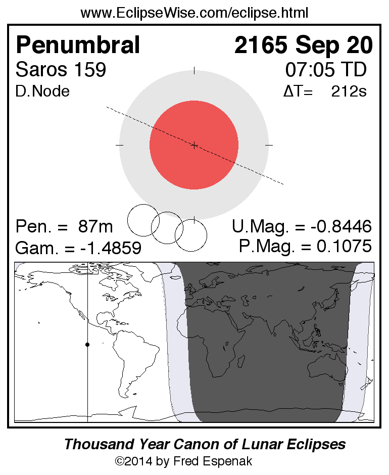 A panorama of all lunar eclipses belonging to Saros 159 is presented here. Each figure shows the Moon's path with respect to Earth's penumbral and umbral shadows. Below the path is a map depicting the geographic region of visibility for the eclipse. The date and time are given for the instant of Greatest Eclipse. Every figure serves as a hyperlink to the EclipseWise Prime page for that eclipse with a larger figure and complete details for the eclipse. Visit the Key to Lunar Eclipse Figures for a detailed explanation of these diagrams. Near the bottom of this page are a series of hyperlinks for more on lunar eclipses.