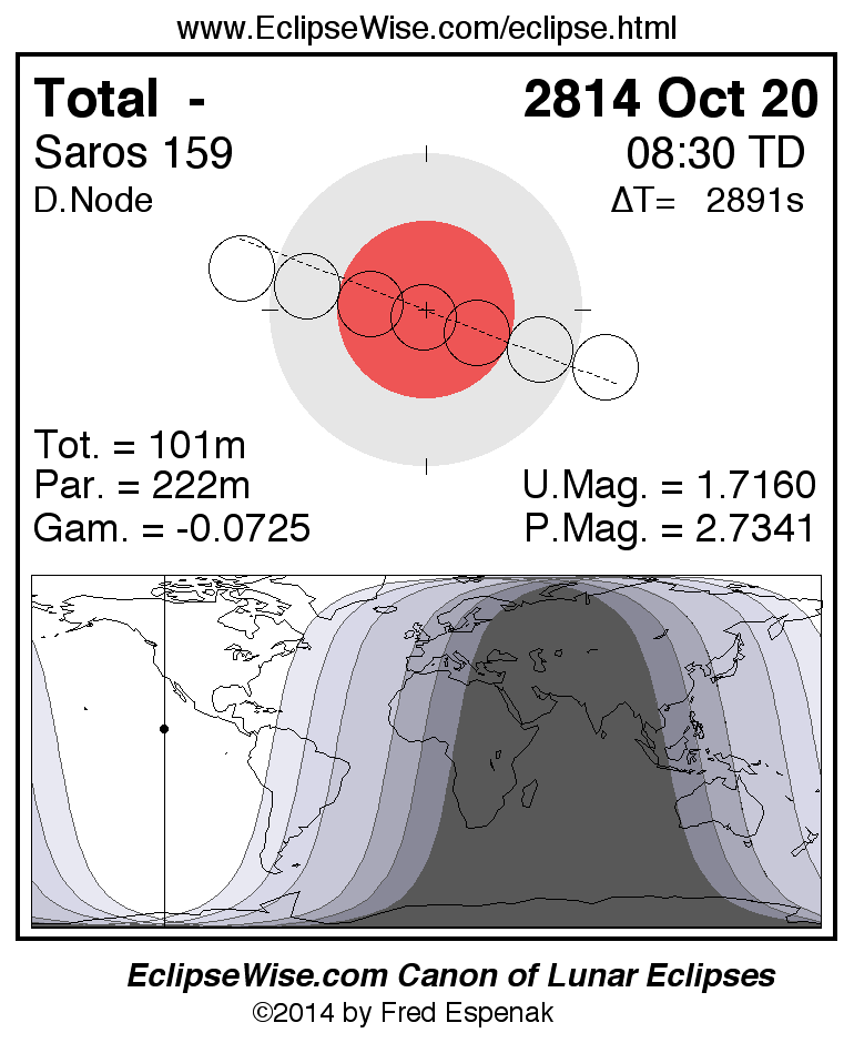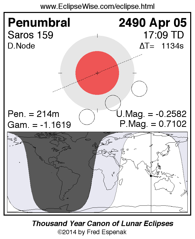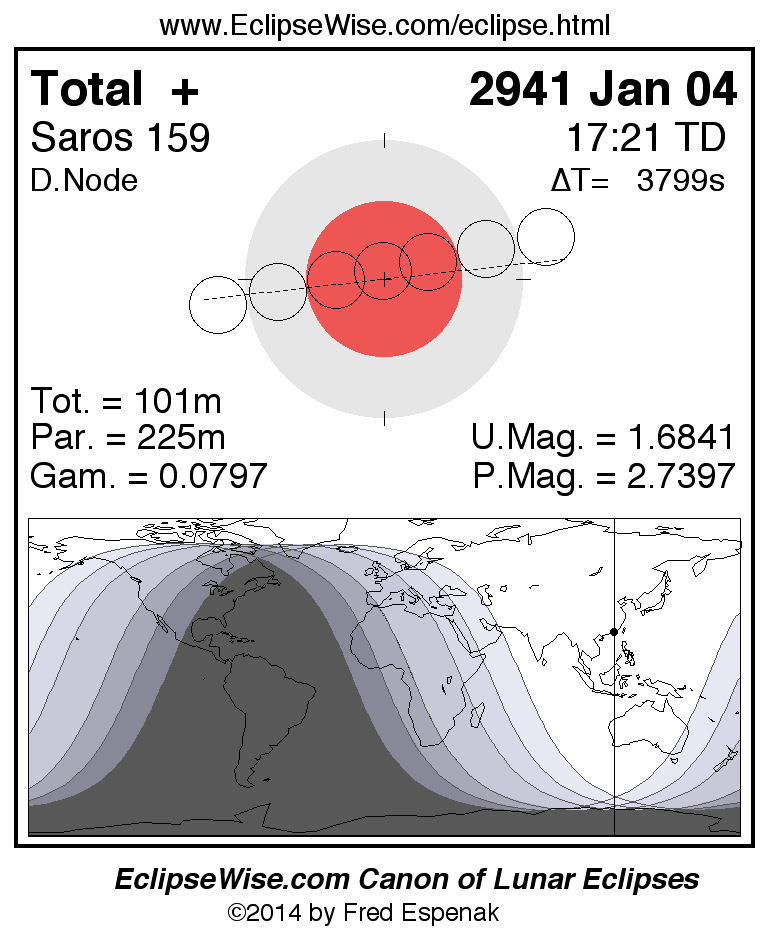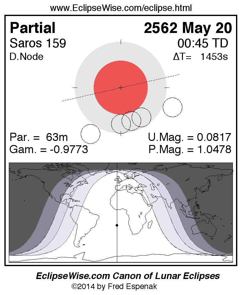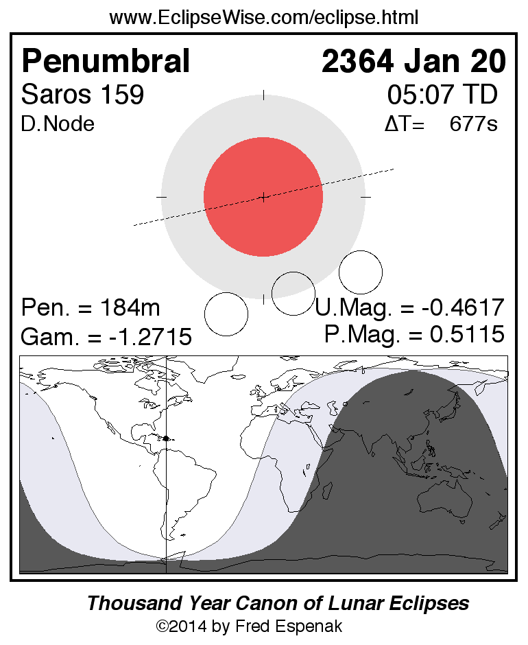 A panorama of all lunar eclipses belonging to Saros 159 is presented here. Each figure shows the Moon's path with respect to Earth's penumbral and umbral shadows. Below the path is a map depicting the geographic region of visibility for the eclipse. The date and time are given for the instant of Greatest Eclipse. Every figure serves as a hyperlink to the EclipseWise Prime page for that eclipse with a larger figure and complete details for the eclipse. Visit the Key to Lunar Eclipse Figures for a detailed explanation of these diagrams. Near the bottom of this page are a series of hyperlinks for more on lunar eclipses.