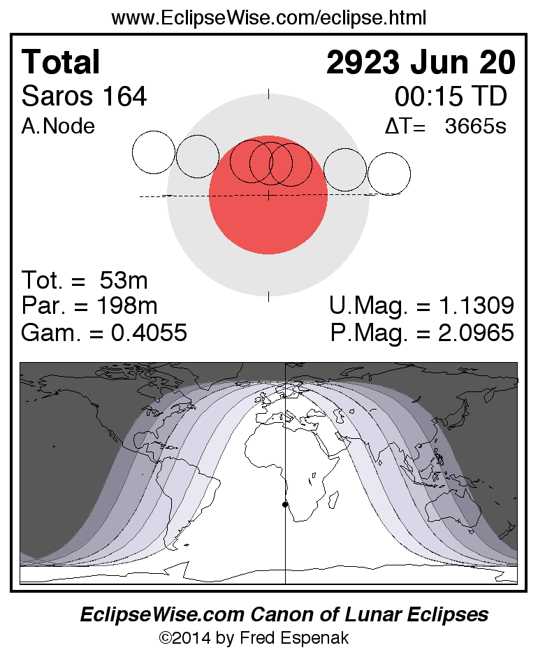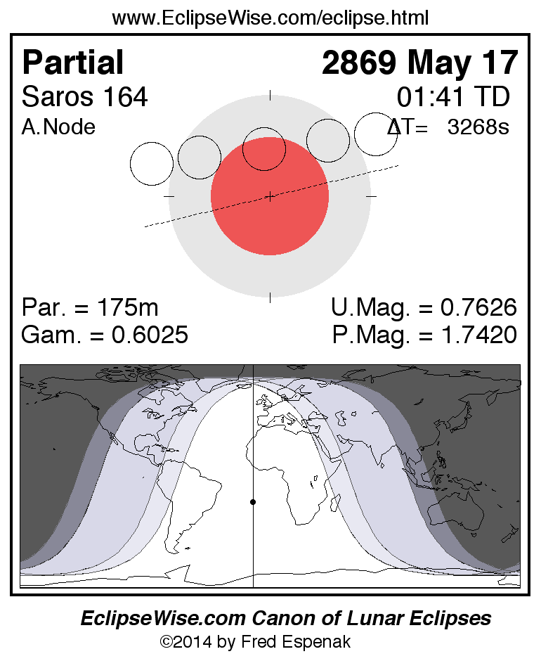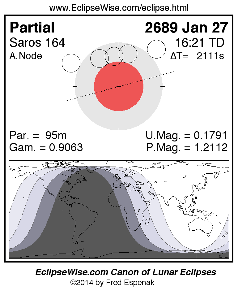 A panorama of all lunar eclipses belonging to Saros 164 is presented here. Each figure shows the Moon's path with respect to Earth's penumbral and umbral shadows. Below the path is a map depicting the geographic region of visibility for the eclipse. The date and time are given for the instant of Greatest Eclipse. Every figure serves as a hyperlink to the EclipseWise Prime page for that eclipse with a larger figure and complete details for the eclipse. Visit the Key to Lunar Eclipse Figures for a detailed explanation of these diagrams. Near the bottom of this page are a series of hyperlinks for more on lunar eclipses.