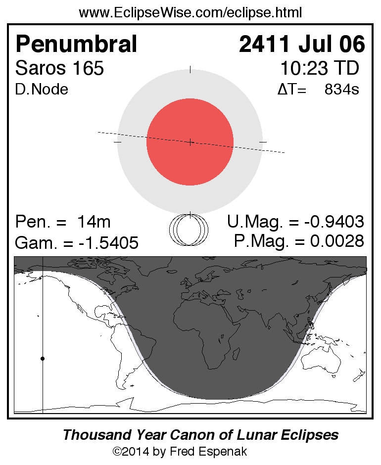 A panorama of all lunar eclipses belonging to Saros 165 is presented here. Each figure shows the Moon's path with respect to Earth's penumbral and umbral shadows. Below the path is a map depicting the geographic region of visibility for the eclipse. The date and time are given for the instant of Greatest Eclipse. Every figure serves as a hyperlink to the EclipseWise Prime page for that eclipse with a larger figure and complete details for the eclipse. Visit the Key to Lunar Eclipse Figures for a detailed explanation of these diagrams. Near the bottom of this page are a series of hyperlinks for more on lunar eclipses.