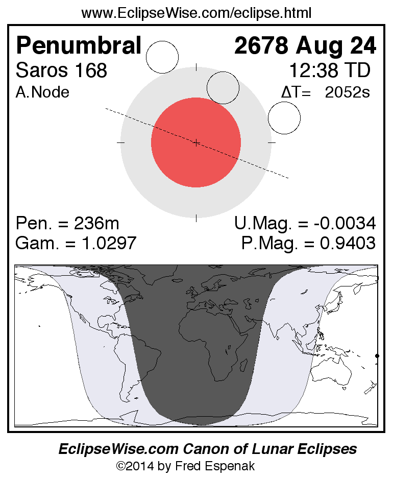A panorama of all lunar eclipses belonging to Saros 168 is presented here. Each figure shows the Moon's path with respect to Earth's penumbral and umbral shadows. Below the path is a map depicting the geographic region of visibility for the eclipse. The date and time are given for the instant of Greatest Eclipse. Every figure serves as a hyperlink to the EclipseWise Prime page for that eclipse with a larger figure and complete details for the eclipse. Visit the Key to Lunar Eclipse Figures for a detailed explanation of these diagrams. Near the bottom of this page are a series of hyperlinks for more on lunar eclipses.