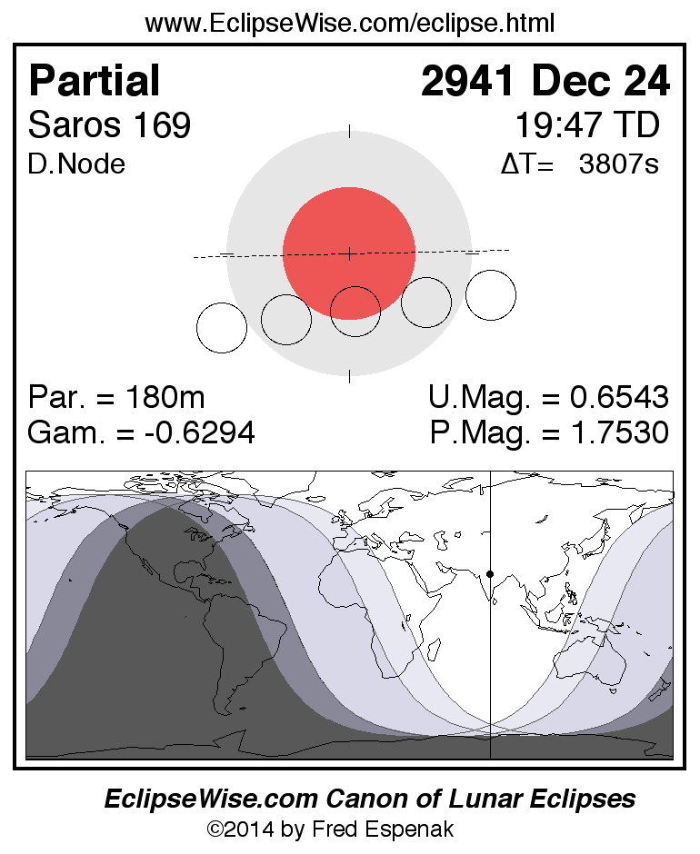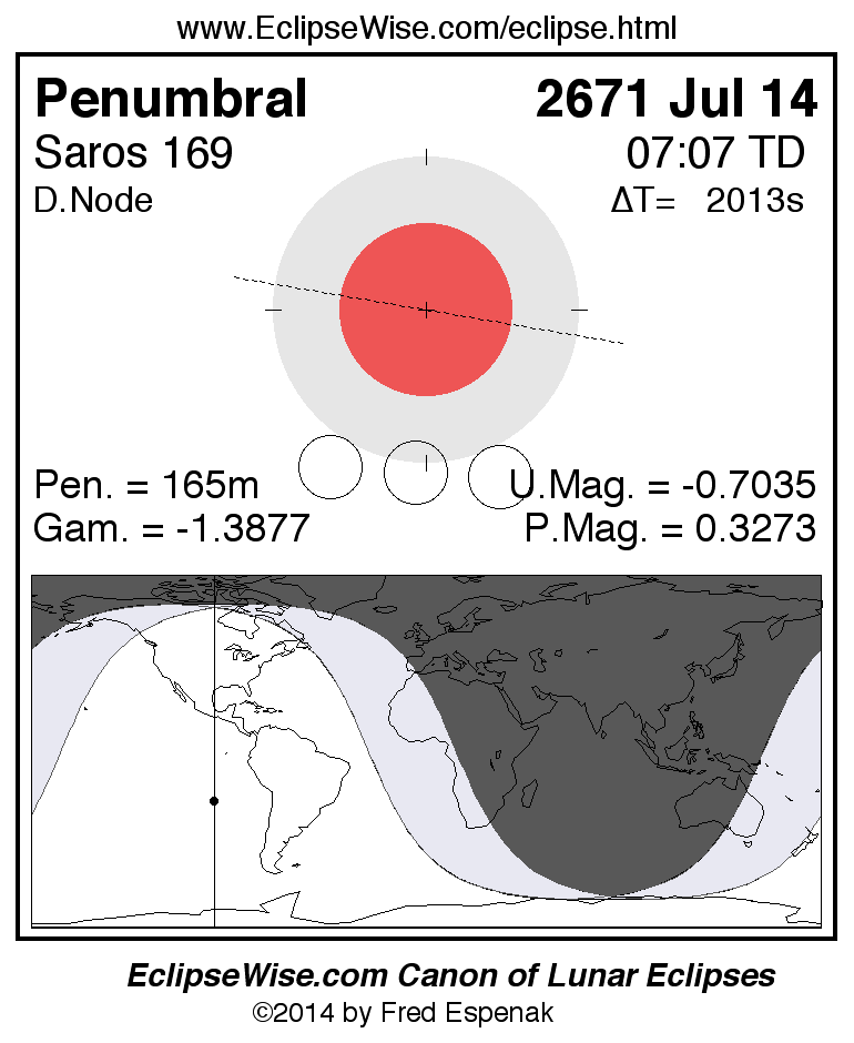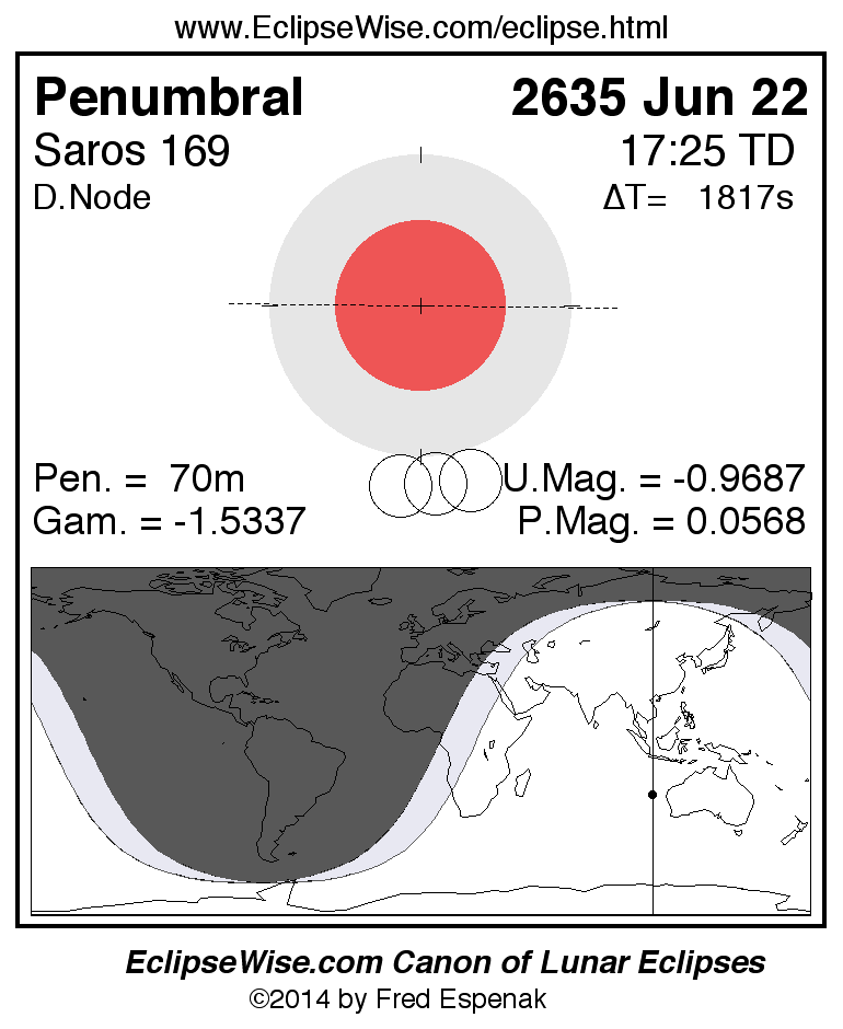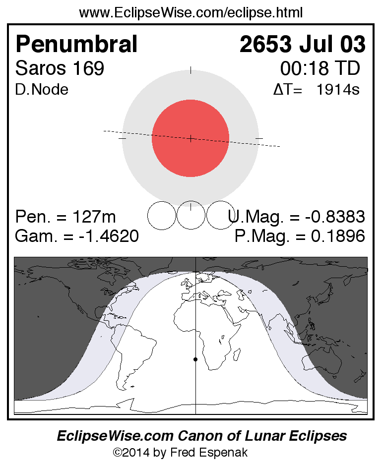 A panorama of all lunar eclipses belonging to Saros 169 is presented here. Each figure shows the Moon's path with respect to Earth's penumbral and umbral shadows. Below the path is a map depicting the geographic region of visibility for the eclipse. The date and time are given for the instant of Greatest Eclipse. Every figure serves as a hyperlink to the EclipseWise Prime page for that eclipse with a larger figure and complete details for the eclipse. Visit the Key to Lunar Eclipse Figures for a detailed explanation of these diagrams. Near the bottom of this page are a series of hyperlinks for more on lunar eclipses.