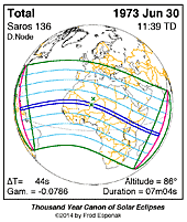| 1973 Jun 30 | 11:38:41 | Total | 136 | 1.079 | 07m04s | e South America, s Europe, Africa, Mid East