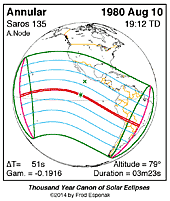 | 1980 Aug 10 | 19:12:21 | Annular | 135 | 0.973 | 03m23s | sw North America, C. & South America