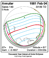 | 1981 Feb 04 | 22:09:24 | Annular | 140 | 0.994 | 00m33s | Australia, New Zealand, Antarctica, w South America