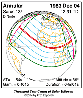 | 1983 Dec 04 | 12:31:15 | Annular | 132 | 0.967 | 04m01s | ns South America, Africa, s Europe