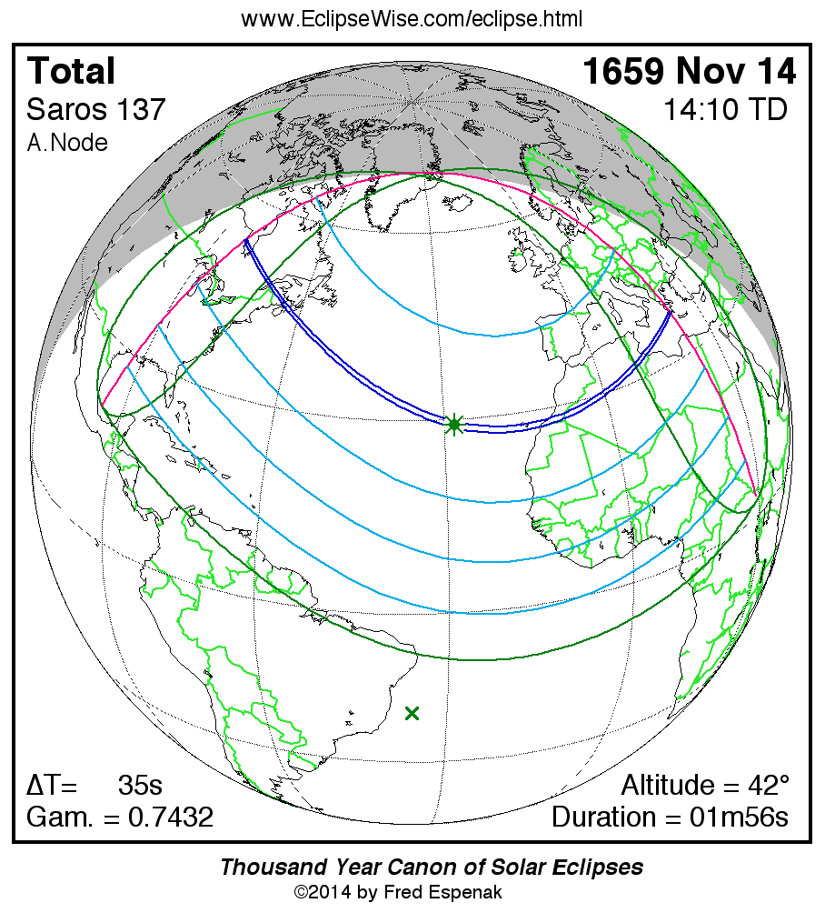 - Orthographic Map: Total Solar Eclipse of 1659 Nov 14 - global map of eclipse visibility