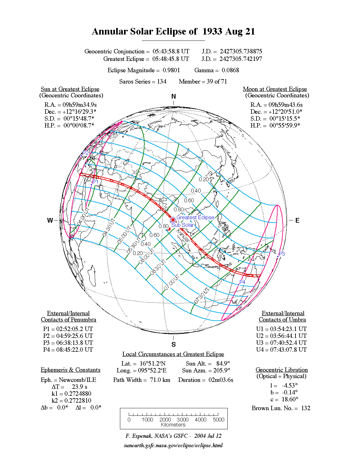 - Path Table: Annular Solar Eclipse of 1933 Aug 21 - coordinates of the central line and path limits