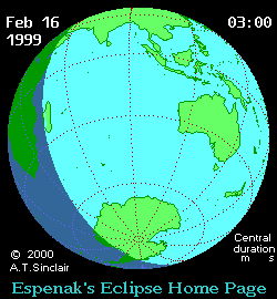 - Animated Map: Annular Solar Eclipse of 1999 Feb 16 - animated map of the Moon's shadows across Earth