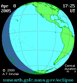 - Animated Map: Hybrid Solar Eclipse of 2005 Apr 08 - animated map of the Moon's shadows across Earth