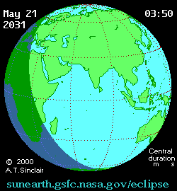 - Animated Map: Annular Solar Eclipse of 2031 May 21 - animated map of the Moon's shadows across Earth