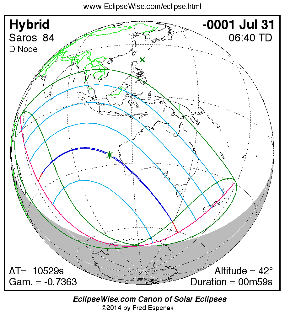 - Orthographic Map: Hybrid Solar Eclipse of -0001 Jul 31 - global map of eclipse visibility