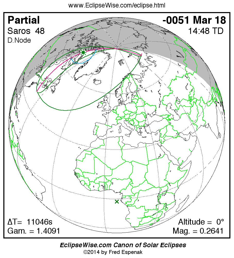 The instant of greatest eclipse takes place on -0051 Mar 18 at 14:48:05 TD (11:44:00 UT1).