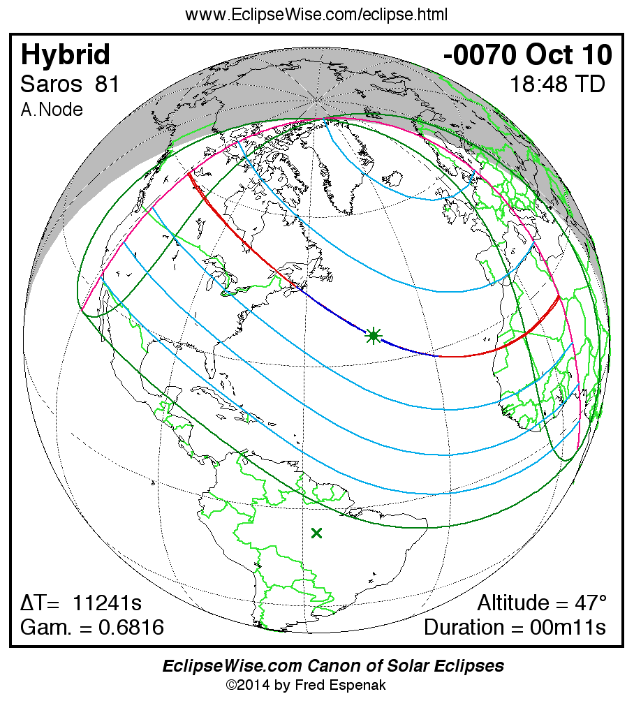 The solar eclipse of -0070 Oct 10 is one of the rare hybrid solar eclipses. In this particular case the eclipse path starts out as annular. Further down the track it changes to total and then back to annular before the path ends. It is a very short hybrid eclipse with a duration at greatest eclipse of 00m11s. The eclipse magnitude is 1.0020, while Gamma has a value of 0.6817.