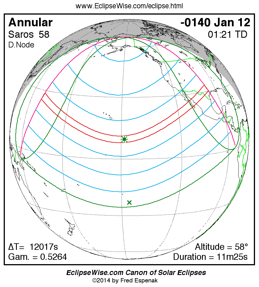 - Path Table: Annular Solar Eclipse of -0140 Jan 13 - coordinates of the central line and path limits
