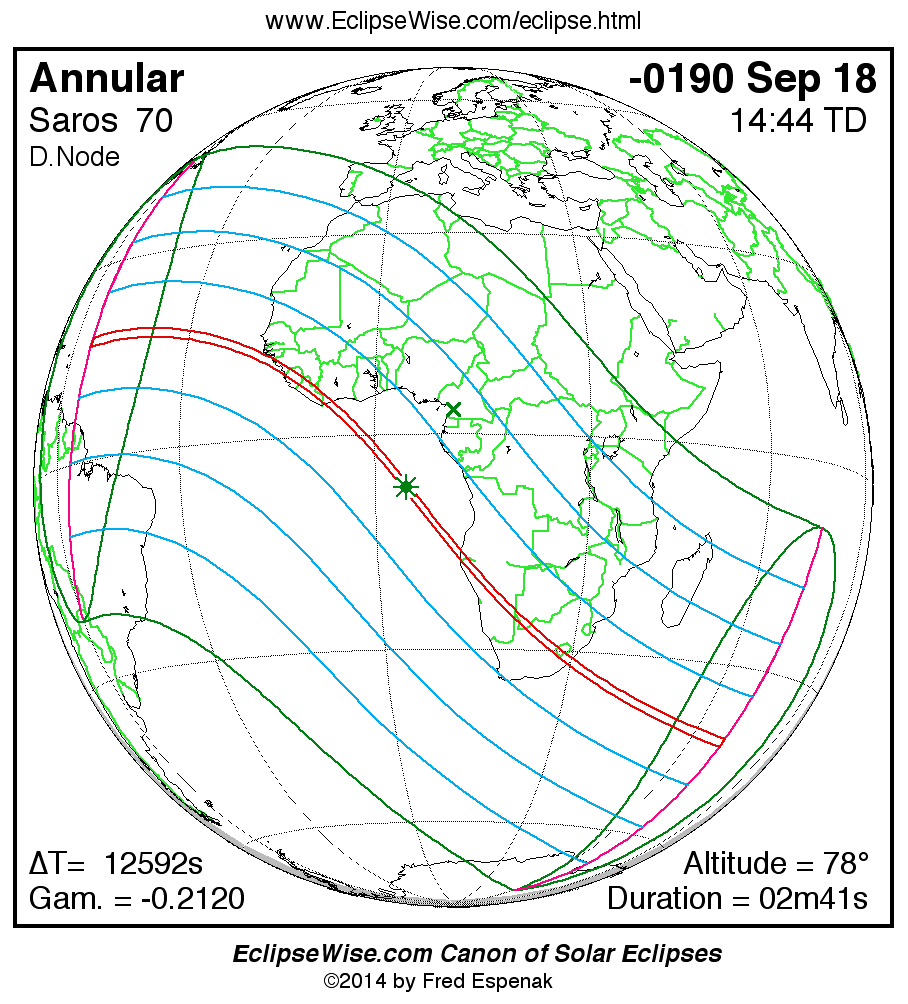 - Path Table: Annular Solar Eclipse of -0190 Sep 18 - coordinates of the central line and path limits